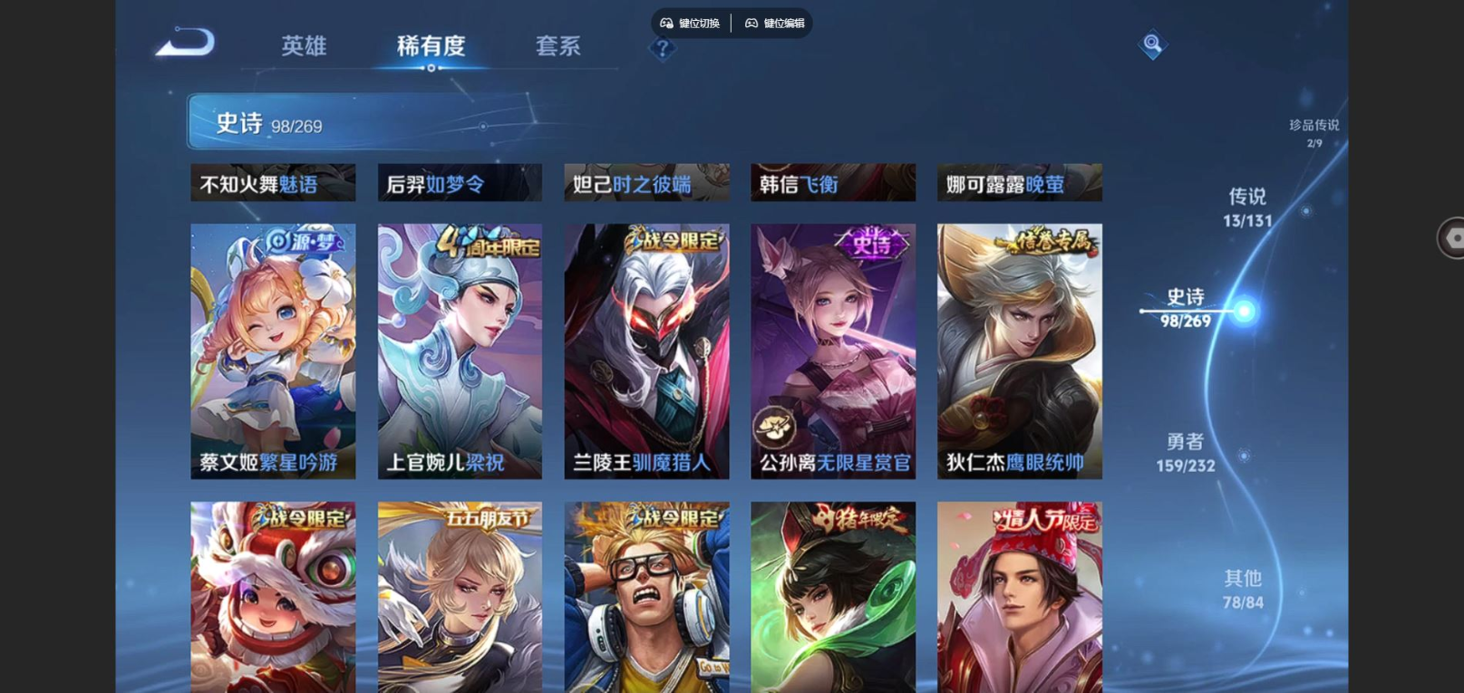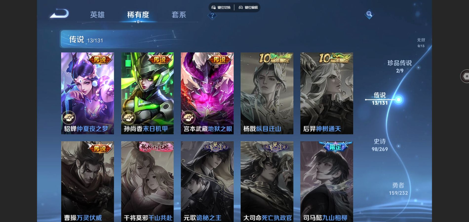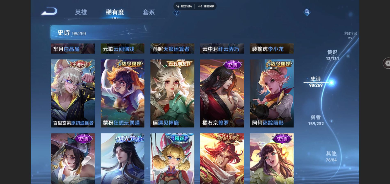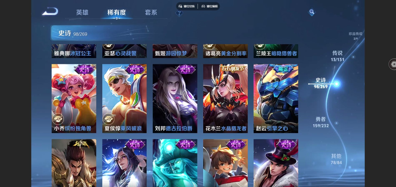 贵族等级:v8皮肤数:351情人节限定2 传说品质13 生肖限定3 珍品传说2 荣耀典藏1 英雄数:128