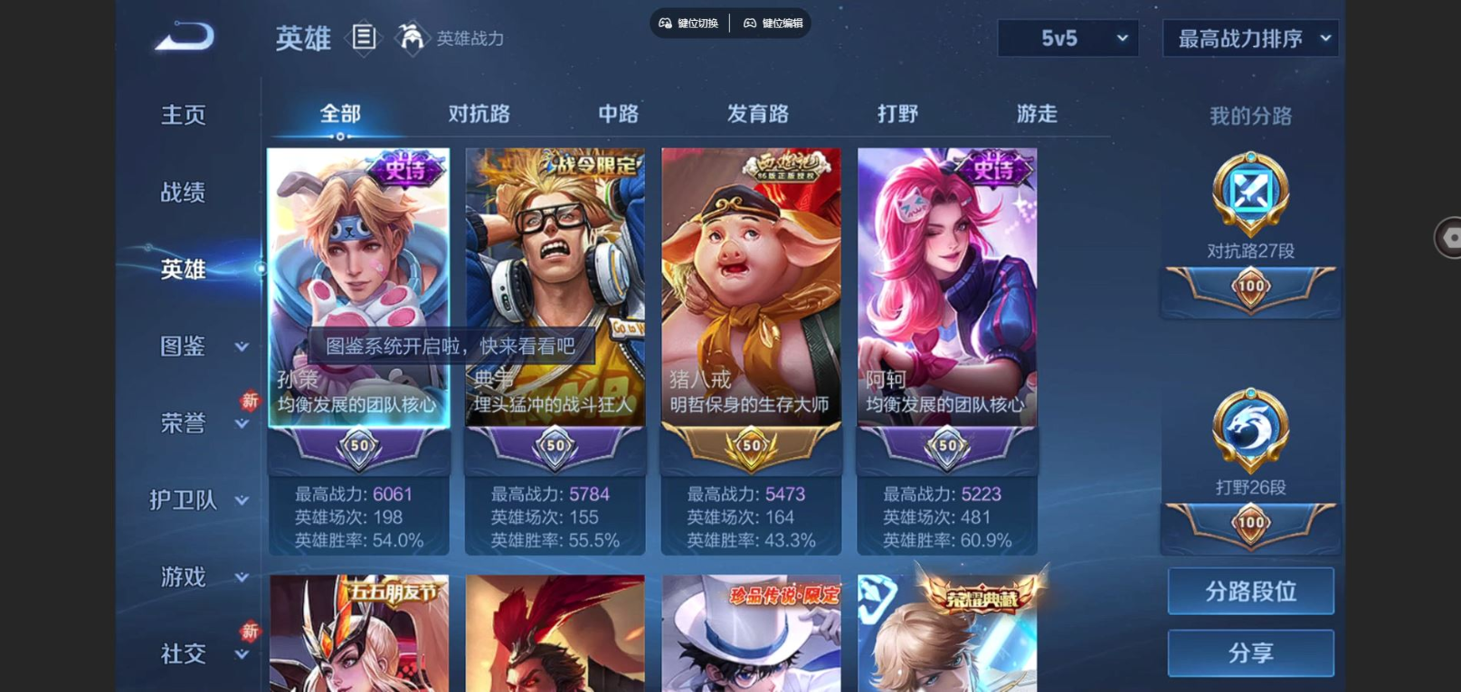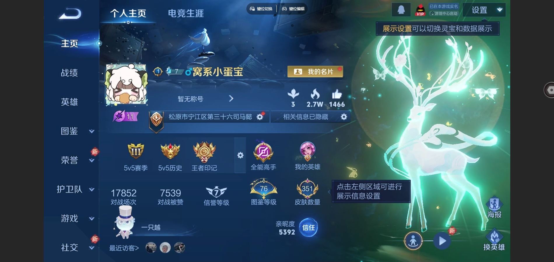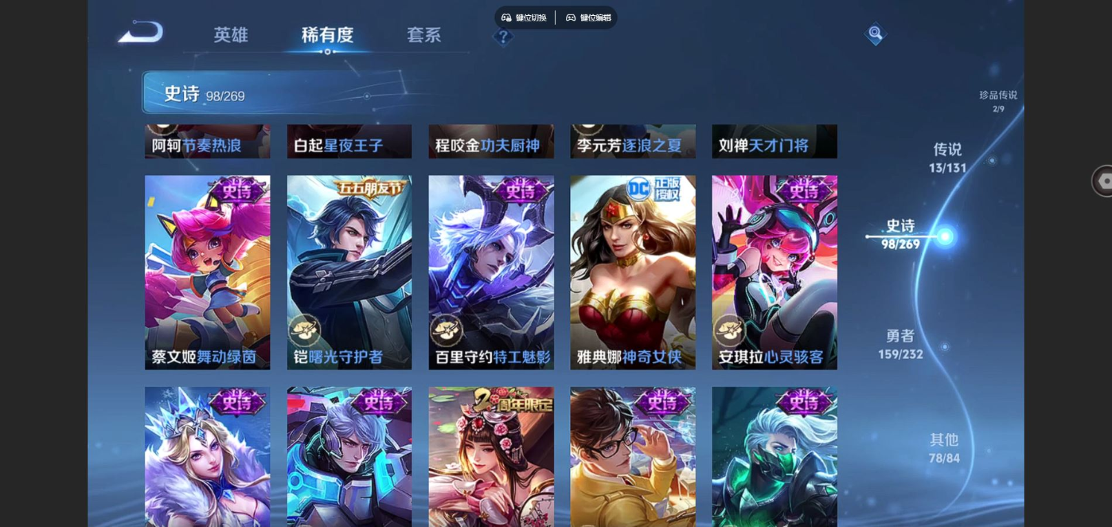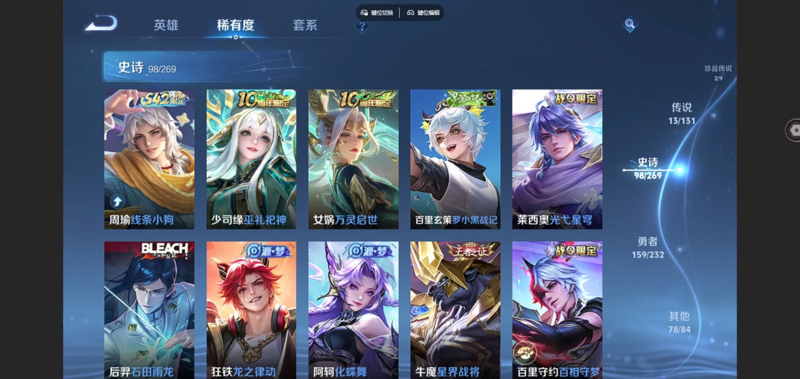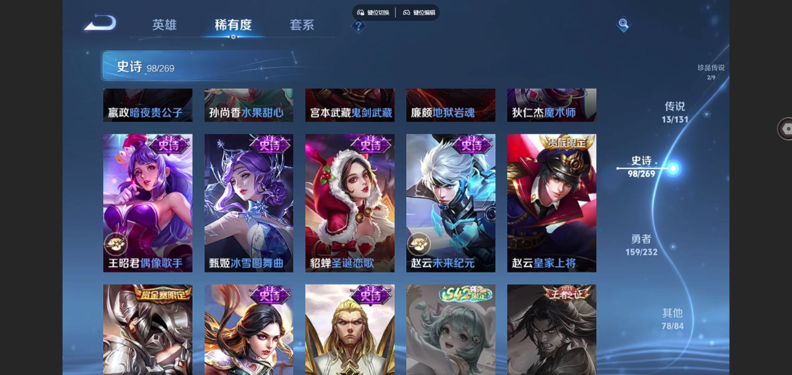 贵族等级:v8皮肤数:351情人节限定2 传说品质13 生肖限定3 珍品传说2 荣耀典藏1 英雄数:128