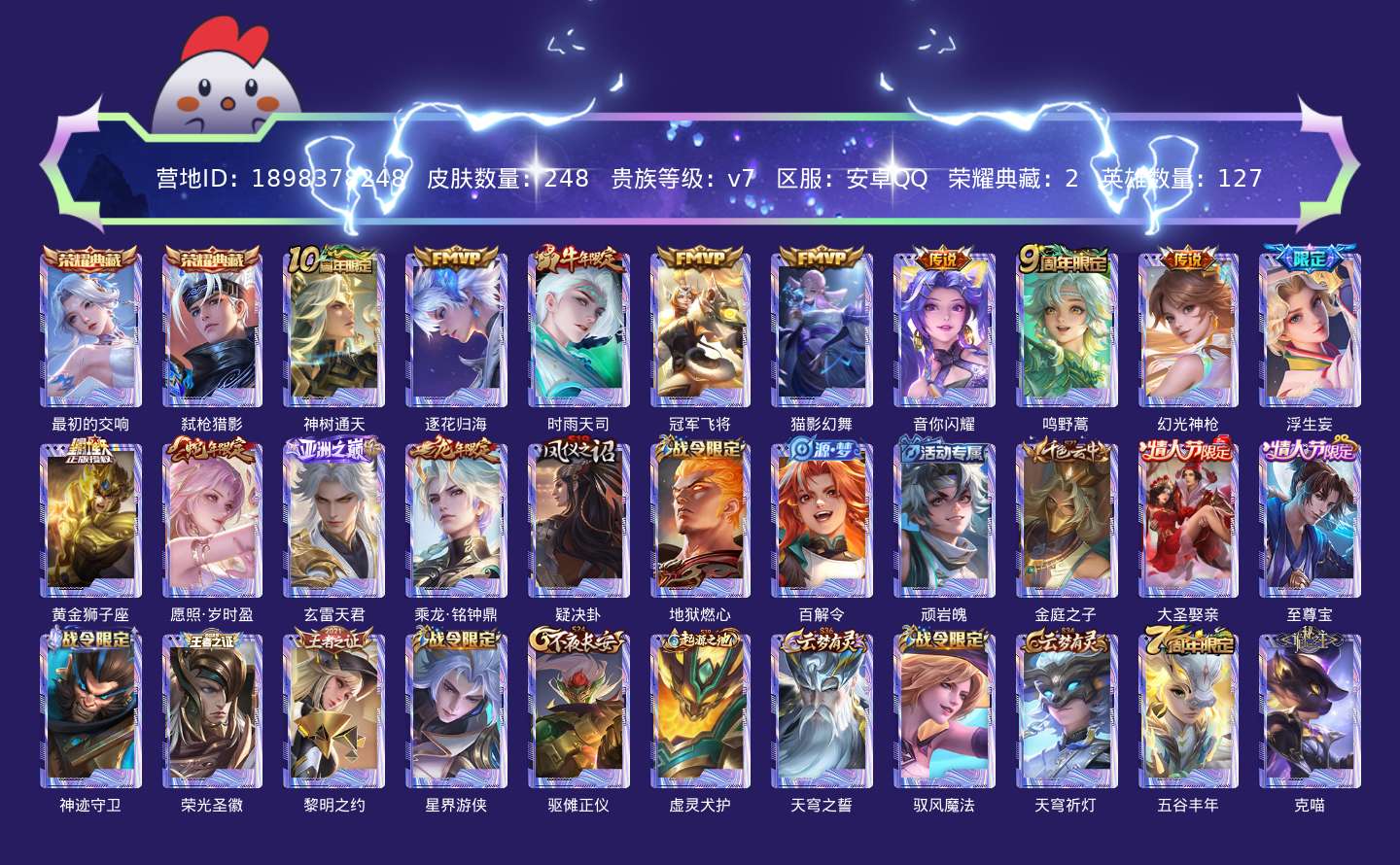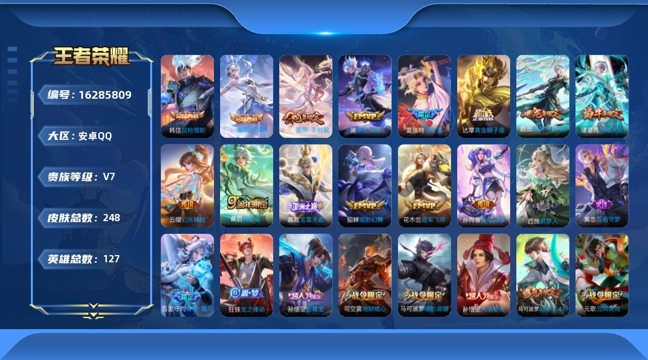贵族等级:v7皮肤数:248传说品质13 生肖限定4 情人节限定2 荣耀典藏2 英雄数:127