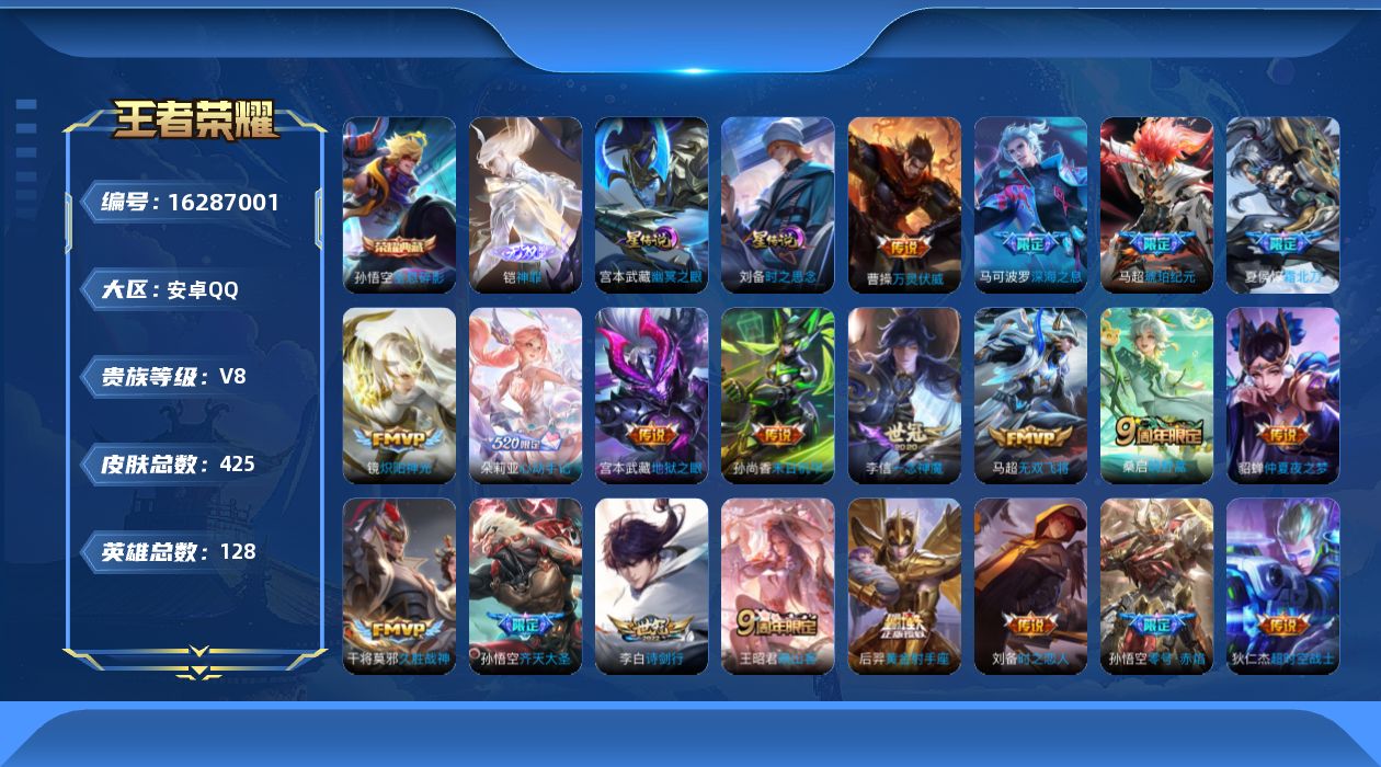 传说品质_后羿_黄金射手座传说品质_后羿_神树通天传说品质_孙悟空_零号·赤焰传说品质_孙悟空_齐天大圣传说品质_孙悟空_地狱火传说品质_马超_无双飞将传说品质_马超_琥珀纪元传说品质_杨戬_纵目迁山传说品质_干将莫邪_久胜战神传说品质_宫本武藏_地狱之眼传说品质_宫本武藏_惊梅引传说品质_周瑜_音你心动传说品质_镜_炽阳神光传说品质_貂蝉_仲夏夜之梦传说品质_李信_一念神魔传说品质_孙尚香_末日机甲传说品质_孙尚香_音你闪耀传说品质_夏侯惇_霜北刀传说品质_庄周_牧神诗旅传说品质_桑启_鸣野蒿传说品质_刘备_时之恋人传说品质_王昭君_映山客传说品质_张良_黄金白羊座传说品质_马可波罗_深海之息传说品质_李白_诗剑行传说品质_朵莉亚_心动手记传说品质_曹操_万灵伏威传说品质_狄仁杰_超时空战士传说品质_虞姬_云霓雀翎传说品质_虞姬_启明星使传说品质_赵云_淬星耀世传说品质_王昭君_乞巧织情