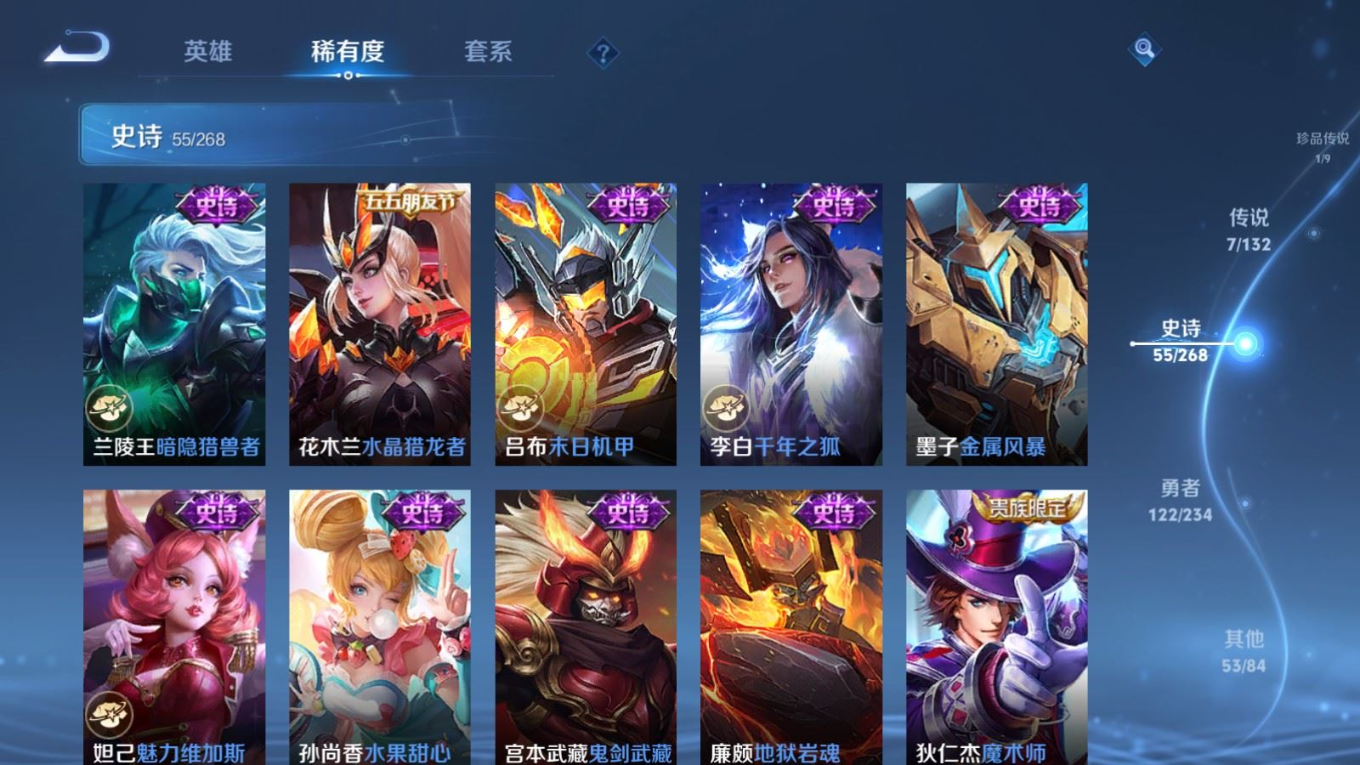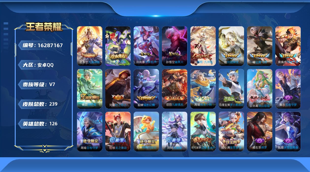 贵族等级:v7皮肤数:239传说品质7 生肖限定2 荣耀典藏1 珍品传说1 英雄数:126