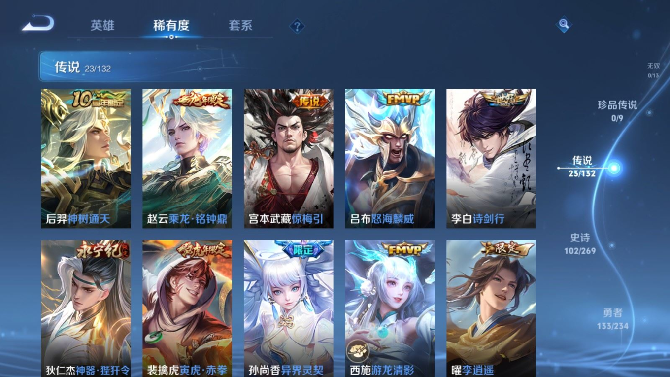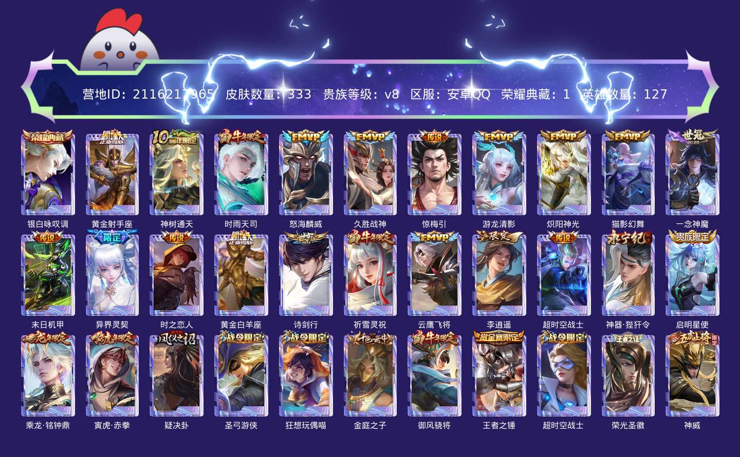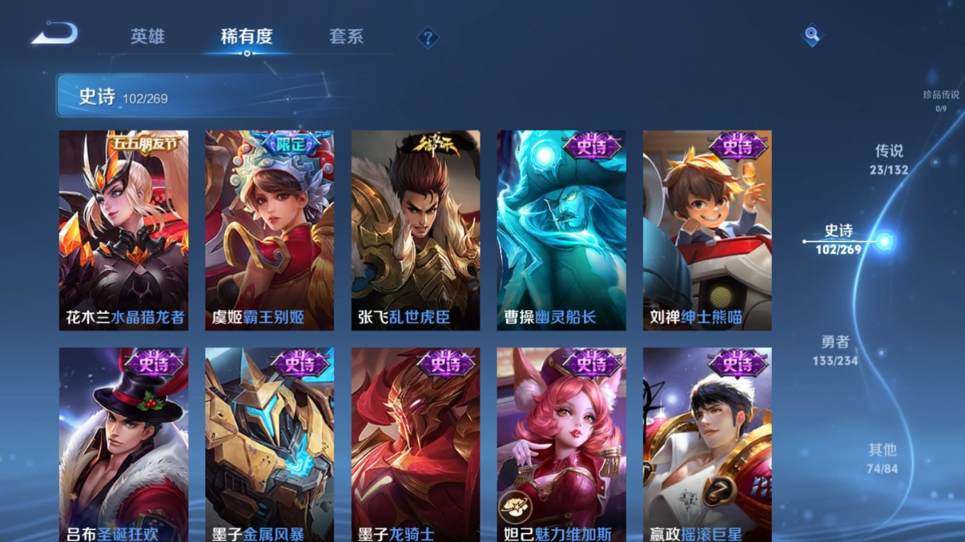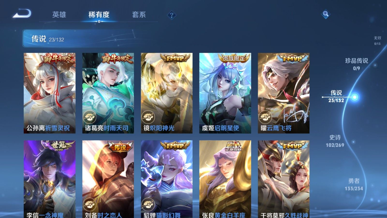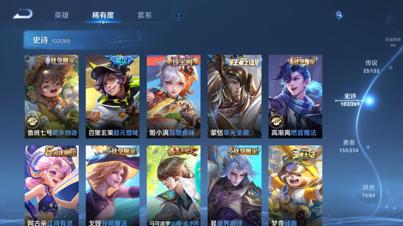贵族等级:v8皮肤数:333传说品质23 生肖限定10 情人节限定1 荣耀典藏1 英雄数:127