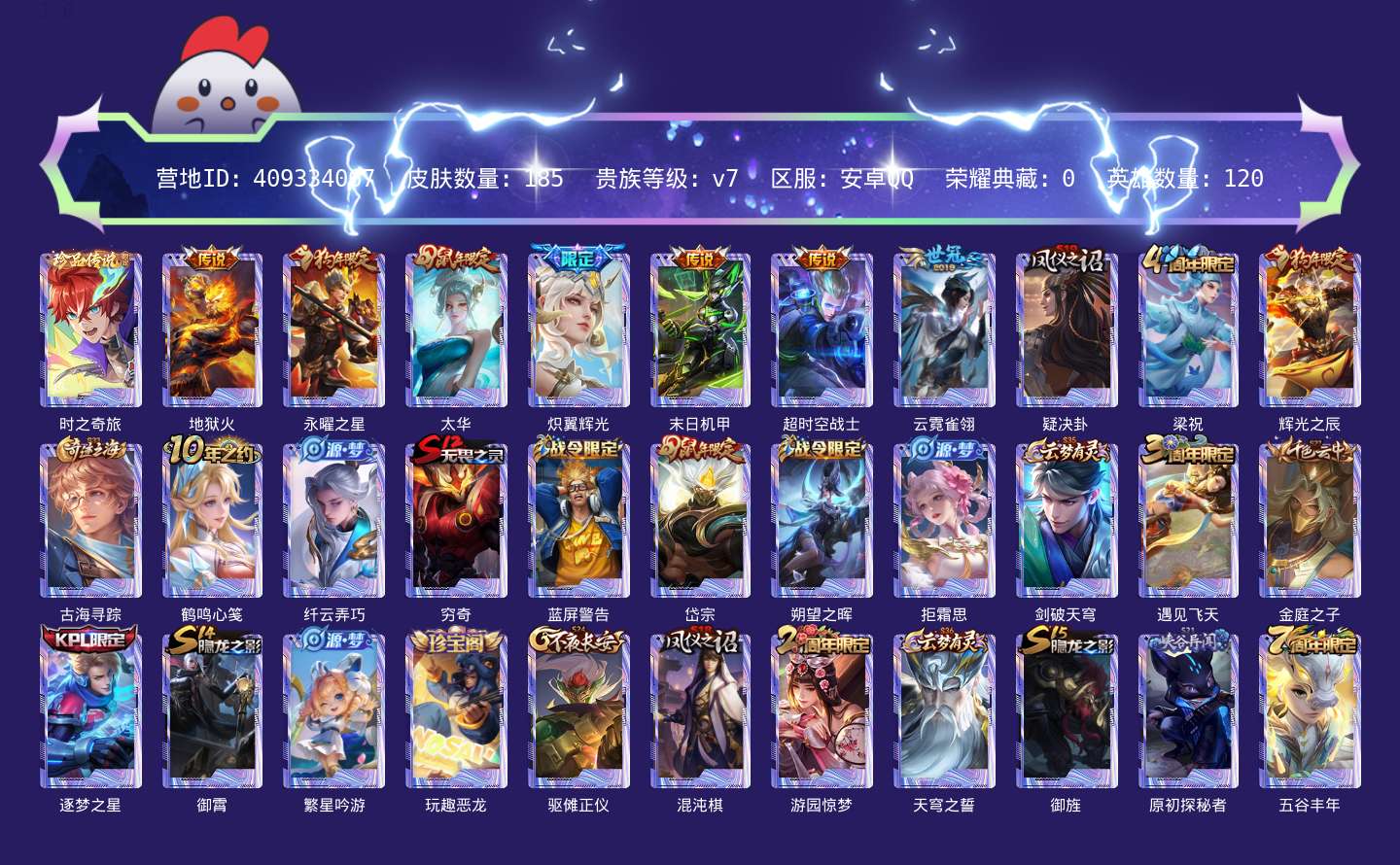 贵族等级:v7皮肤数:191生肖限定5 传说品质7 珍品传说1 英雄数:124