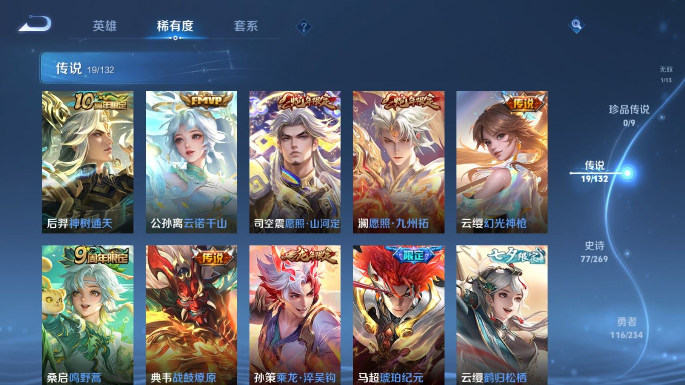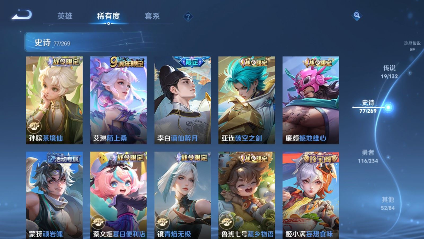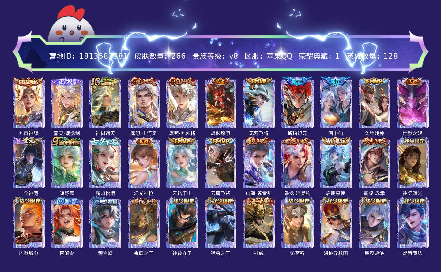 贵族等级:v8皮肤数:266传说品质19 生肖限定6 荣耀典藏1 无双1 英雄数:128