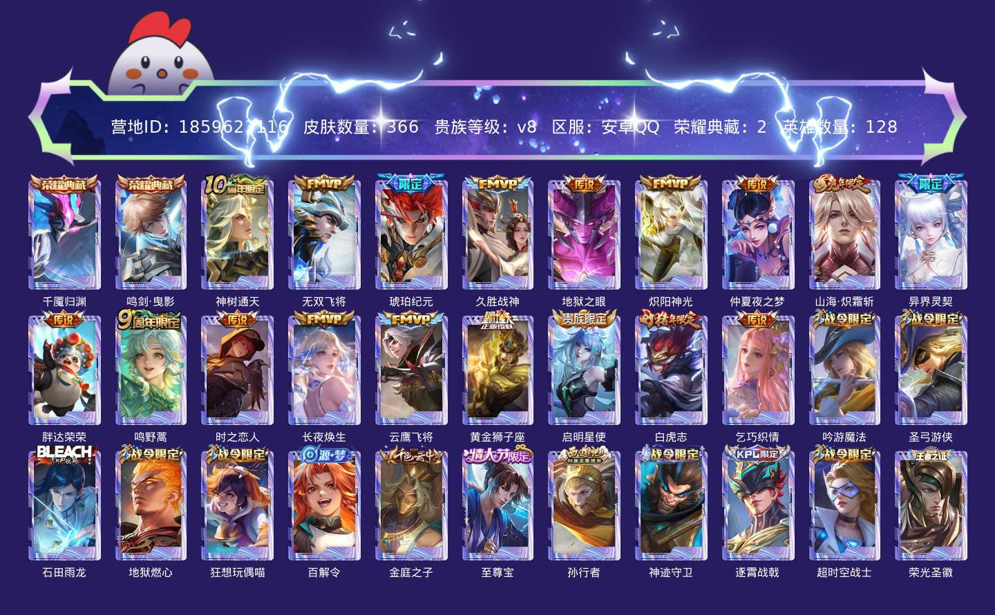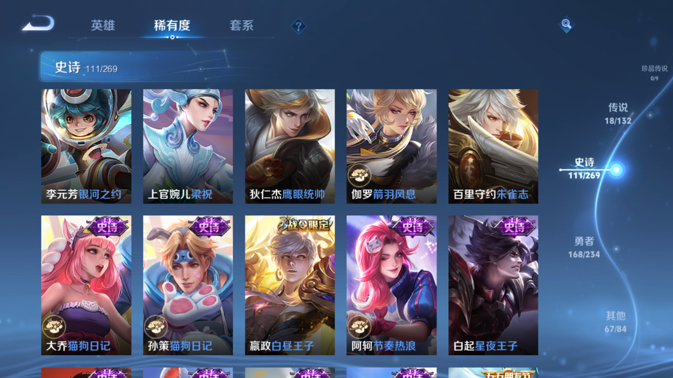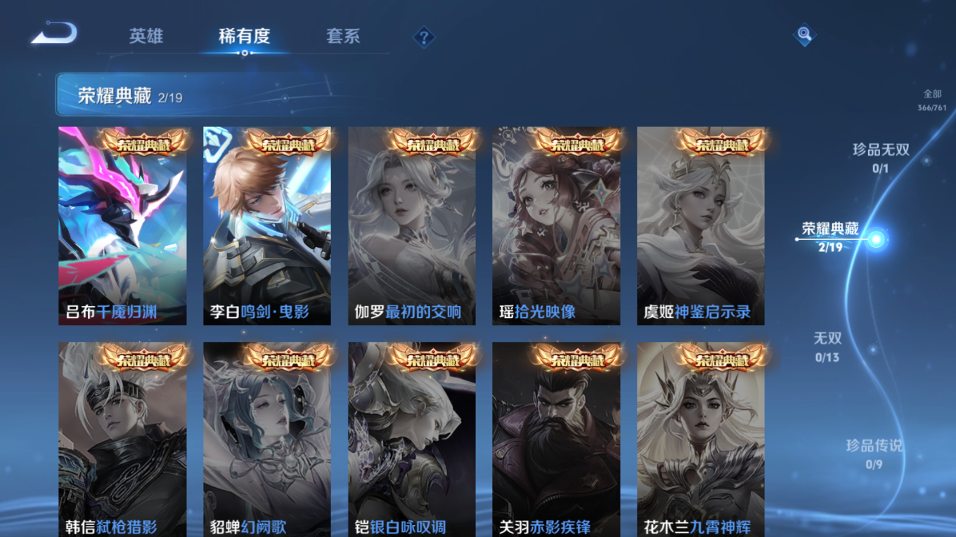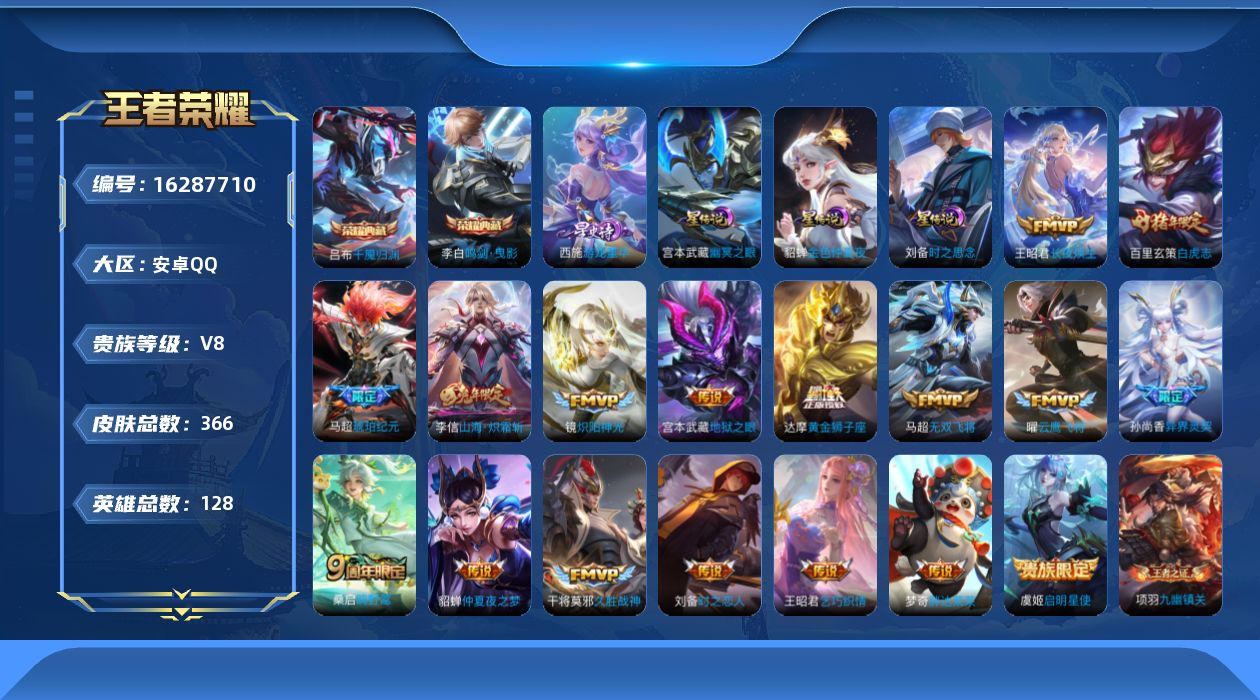 贵族等级:v8皮肤数:366传说品质18 情人节限定1 荣耀典藏2 生肖限定4 英雄数:128
