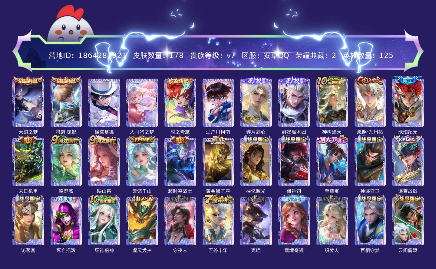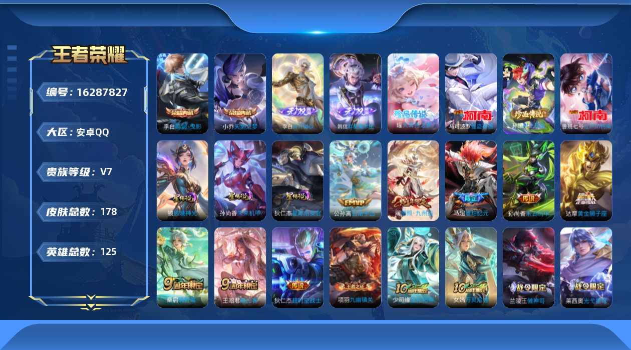 贵族等级:v7皮肤数:178传说品质9 生肖限定1 情人节限定1 荣耀典藏2 珍品传说4 无双2 英雄数:125