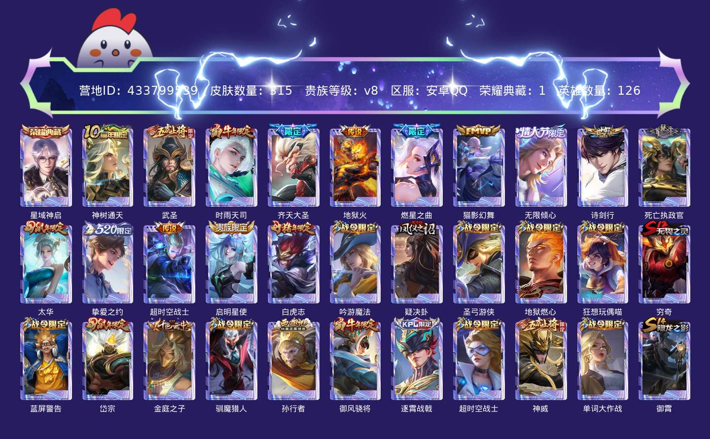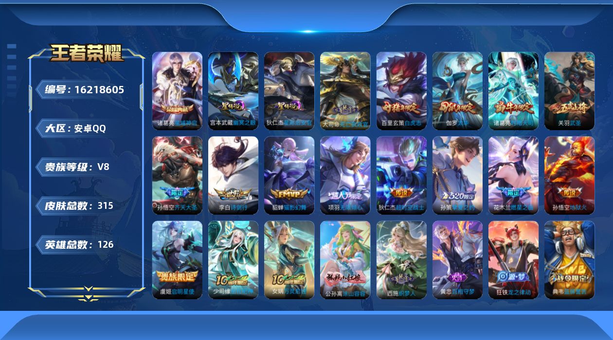 贵族等级:v8皮肤数:315传说品质15 生肖限定11 荣耀典藏1 情人节限定1 英雄数:126