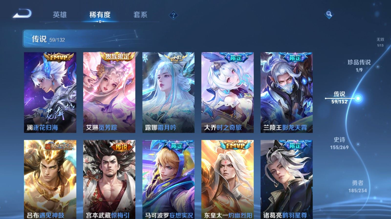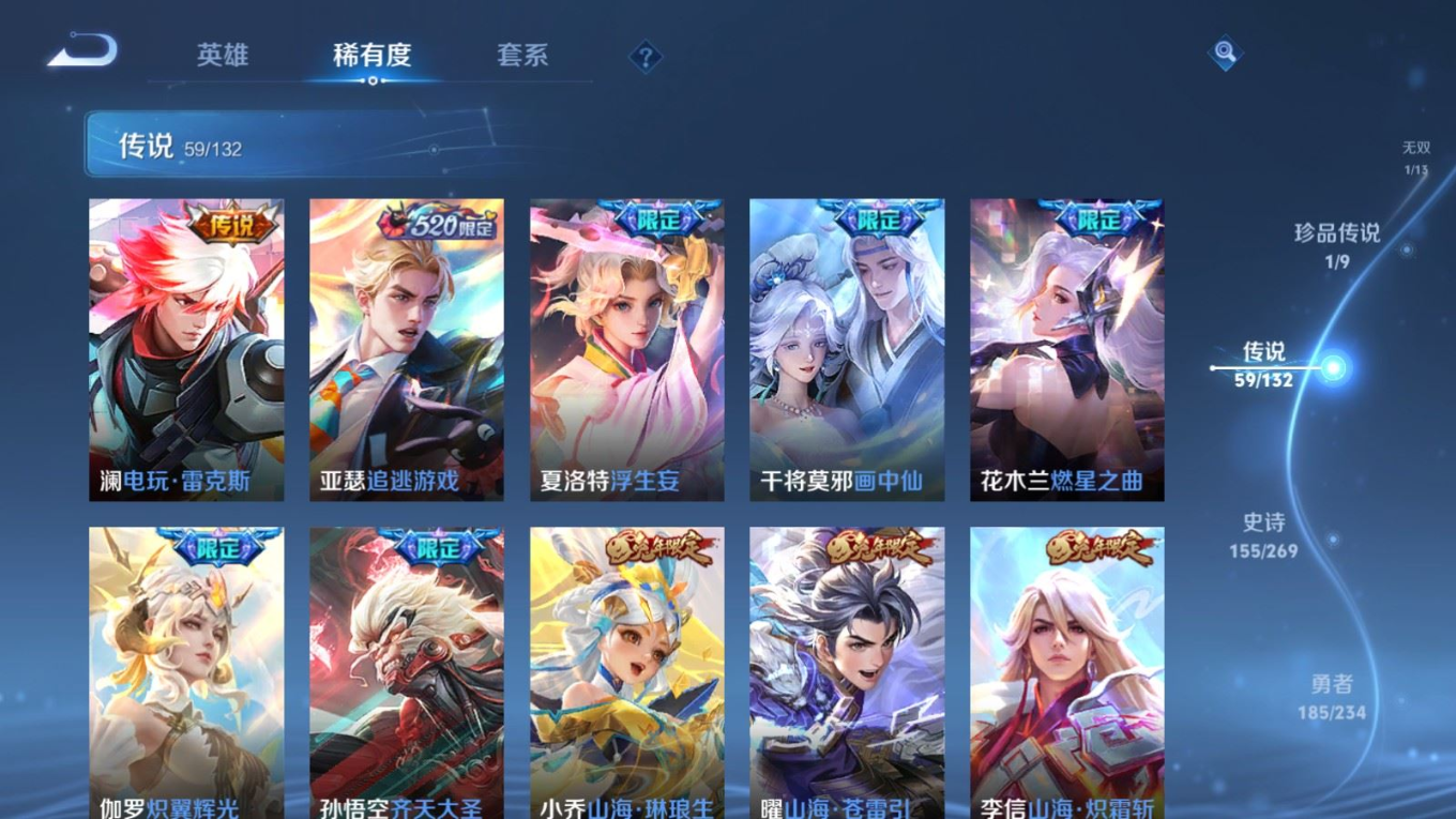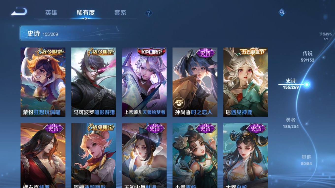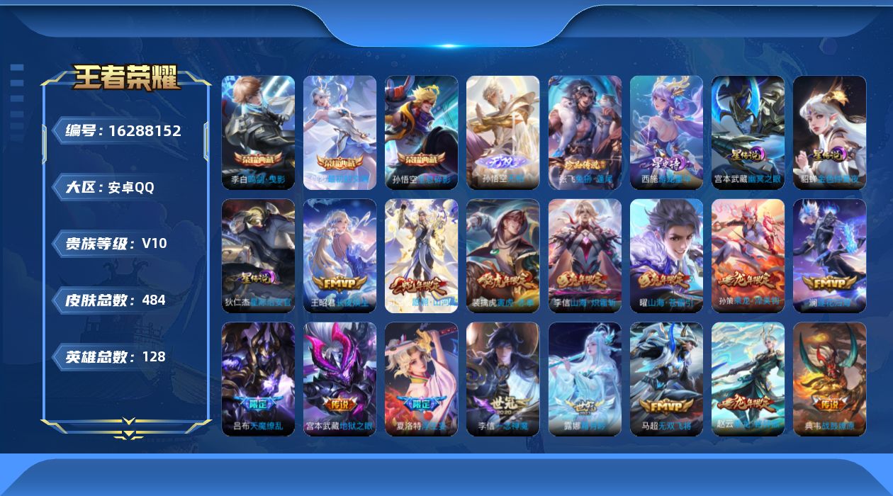 贵族等级:v10皮肤数:484传说品质59 生肖限定17 情人节限定4 荣耀典藏3 无双1 珍品传说1 英雄数:128