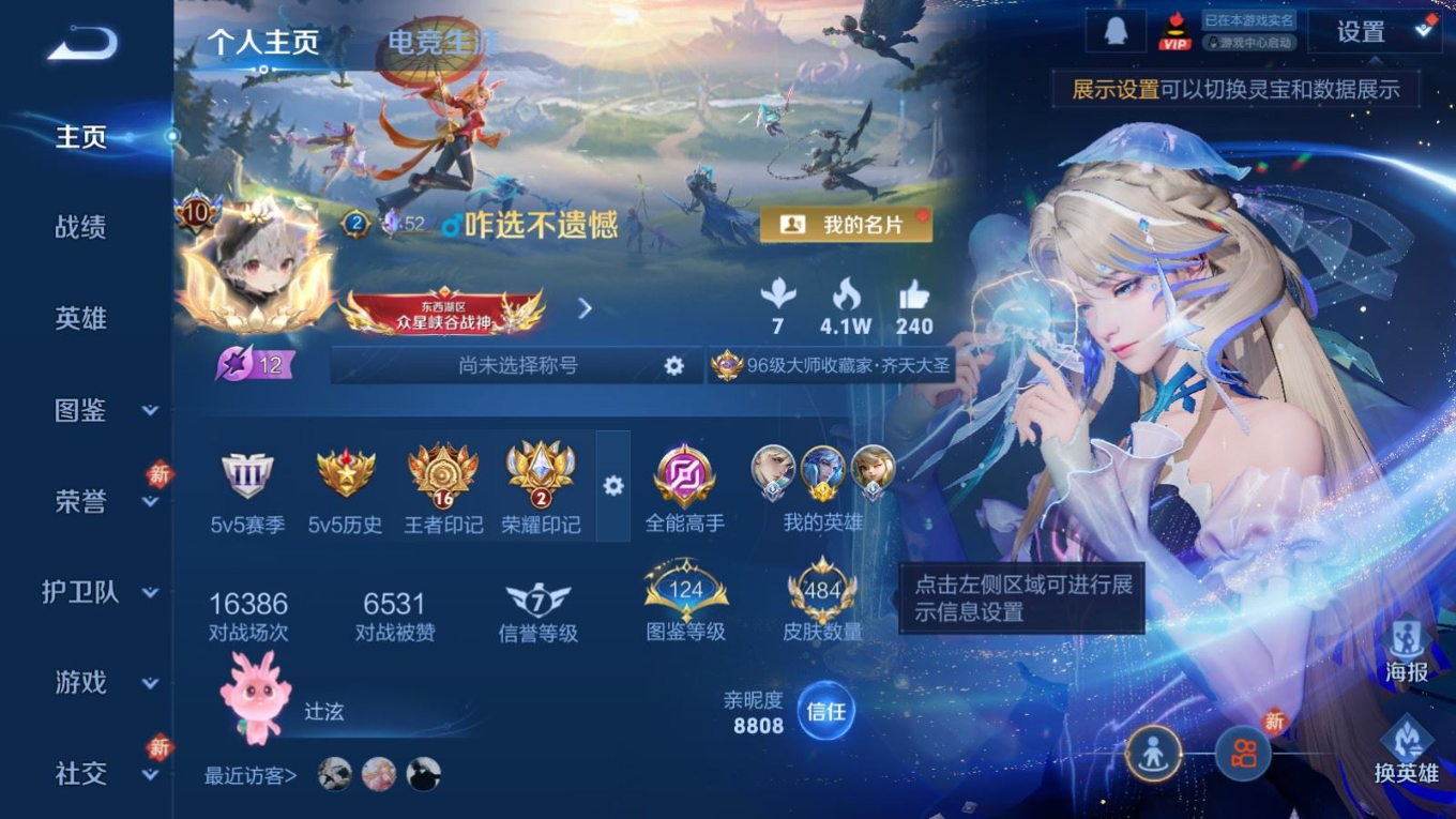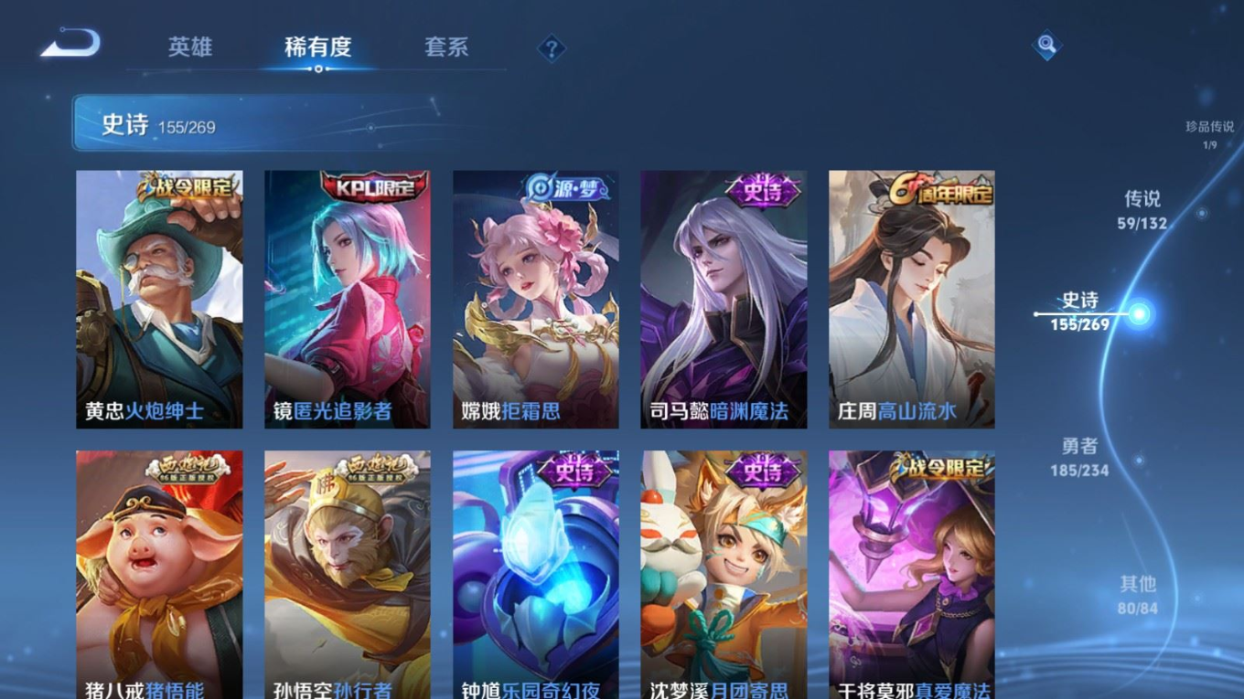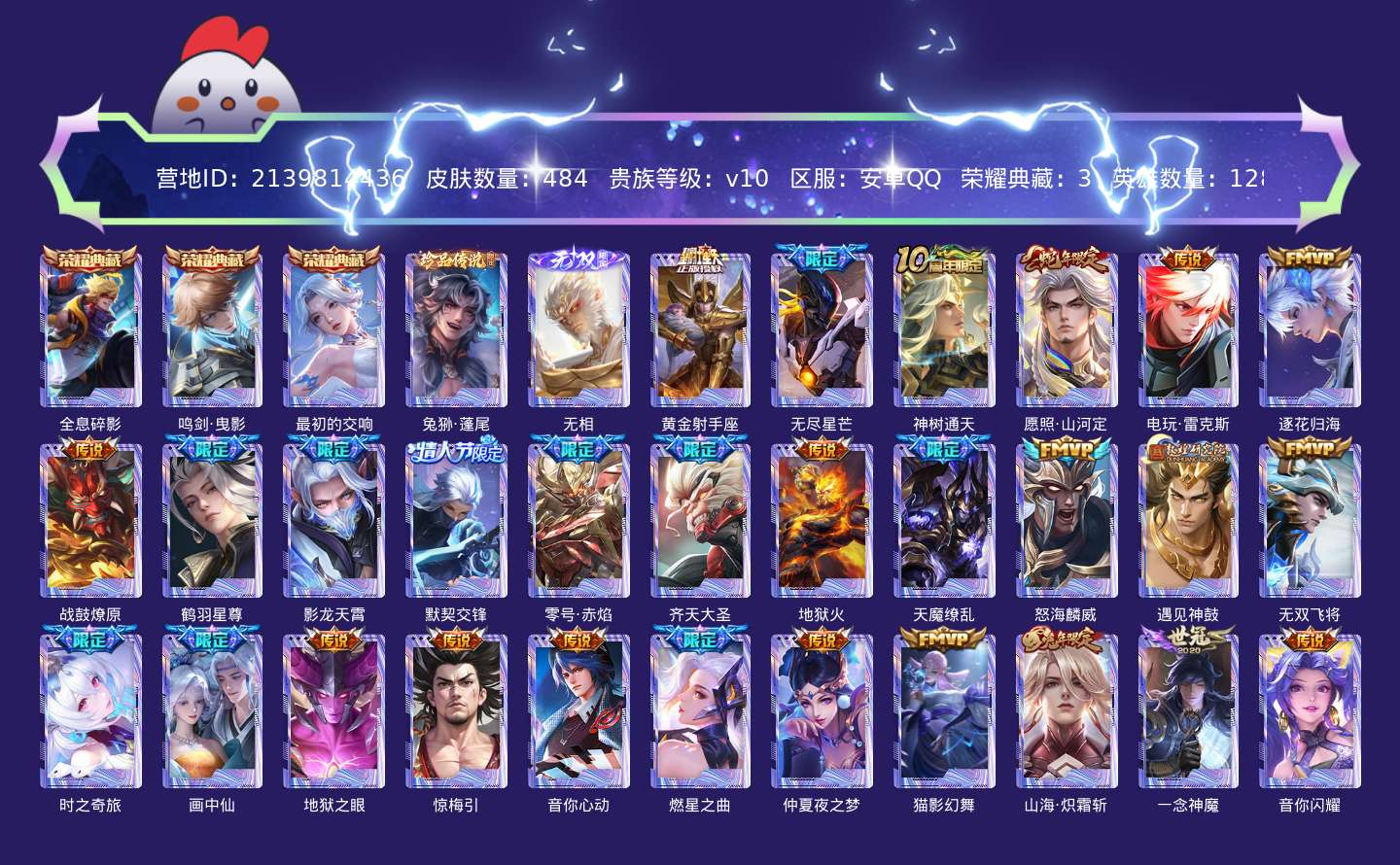贵族等级:v10皮肤数:484传说品质59 生肖限定17 情人节限定4 荣耀典藏3 无双1 珍品传说1 英雄数:128
