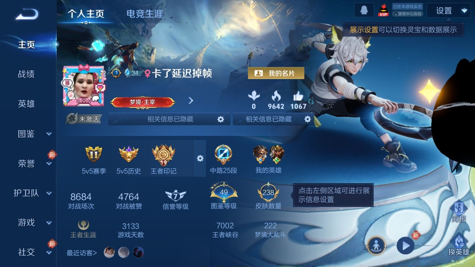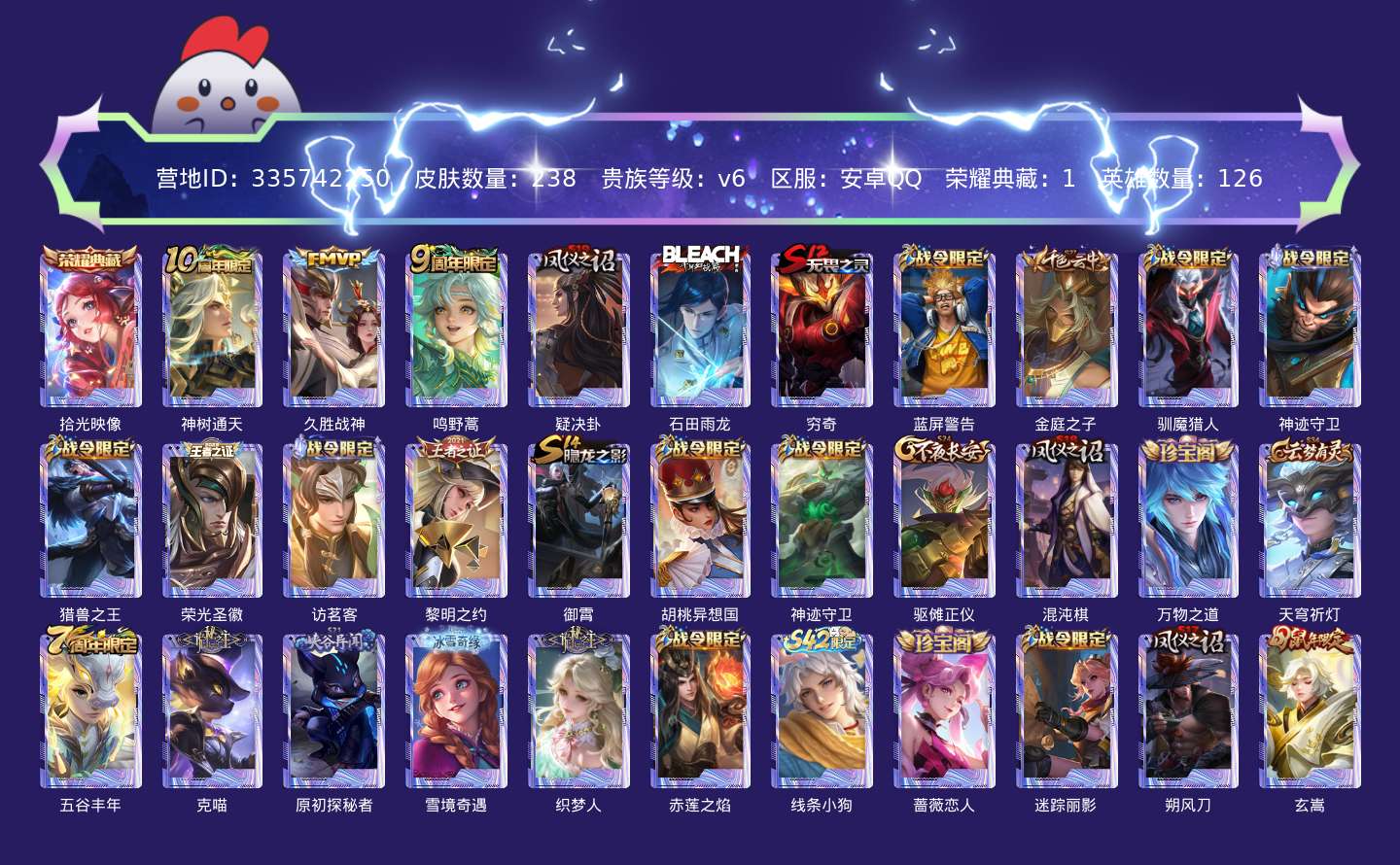 贵族等级:v6皮肤数:238传说品质3 生肖限定2 情人节限定1 荣耀典藏1 英雄数:126