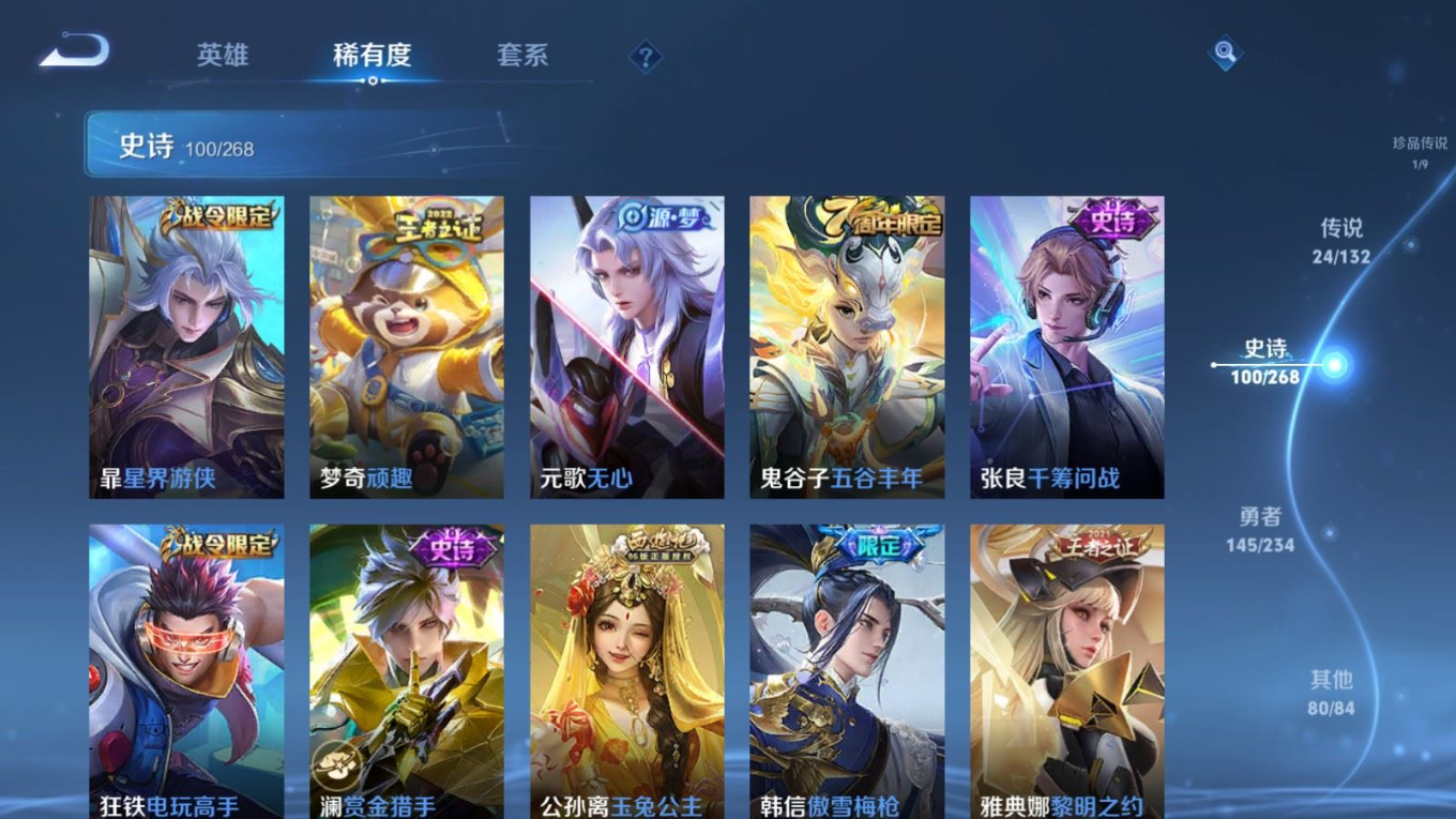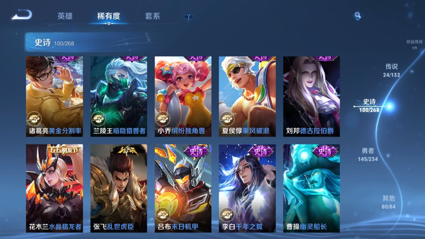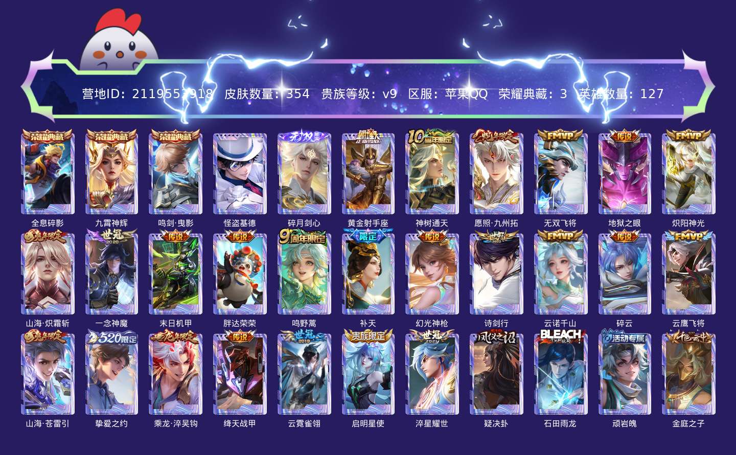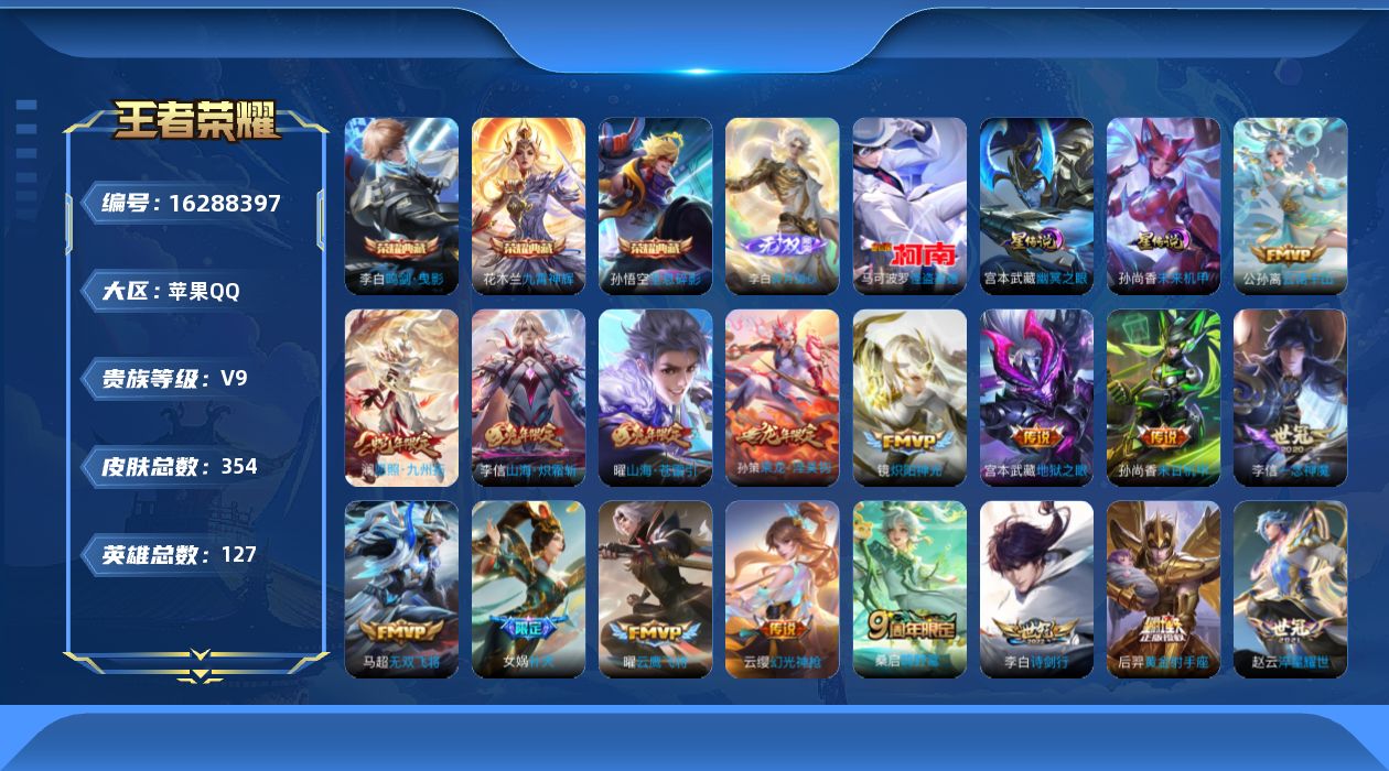 贵族等级:v9皮肤数:354传说品质24 生肖限定6 荣耀典藏3 珍品传说1 无双1 英雄数:127
