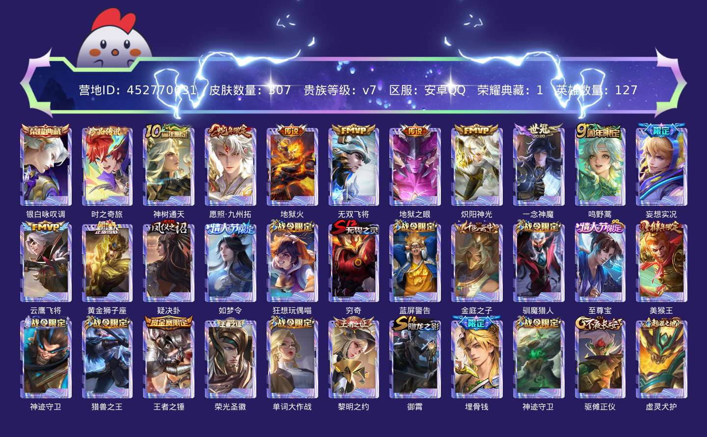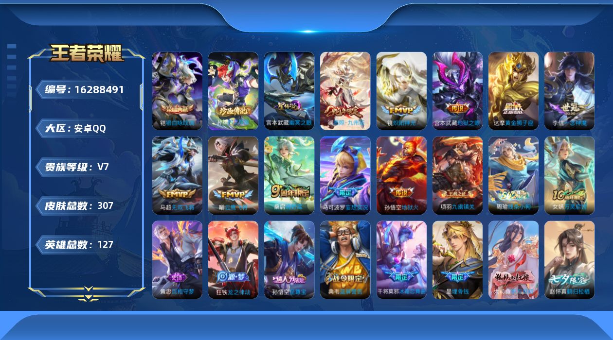 贵族等级:v7皮肤数:307情人节限定2 传说品质11 生肖限定4 珍品传说1 荣耀典藏1 英雄数:127