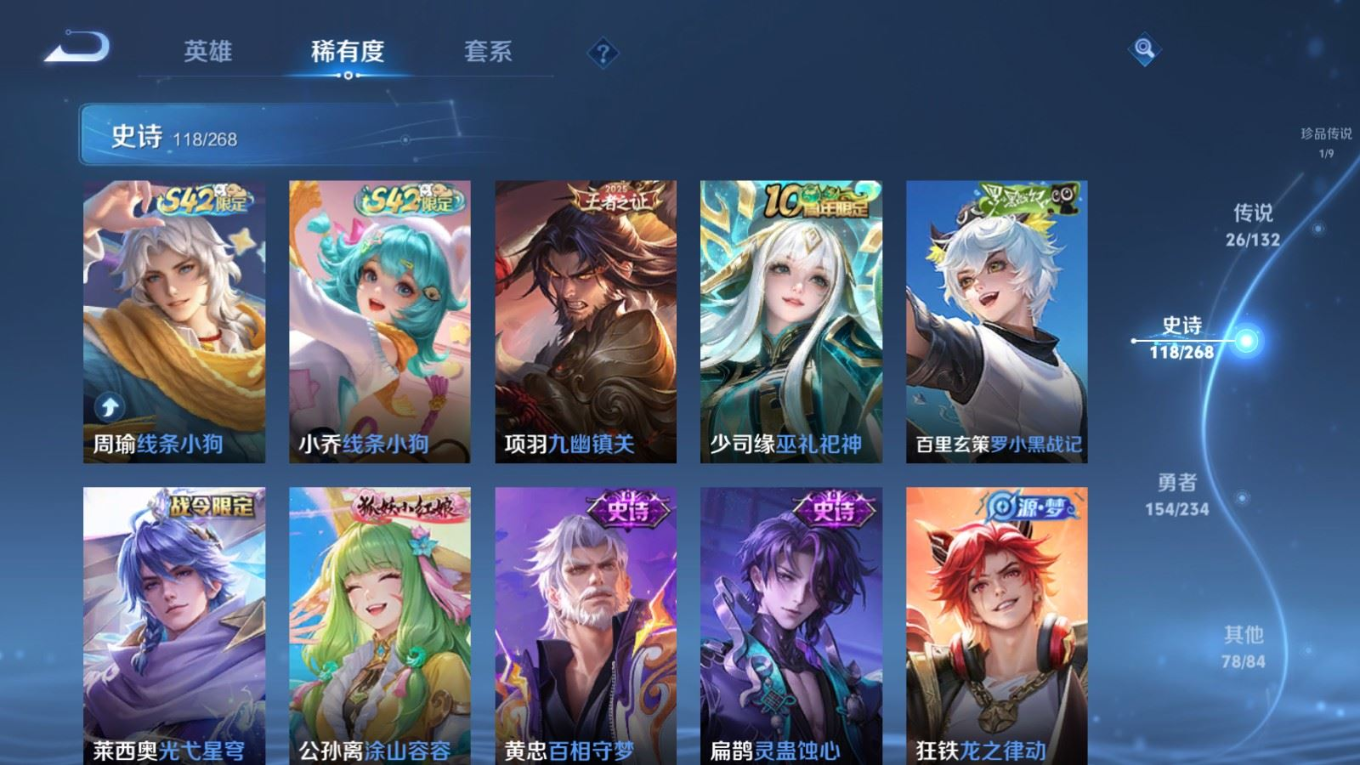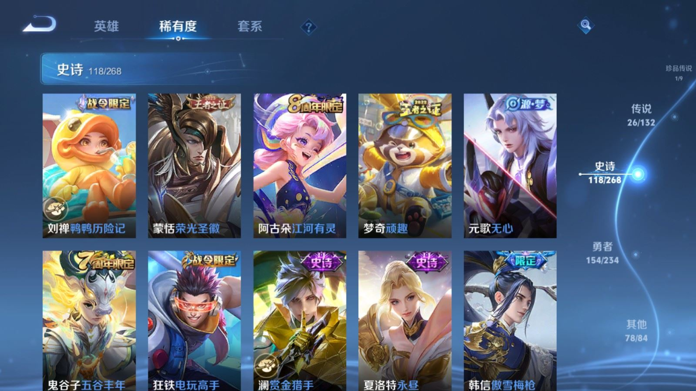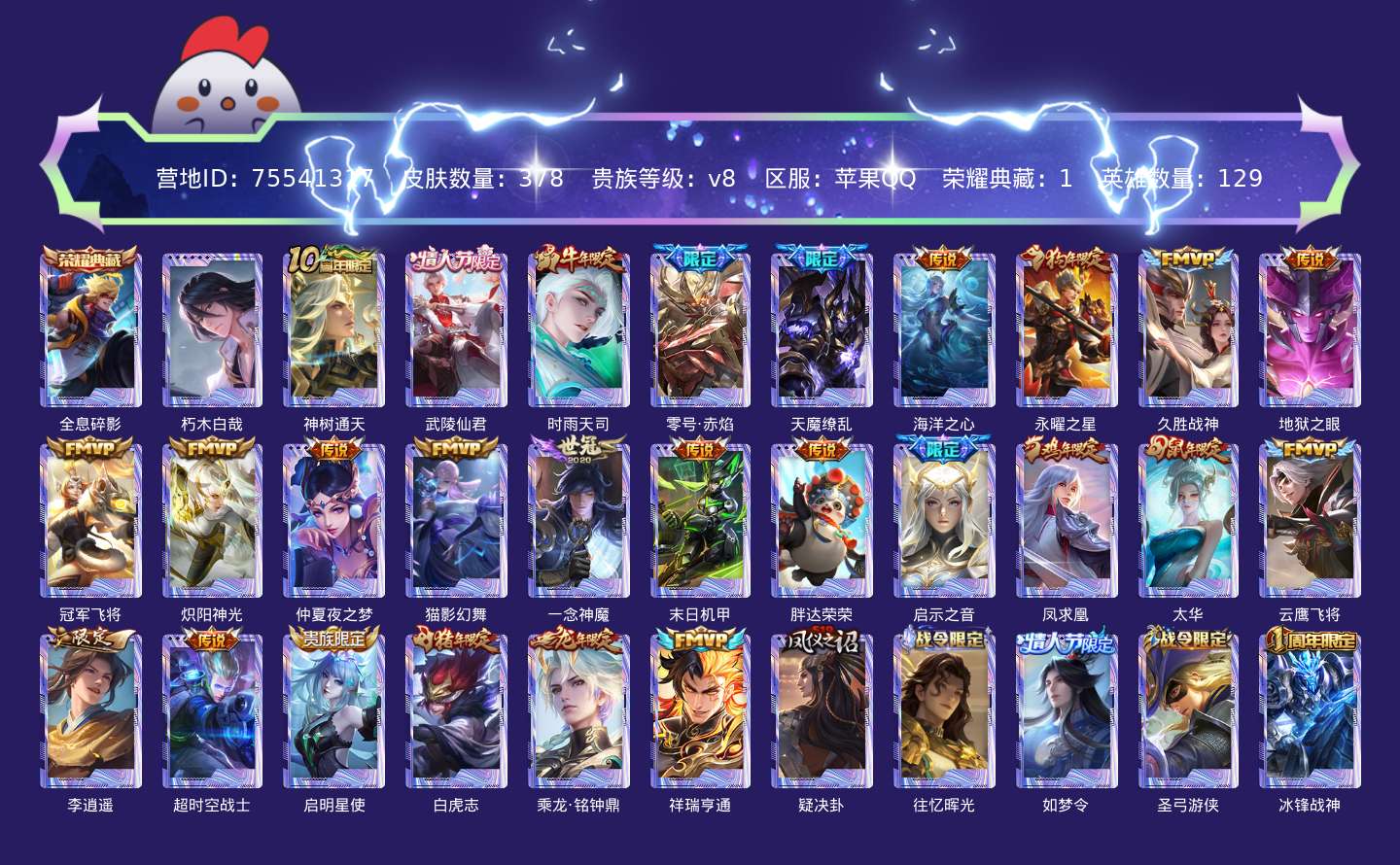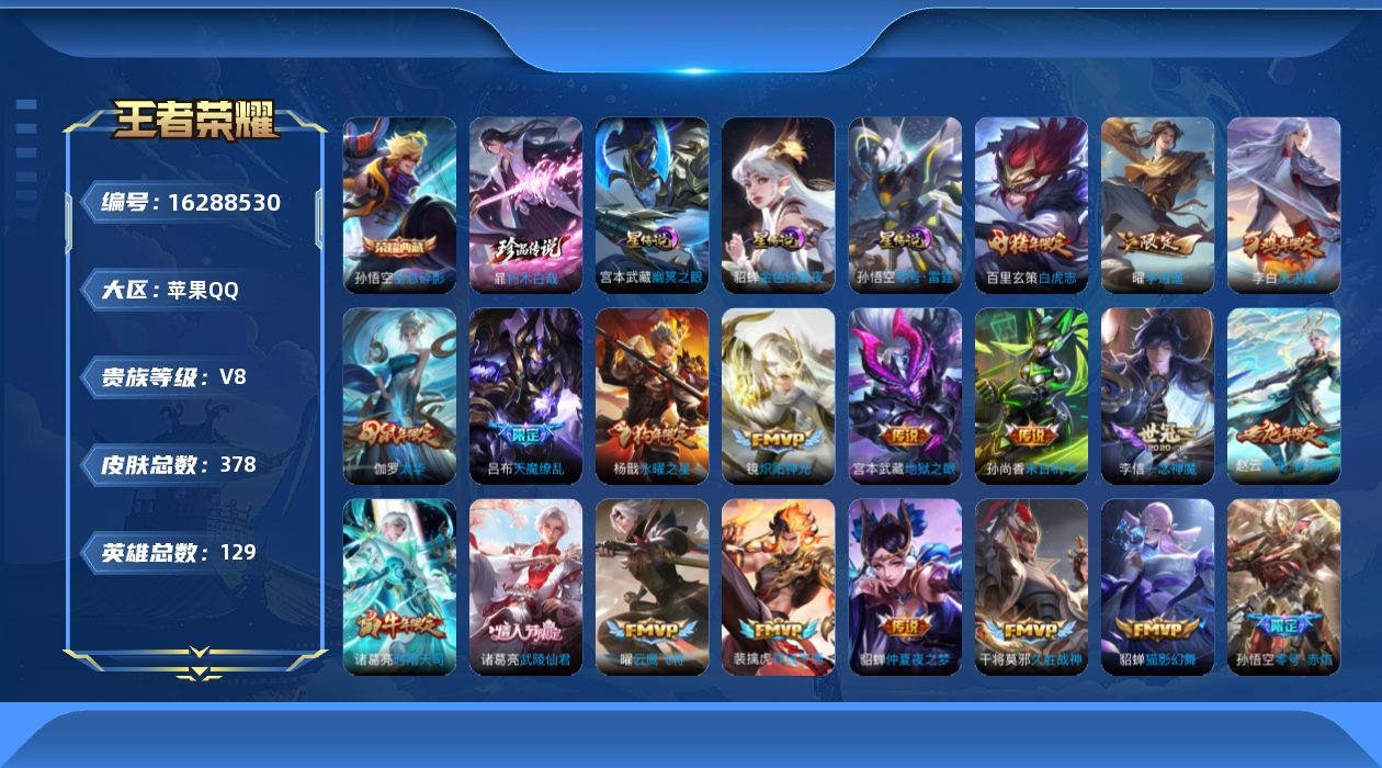 贵族等级:v8皮肤数:378情人节限定5 传说品质26 生肖限定9 荣耀典藏1 珍品传说1 英雄数:129
