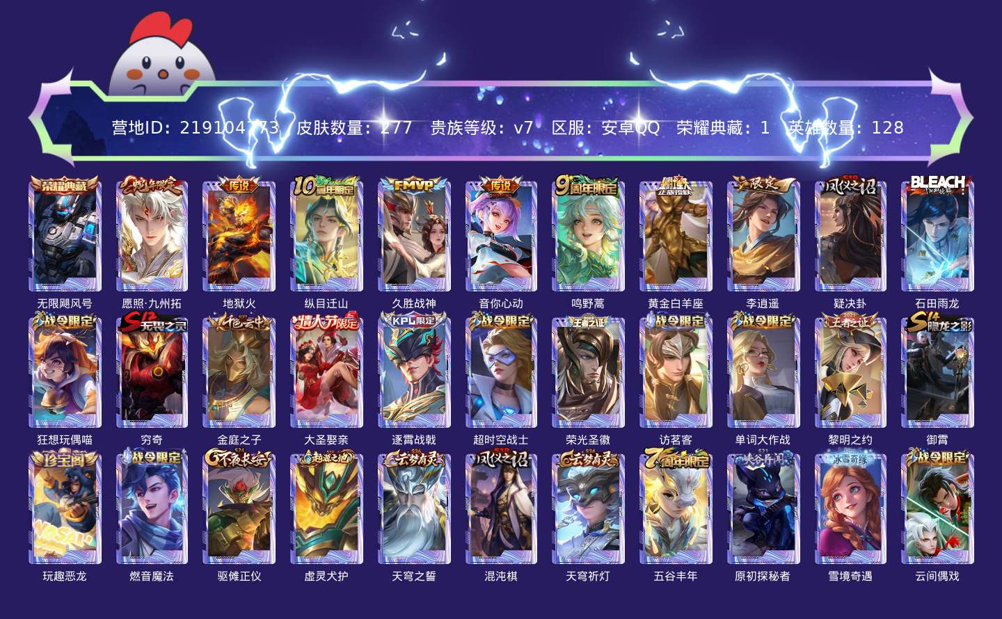 贵族等级:v7皮肤数:277传说品质8 生肖限定2 情人节限定2 荣耀典藏1 英雄数:128
