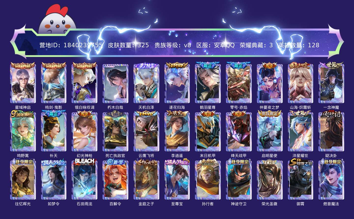 贵族等级:v8皮肤数:325情人节限定3 传说品质16 荣耀典藏3 无双1 珍品传说1 生肖限定4 英雄数:128