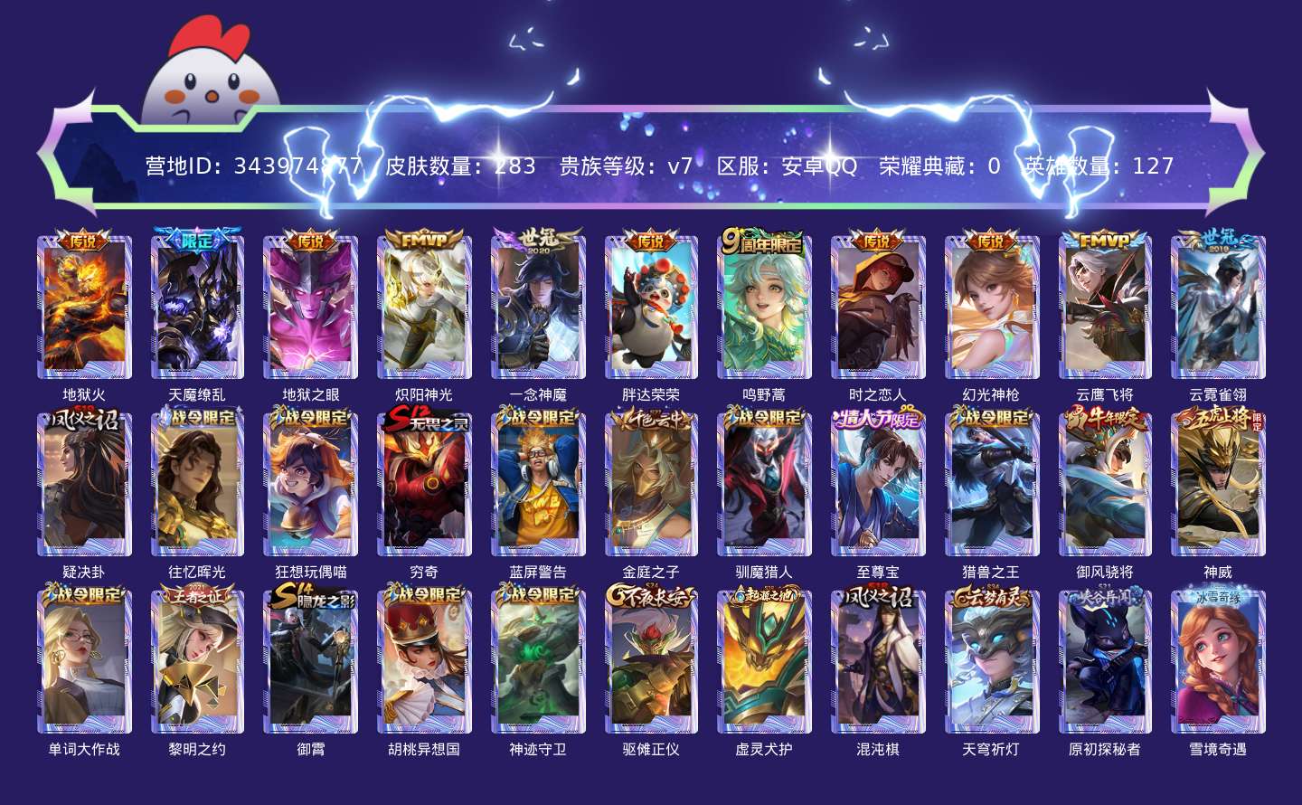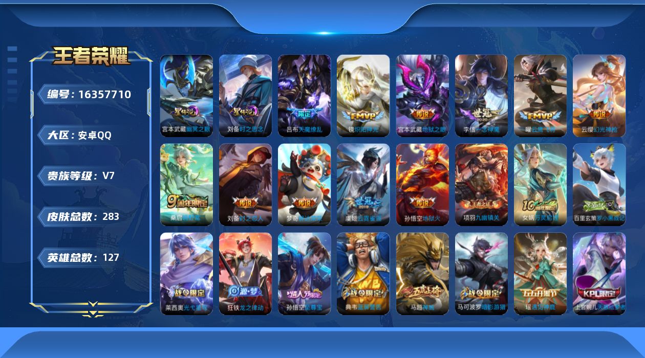 贵族等级:v7皮肤数:283情人节限定1 传说品质11 生肖限定3 英雄数:127