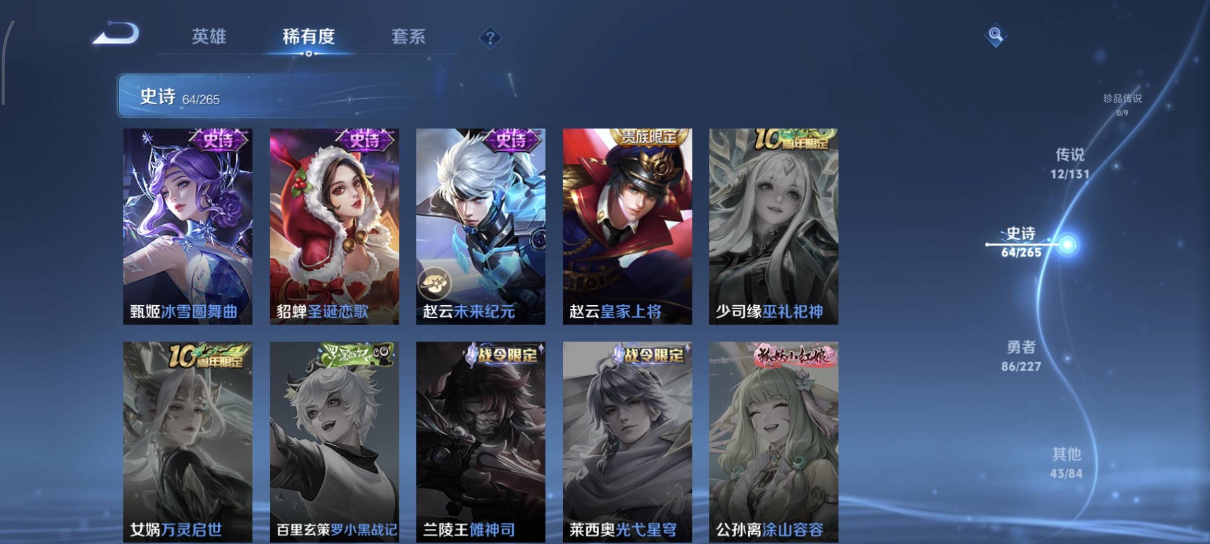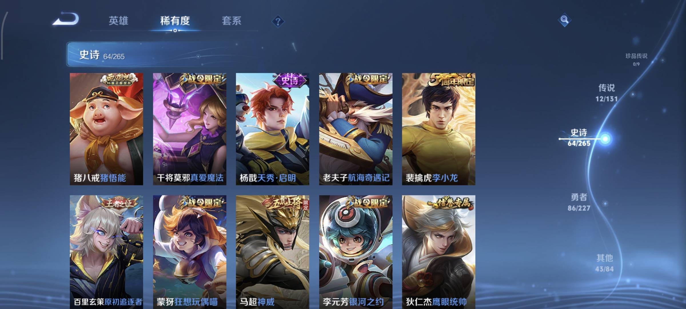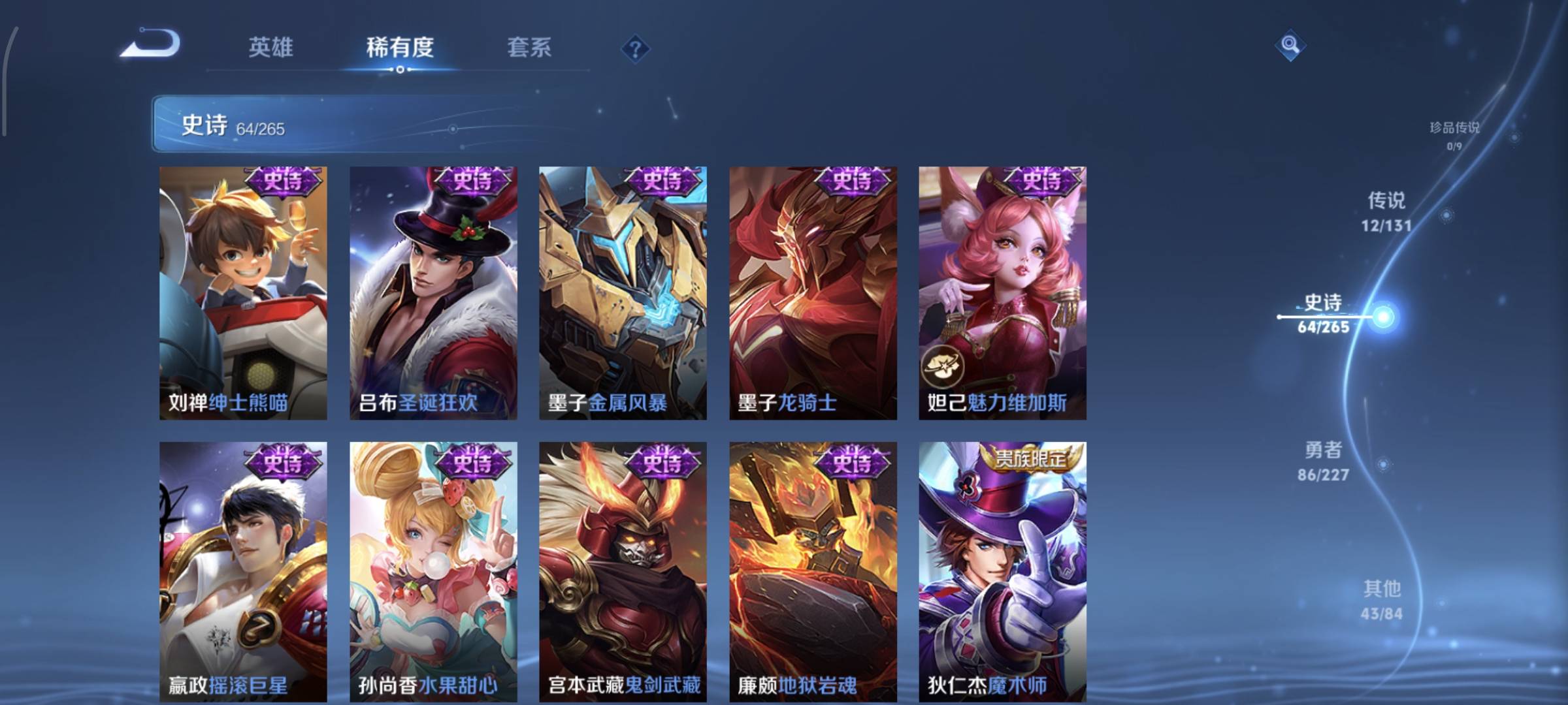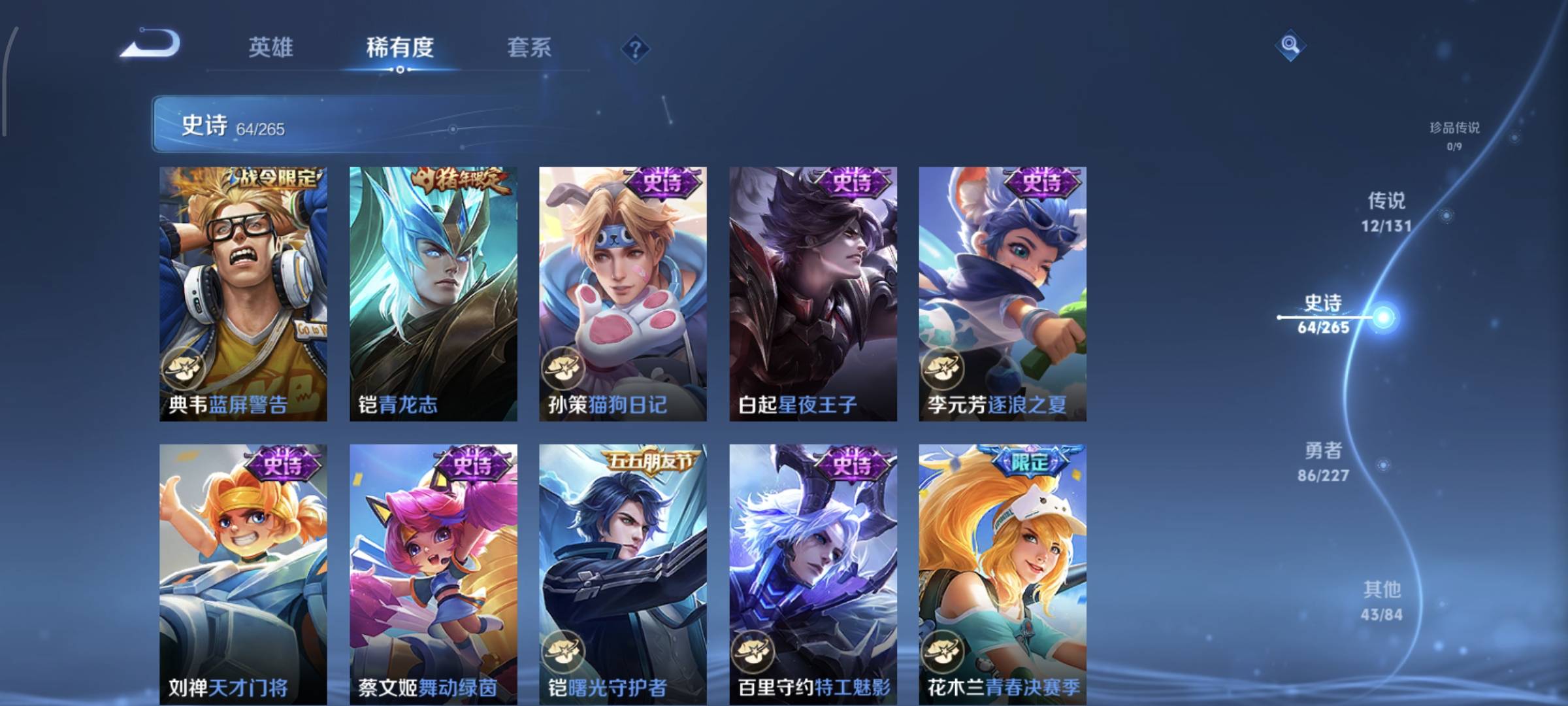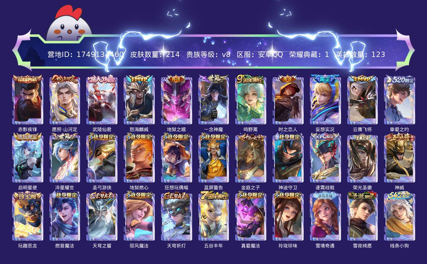 贵族等级:v8皮肤数:214荣耀典藏1 传说品质12 生肖限定2 情人节限定1 英雄数:123