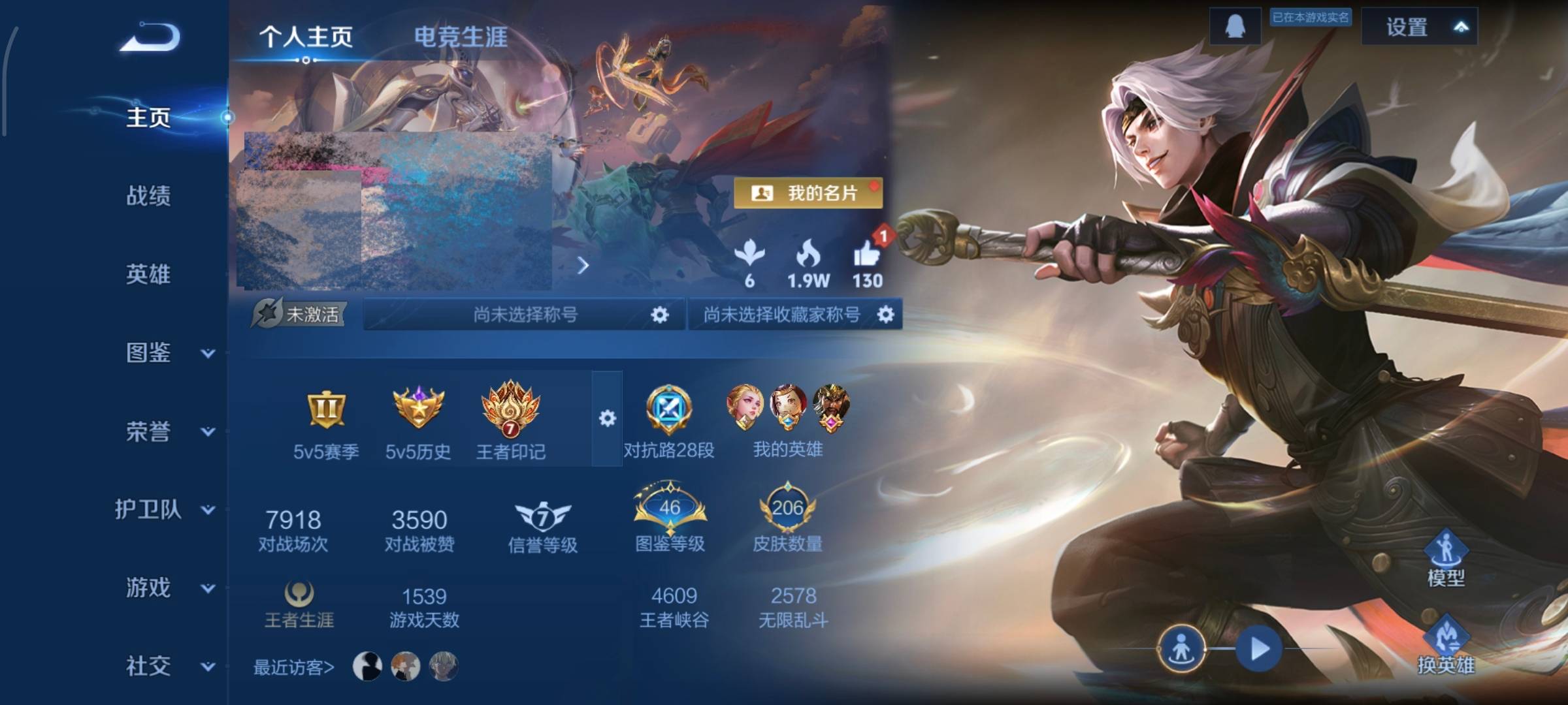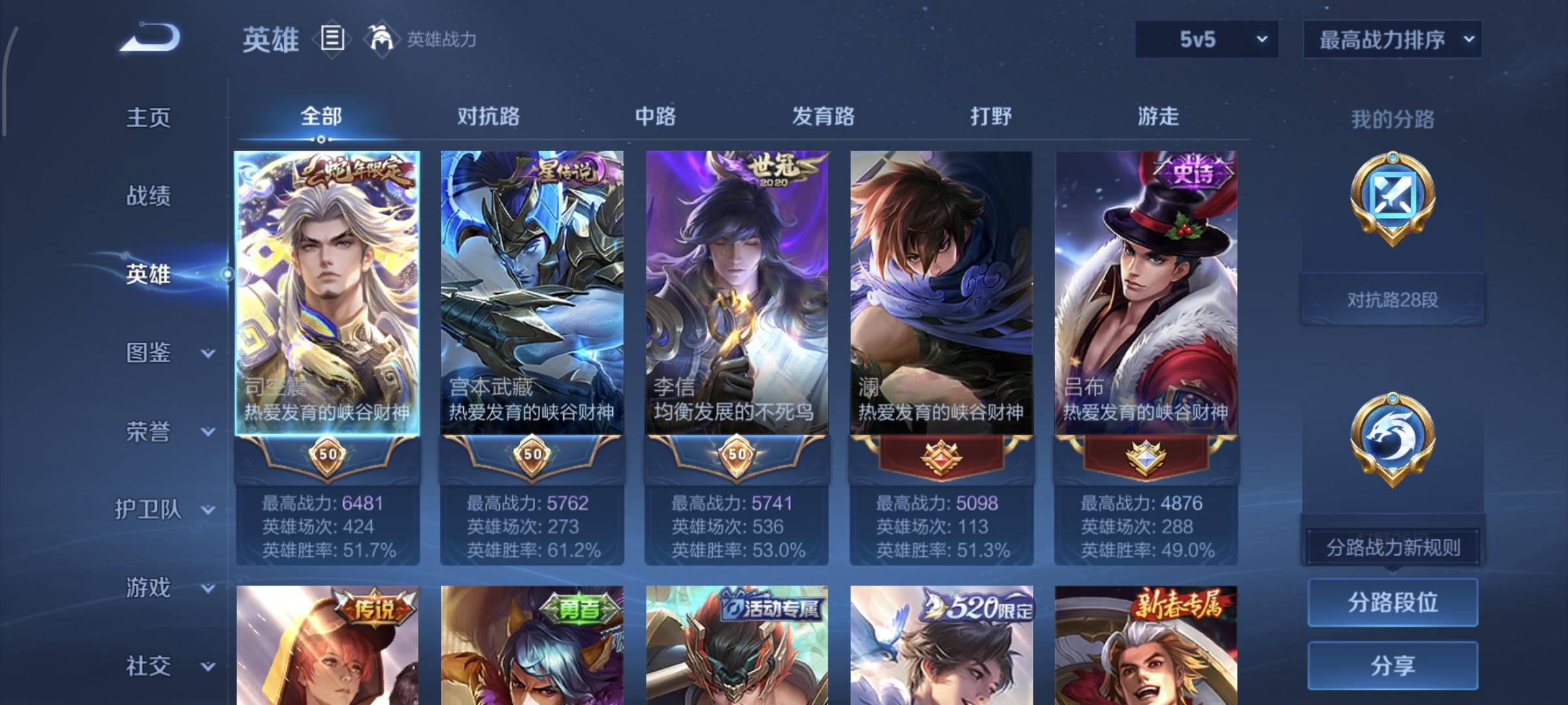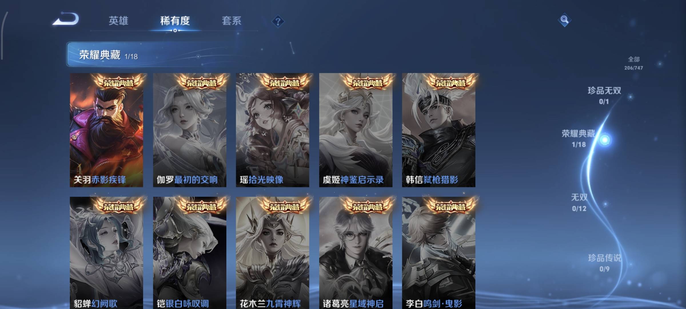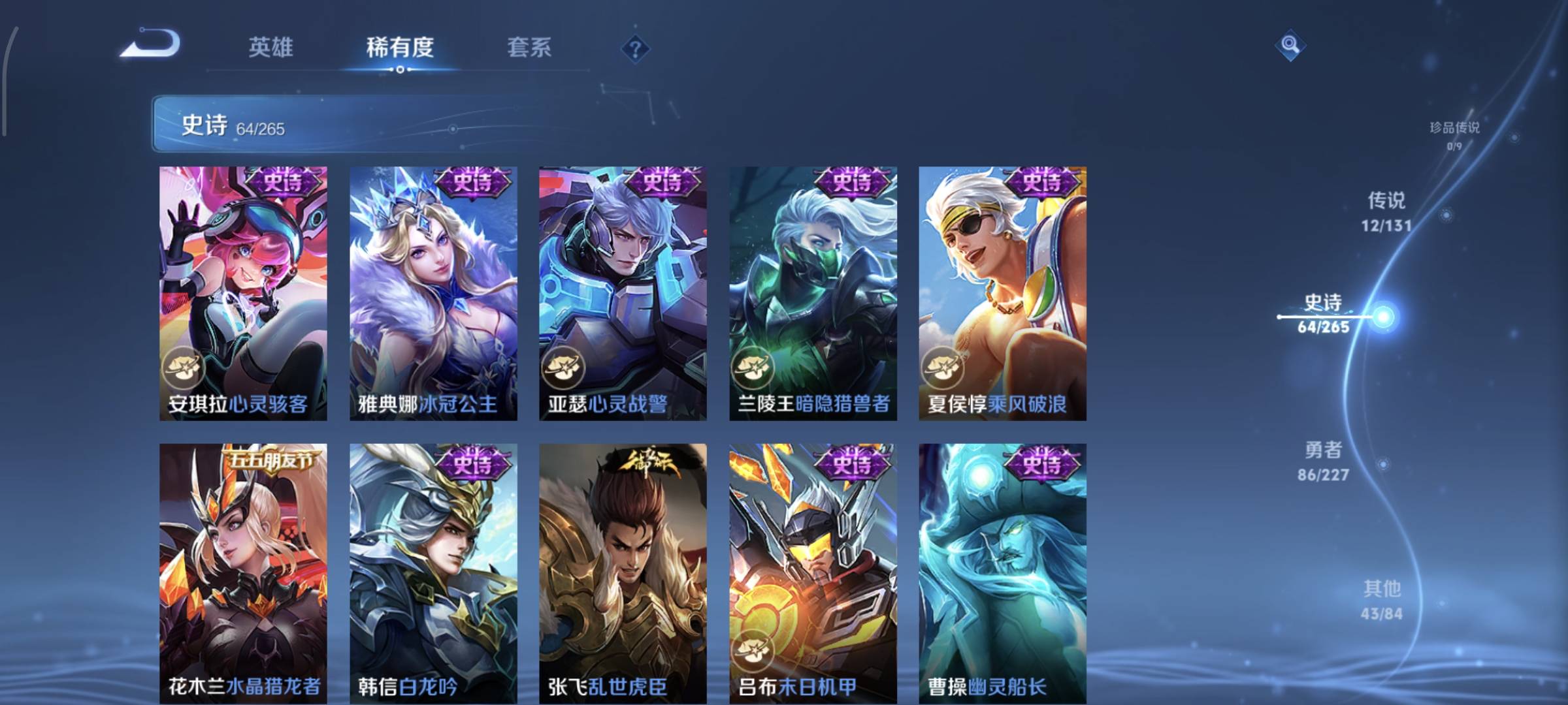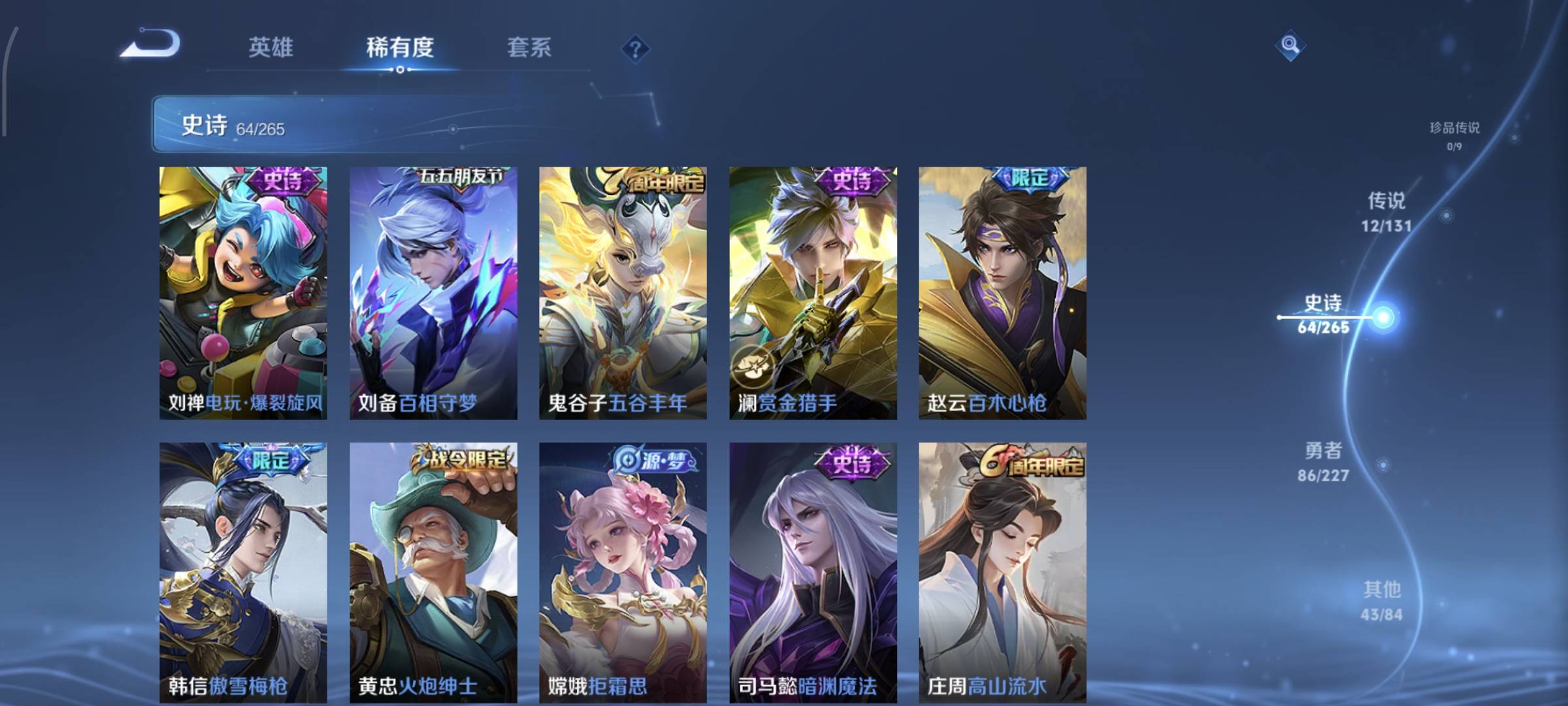 贵族等级:v8皮肤数:214荣耀典藏1 传说品质12 生肖限定2 情人节限定1 英雄数:123
