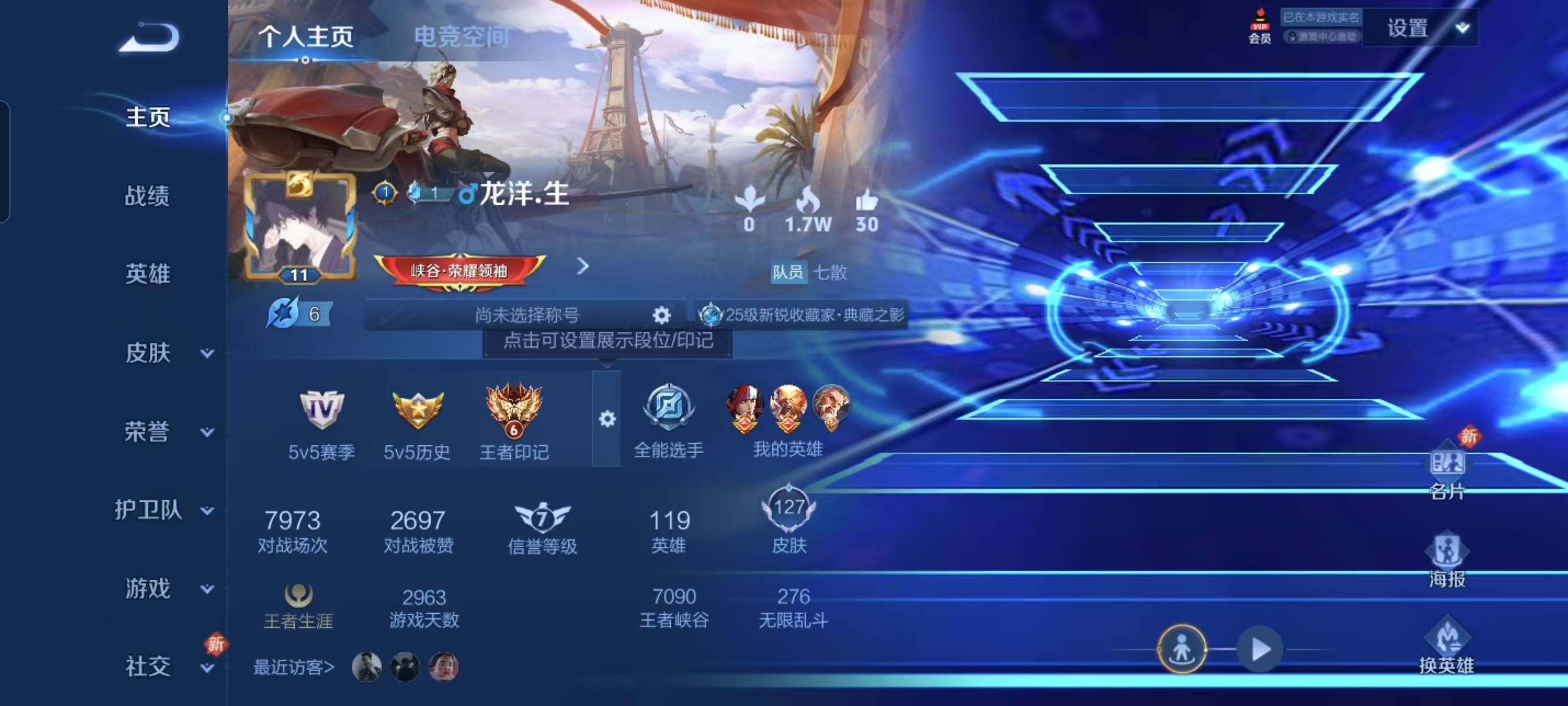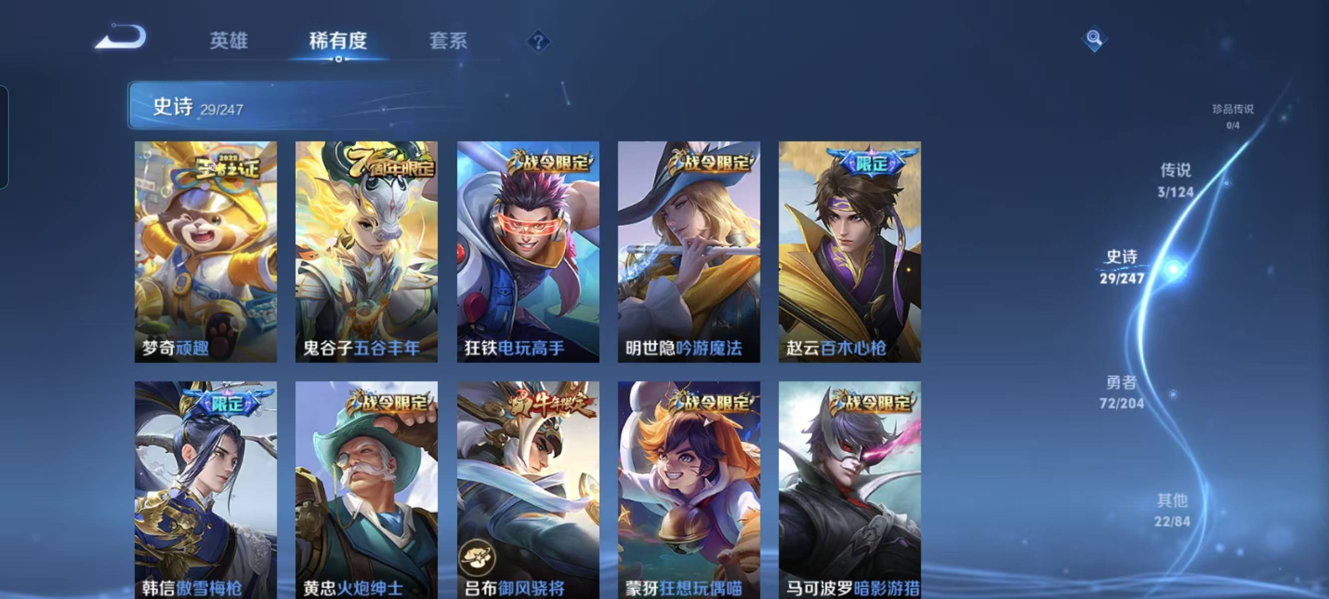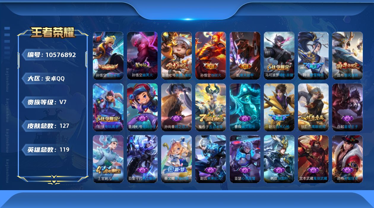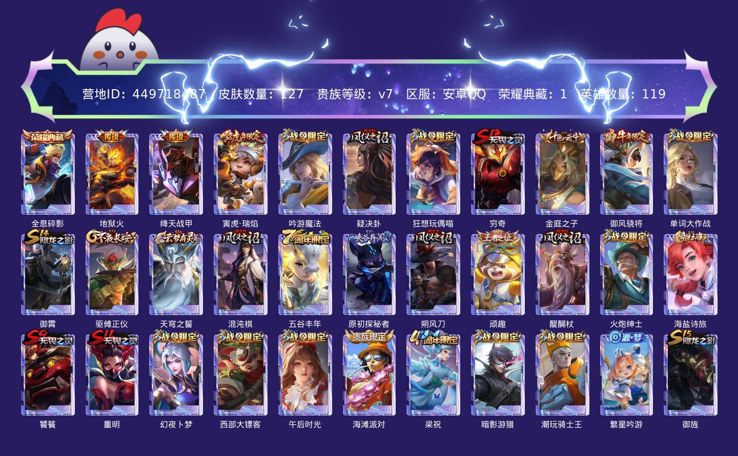 贵族等级:v7皮肤数:127荣耀典藏1 传说品质3 生肖限定2 英雄数:119