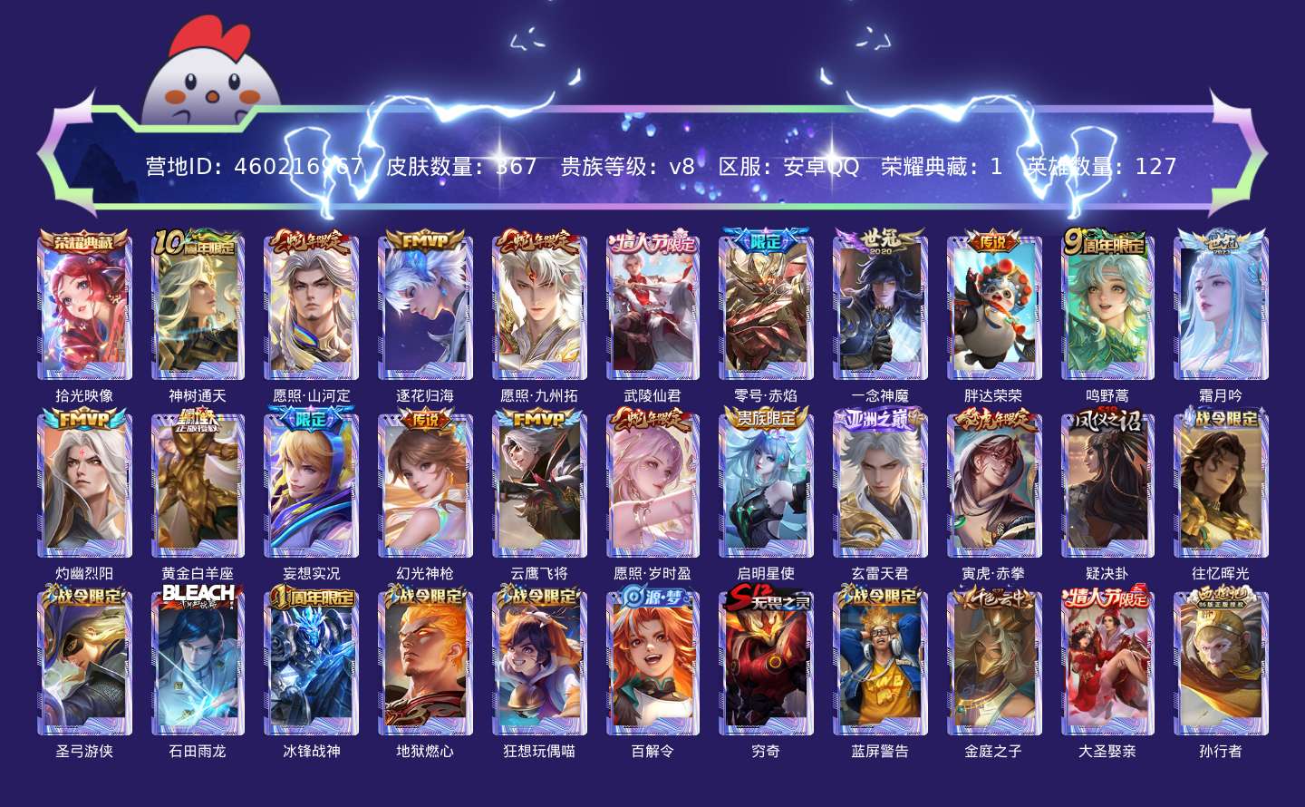 贵族等级:v8皮肤数:367传说品质19 生肖限定8 情人节限定4 荣耀典藏1 英雄数:127