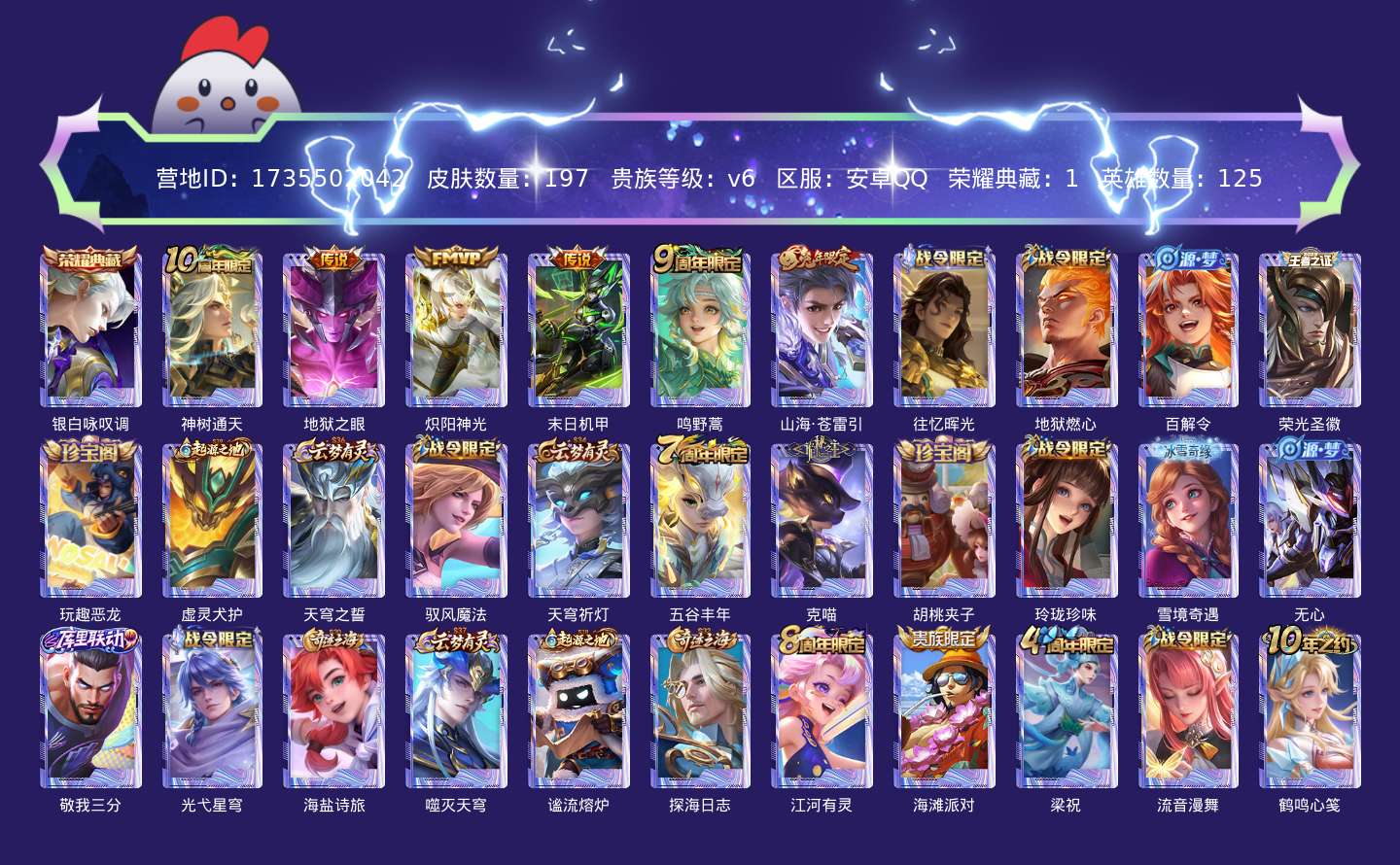 贵族等级:v6皮肤数:197传说品质6 生肖限定1 荣耀典藏1 英雄数:125