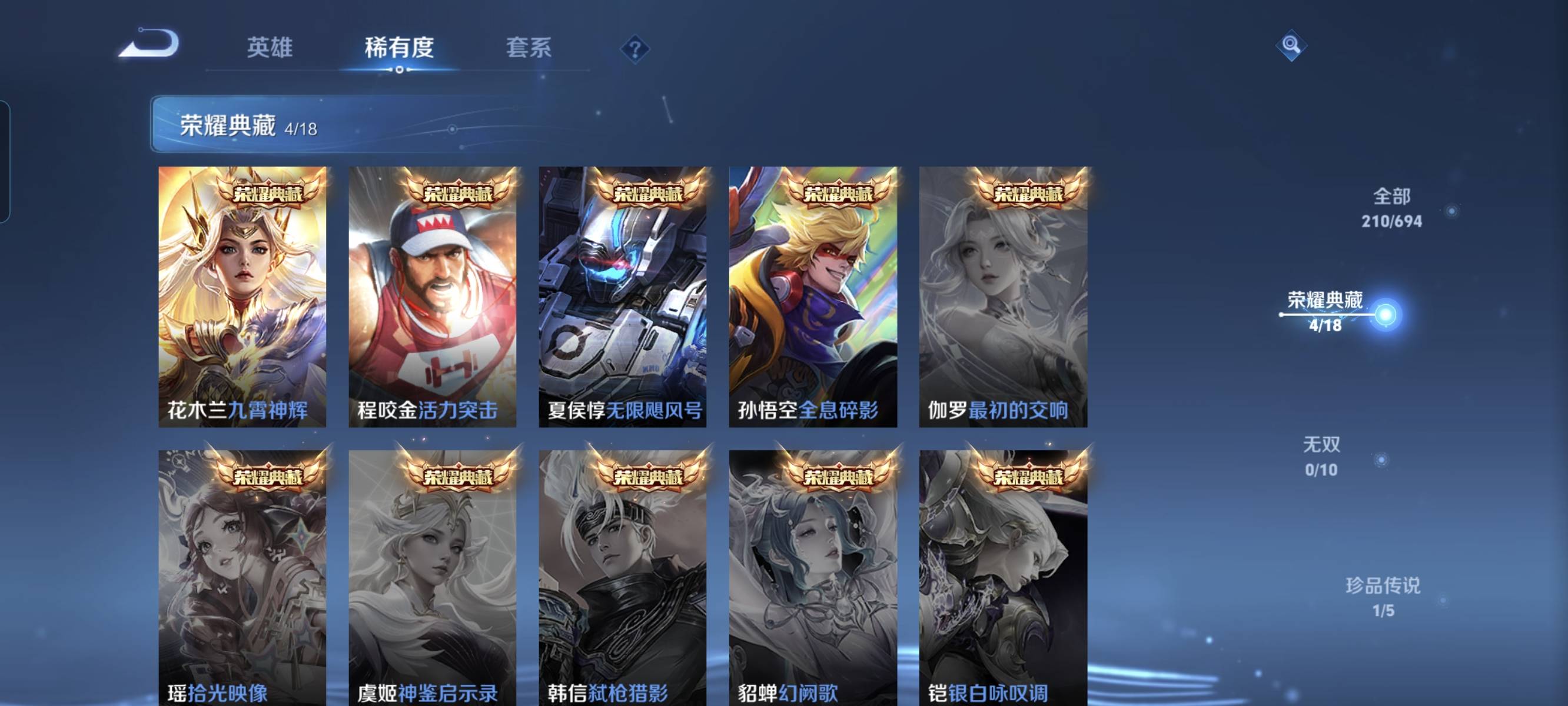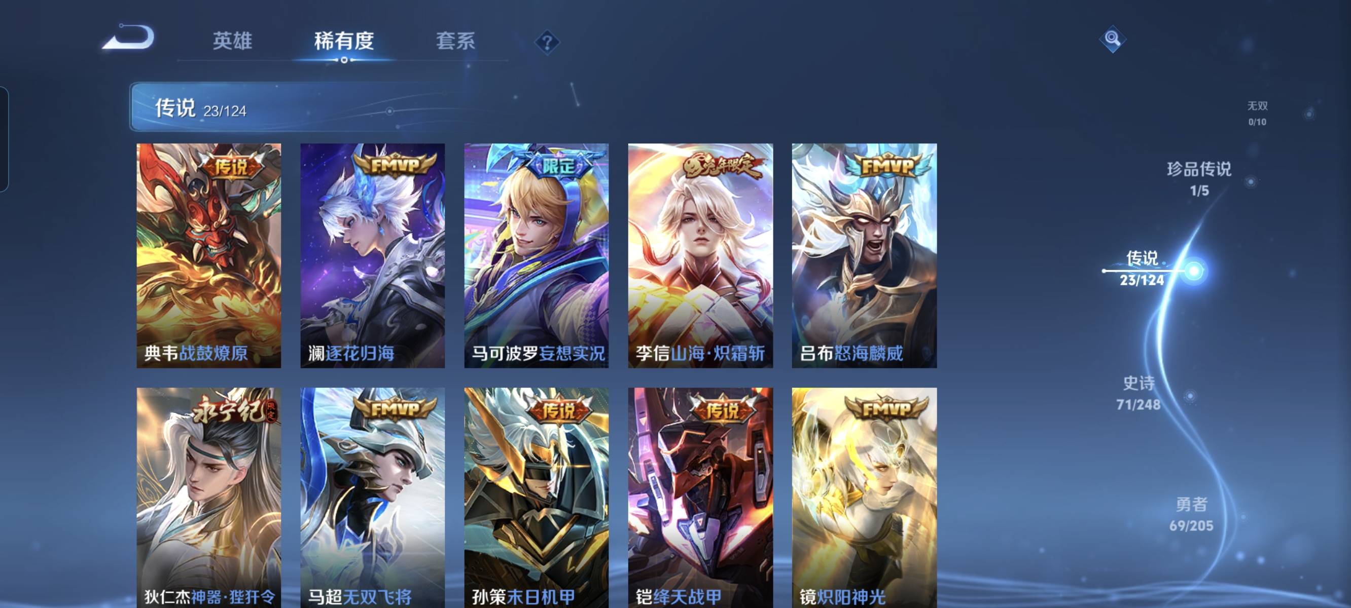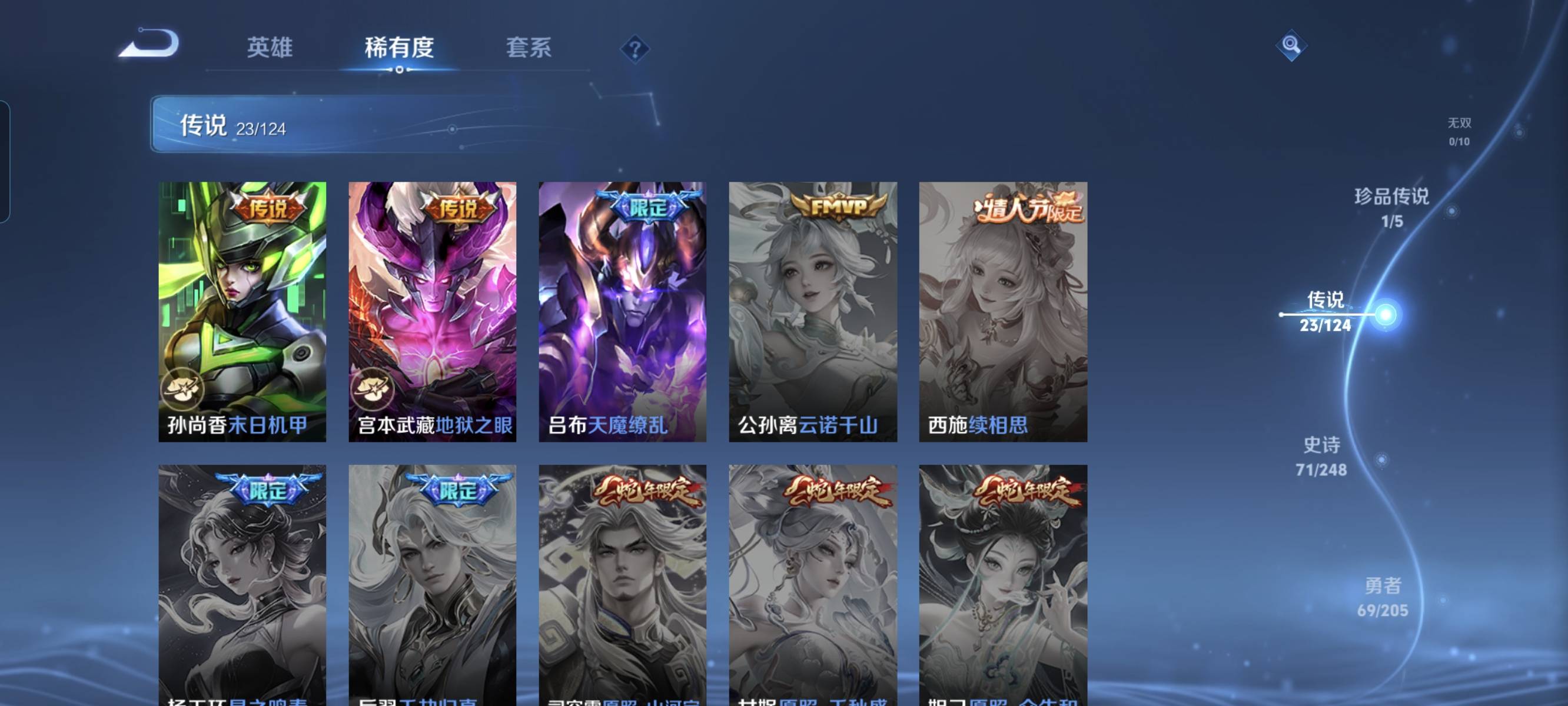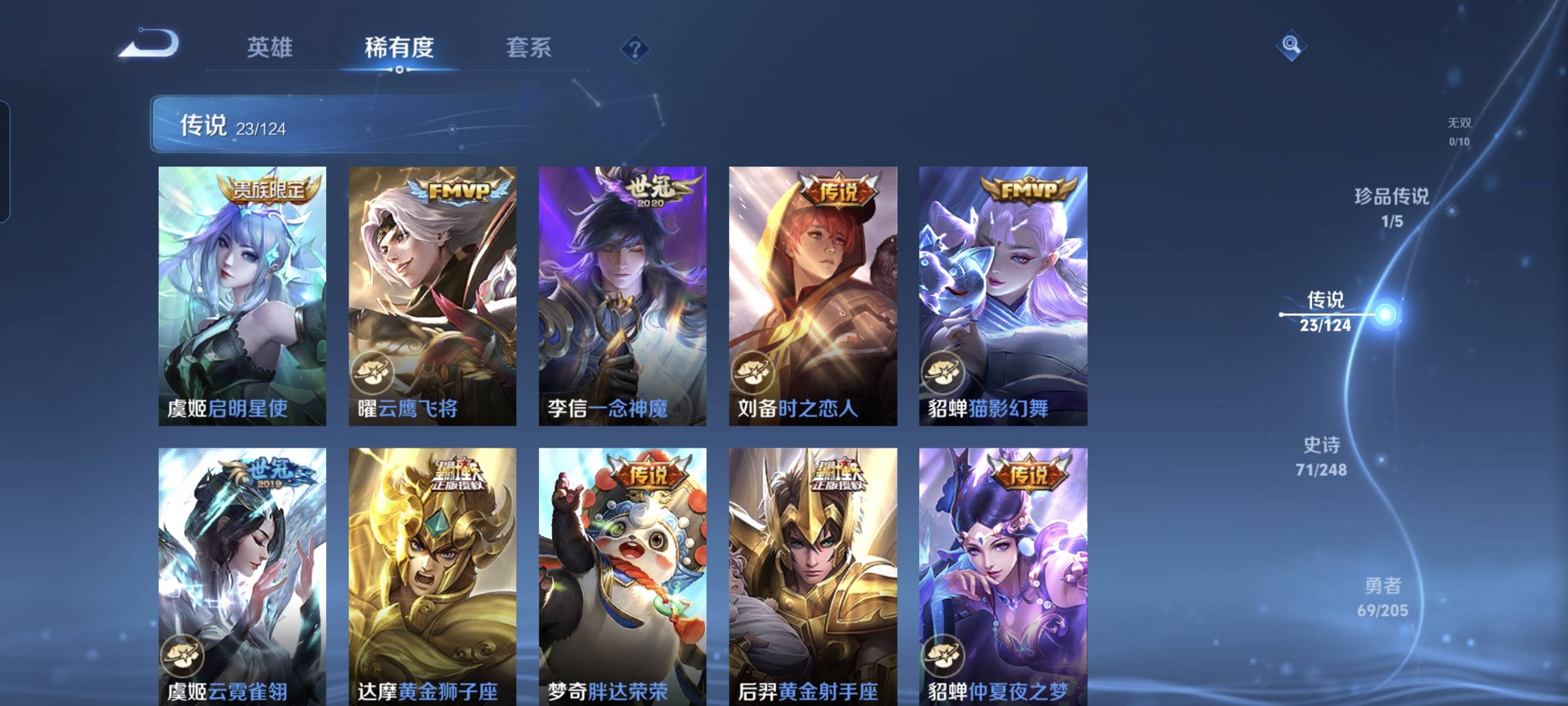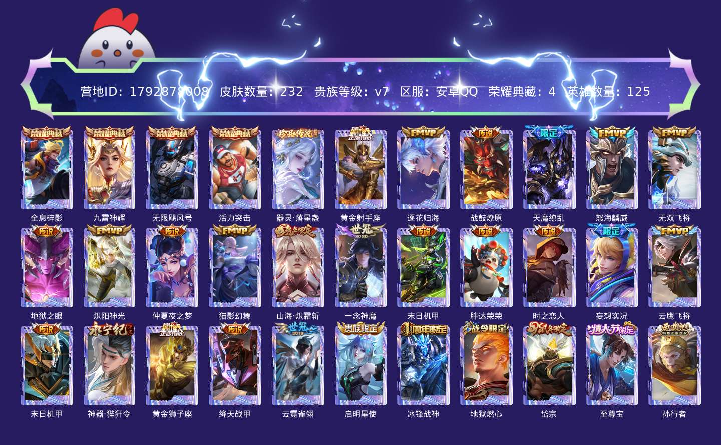 贵族等级:v7皮肤数:232传说品质23 生肖限定5 情人节限定1 荣耀典藏4 珍品传说1 英雄数:125