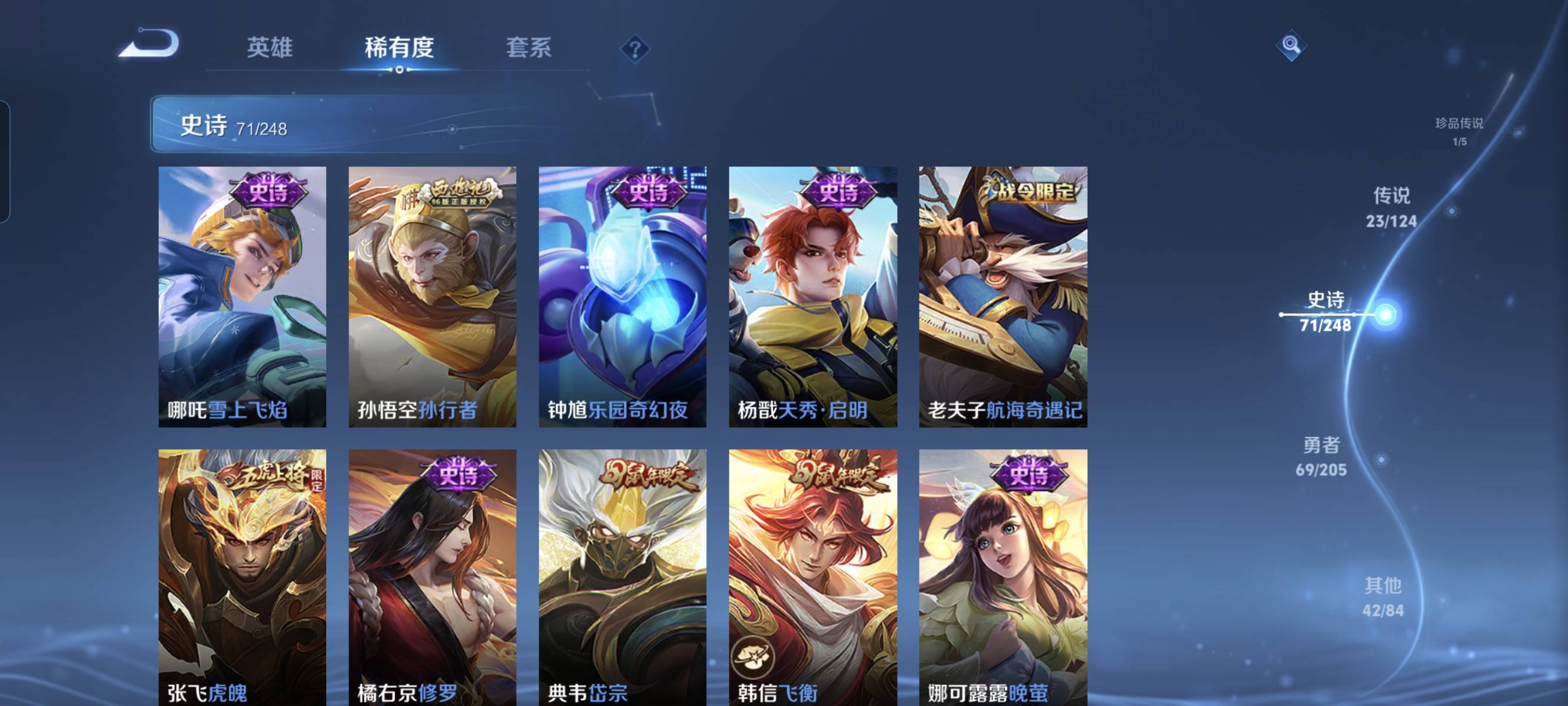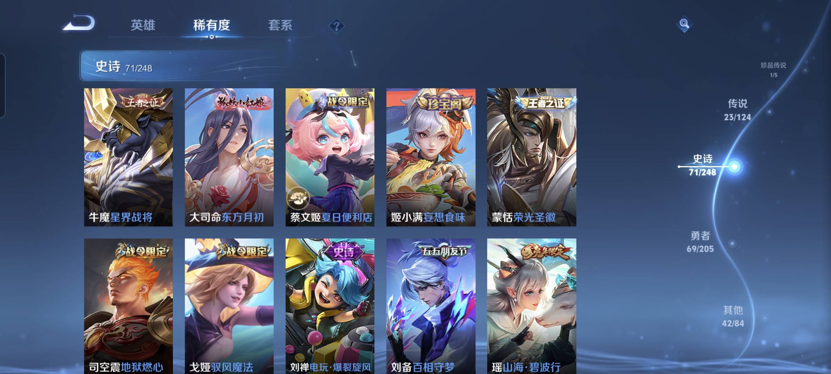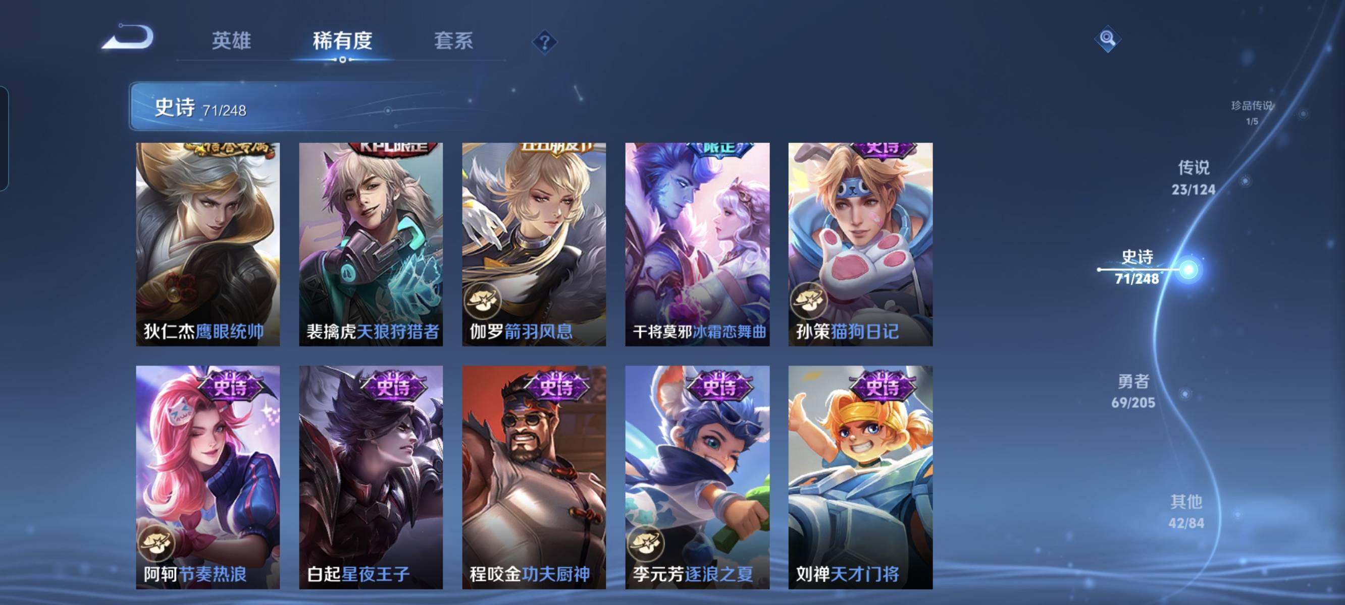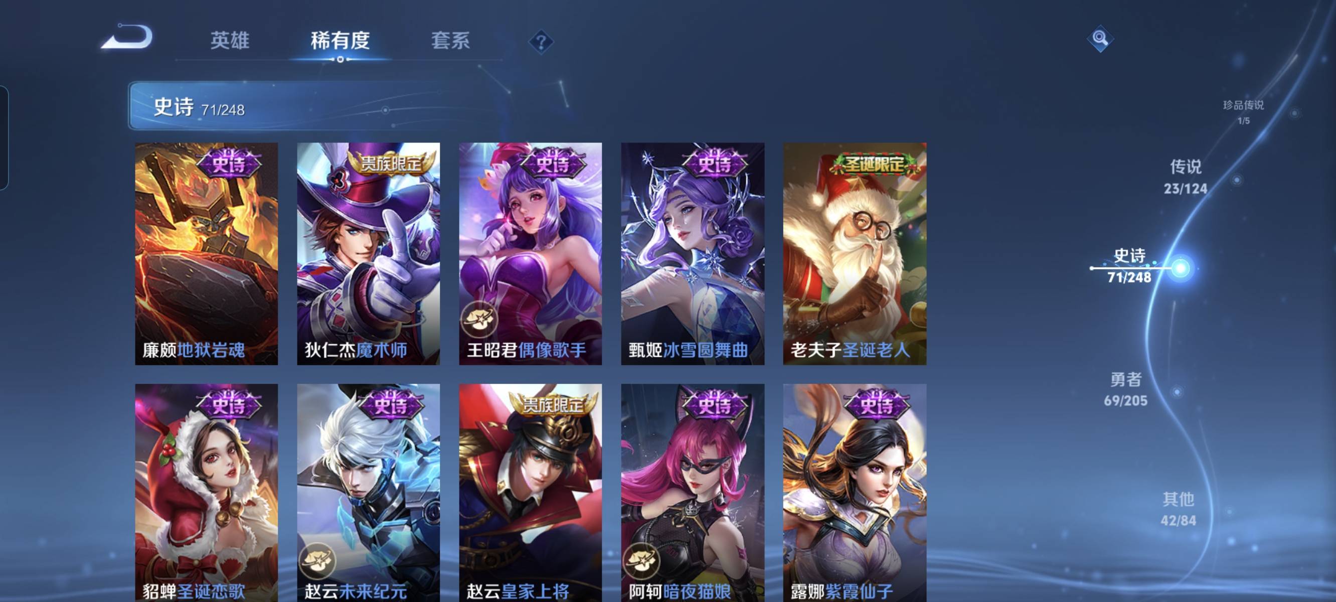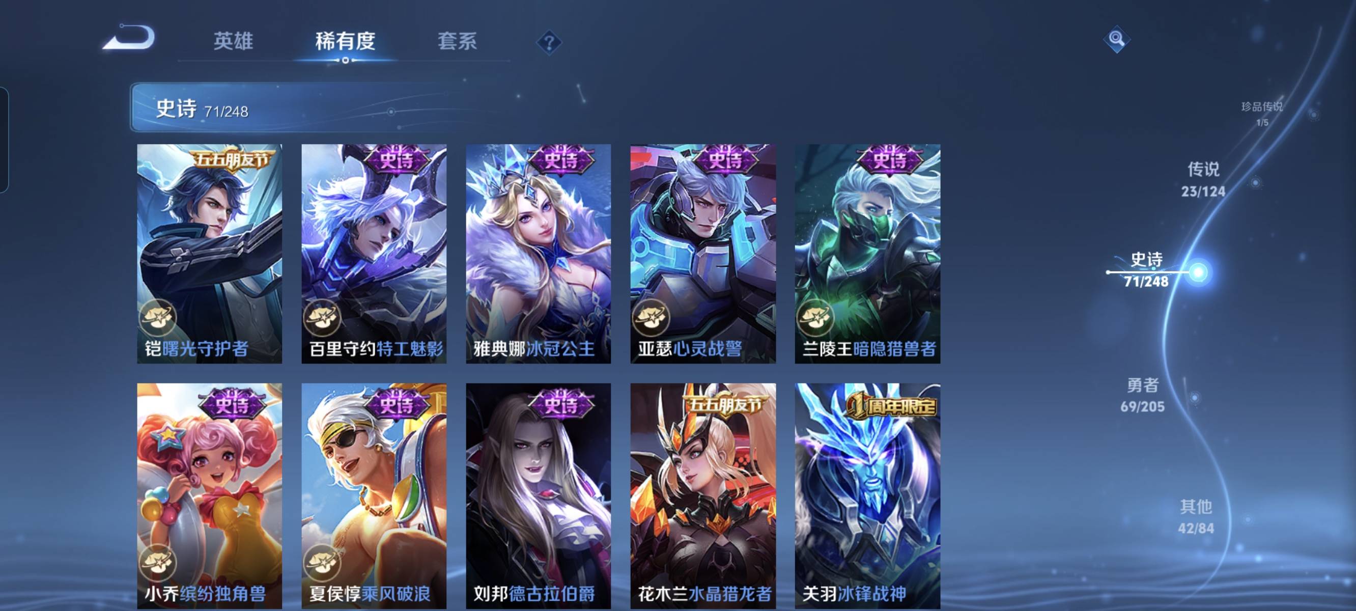 贵族等级:v7皮肤数:232传说品质23 生肖限定5 情人节限定1 荣耀典藏4 珍品传说1 英雄数:125