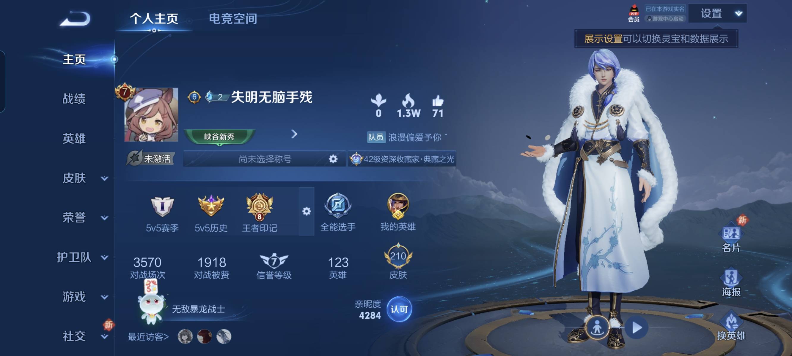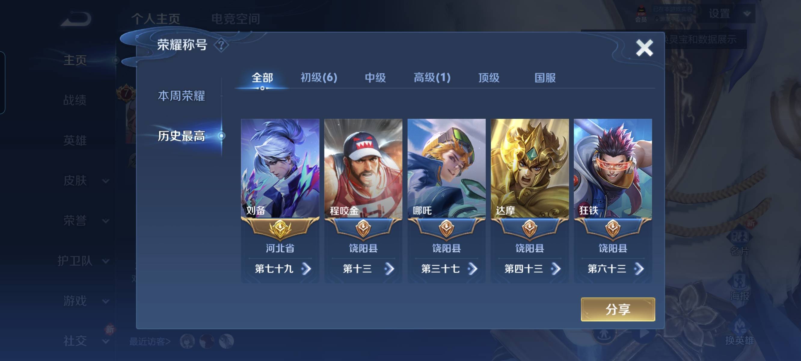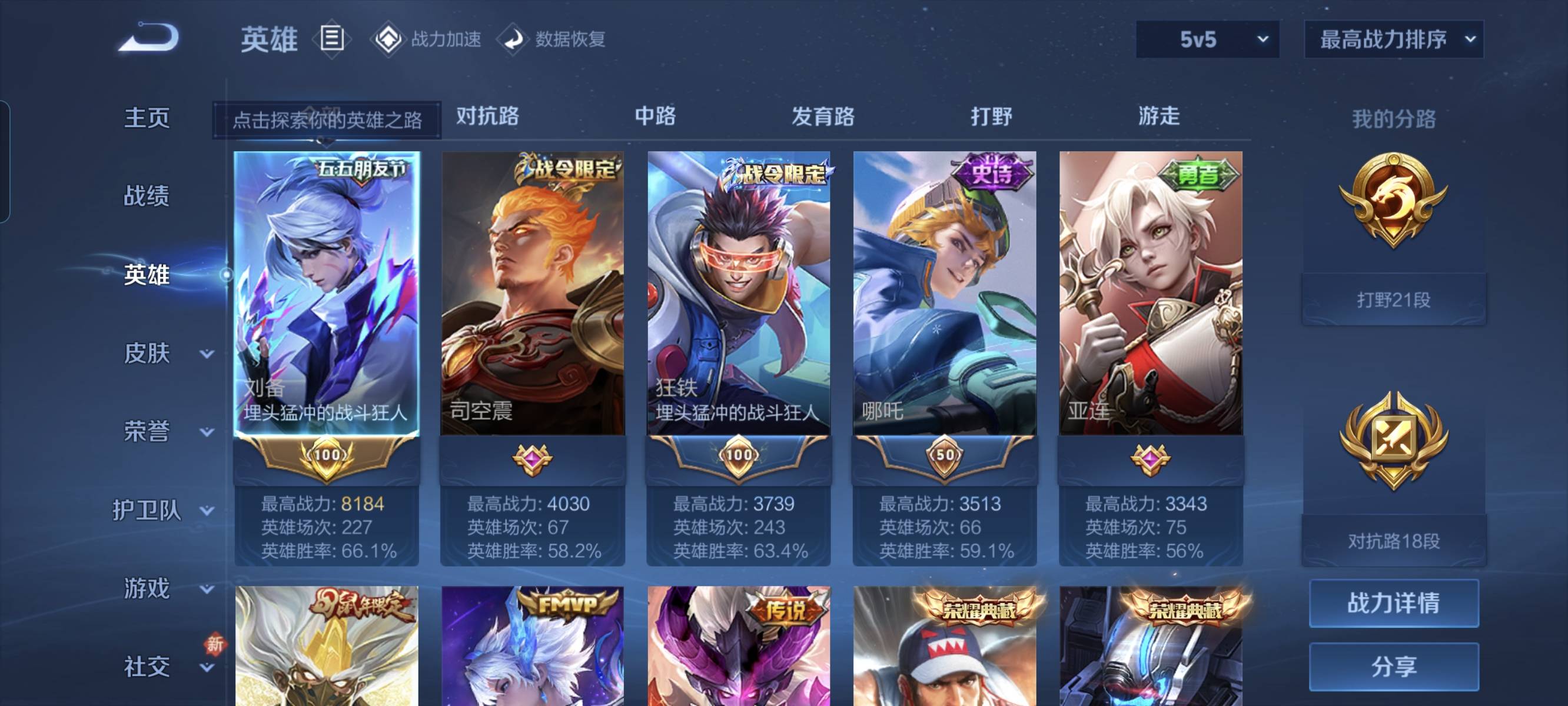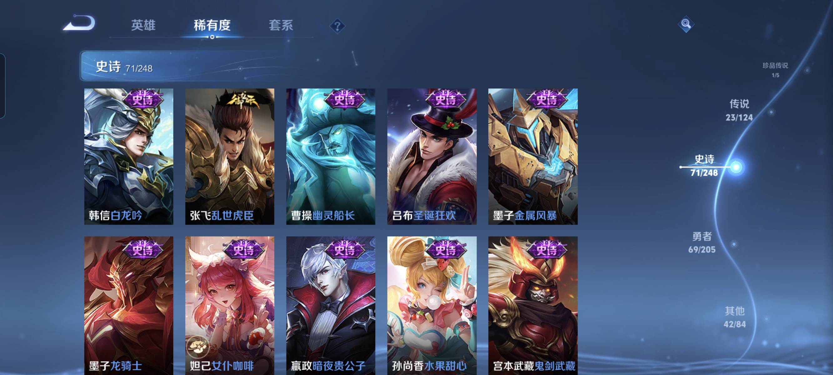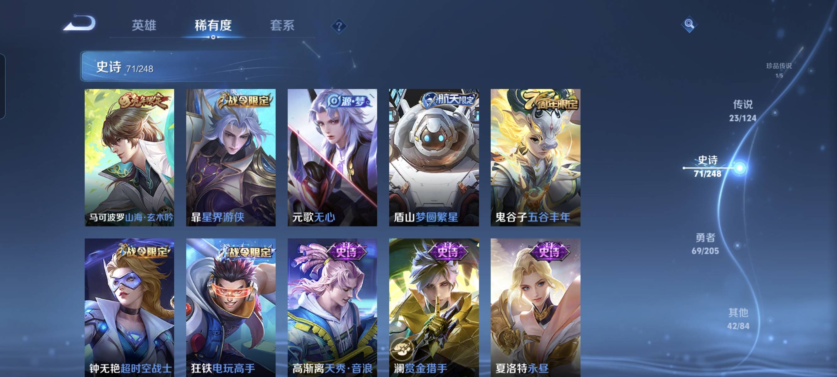 贵族等级:v7皮肤数:232传说品质23 生肖限定5 情人节限定1 荣耀典藏4 珍品传说1 英雄数:125
