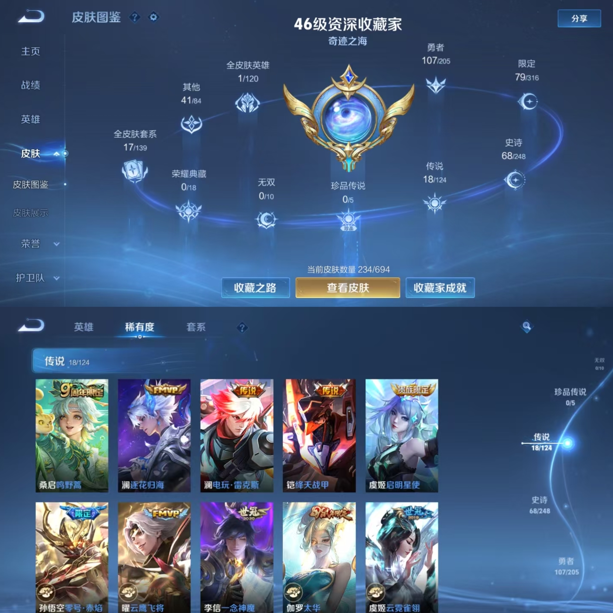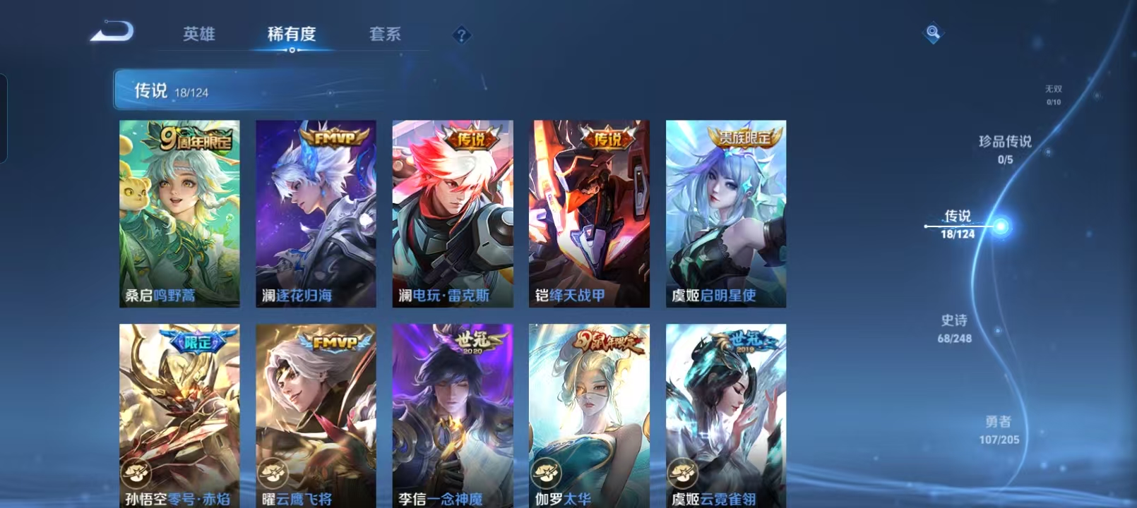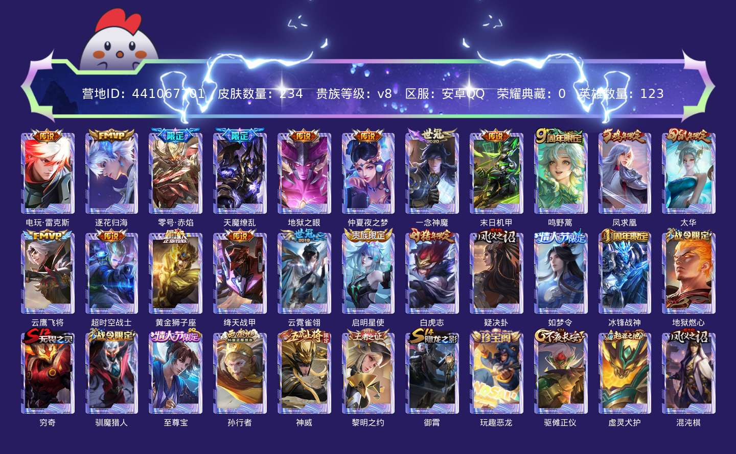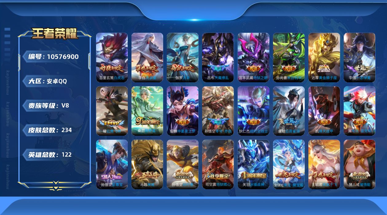 贵族等级:v8皮肤数:234情人节限定2 传说品质18 生肖限定6 英雄数:123