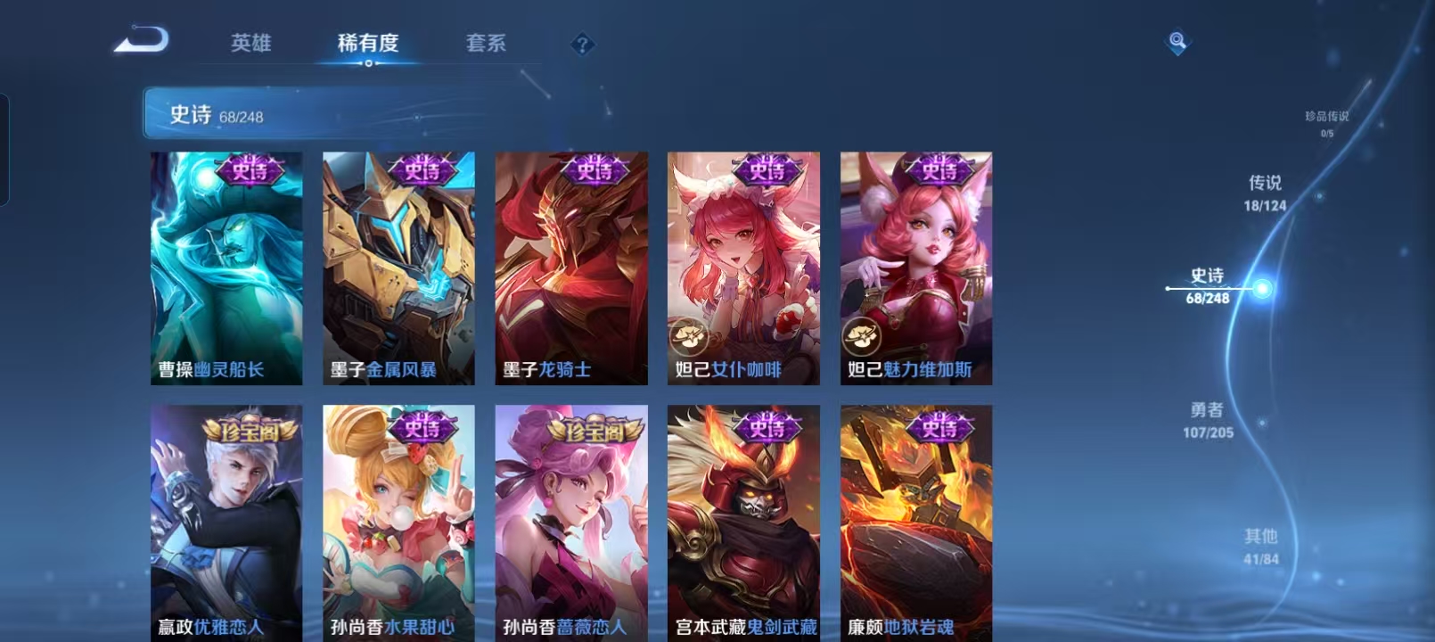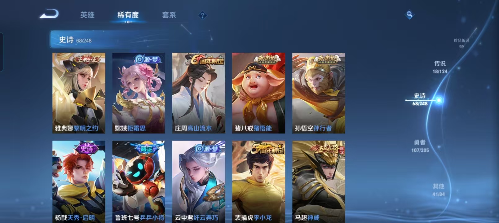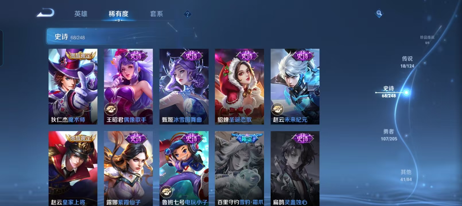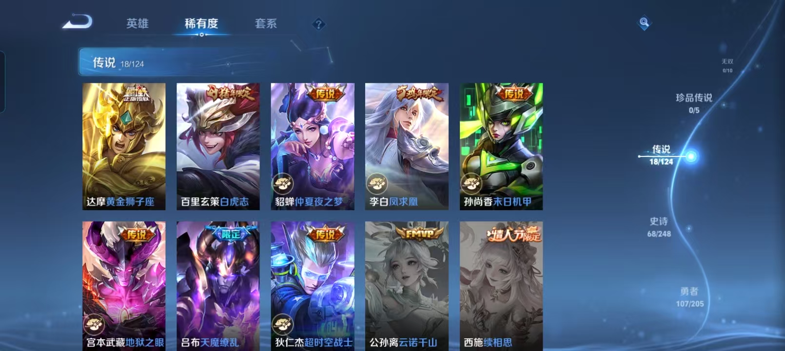 贵族等级:v8皮肤数:234情人节限定2 传说品质18 生肖限定6 英雄数:123