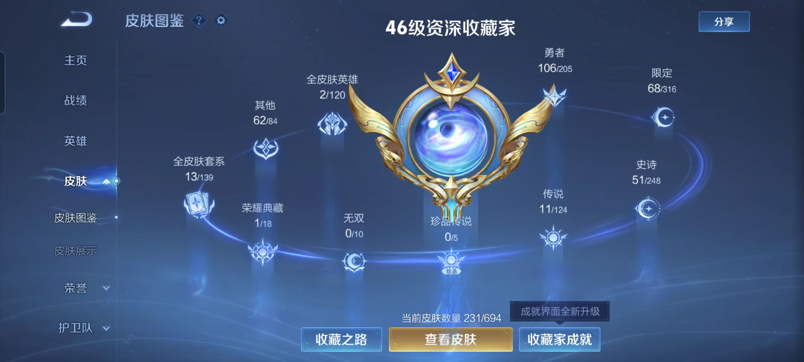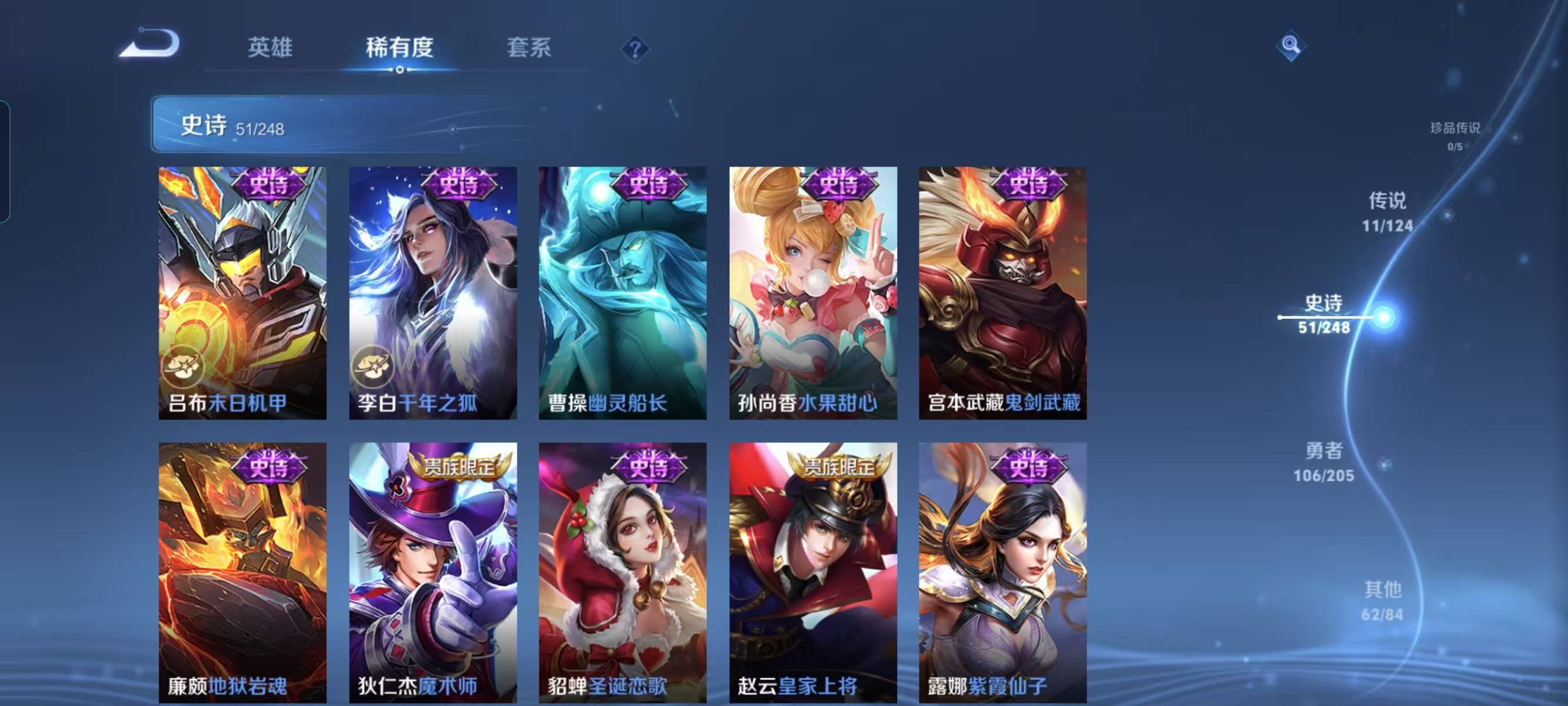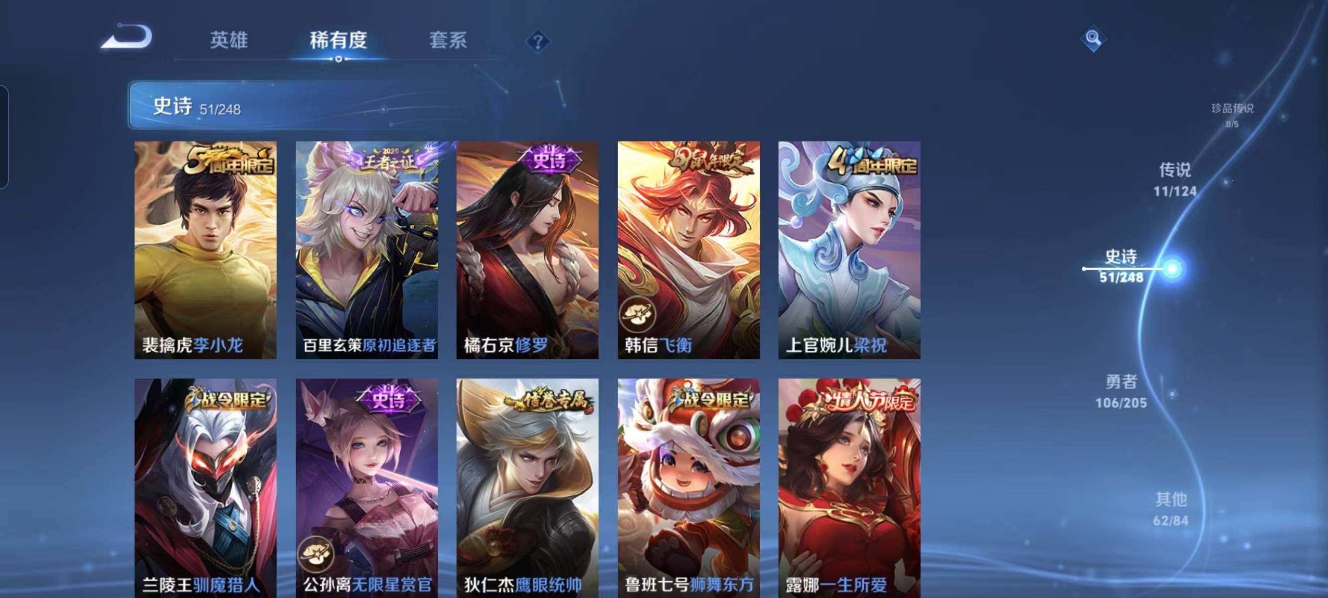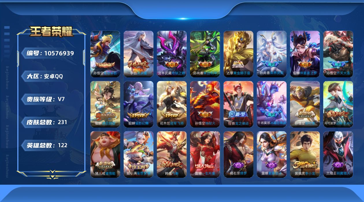 贵族等级:v7皮肤数:231荣耀典藏1 传说品质11 情人节限定1 生肖限定3 英雄数:122