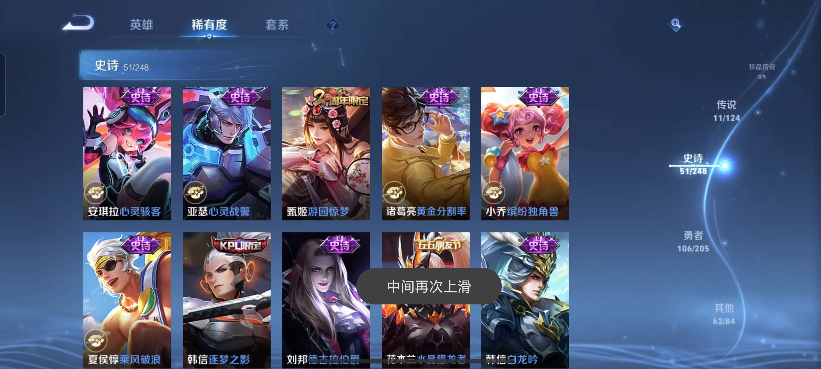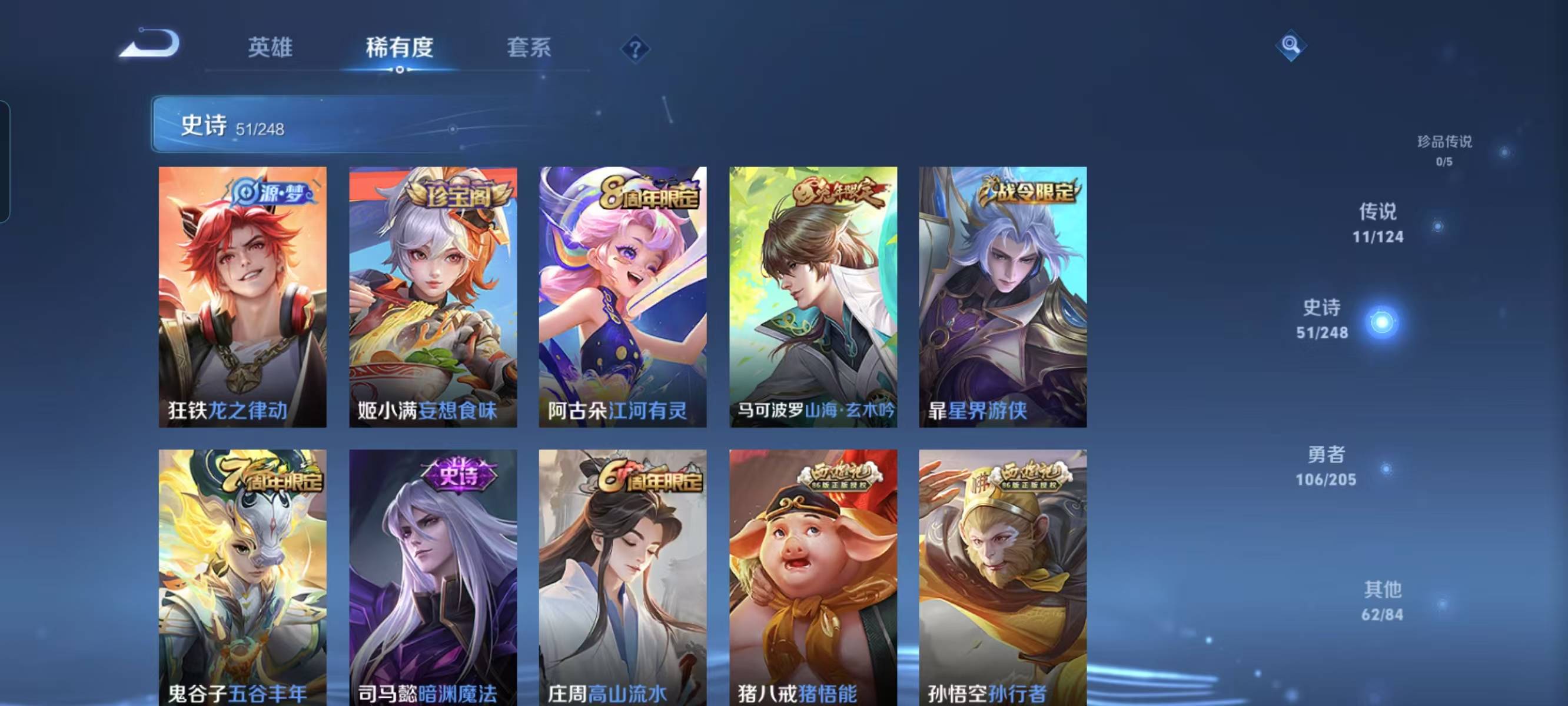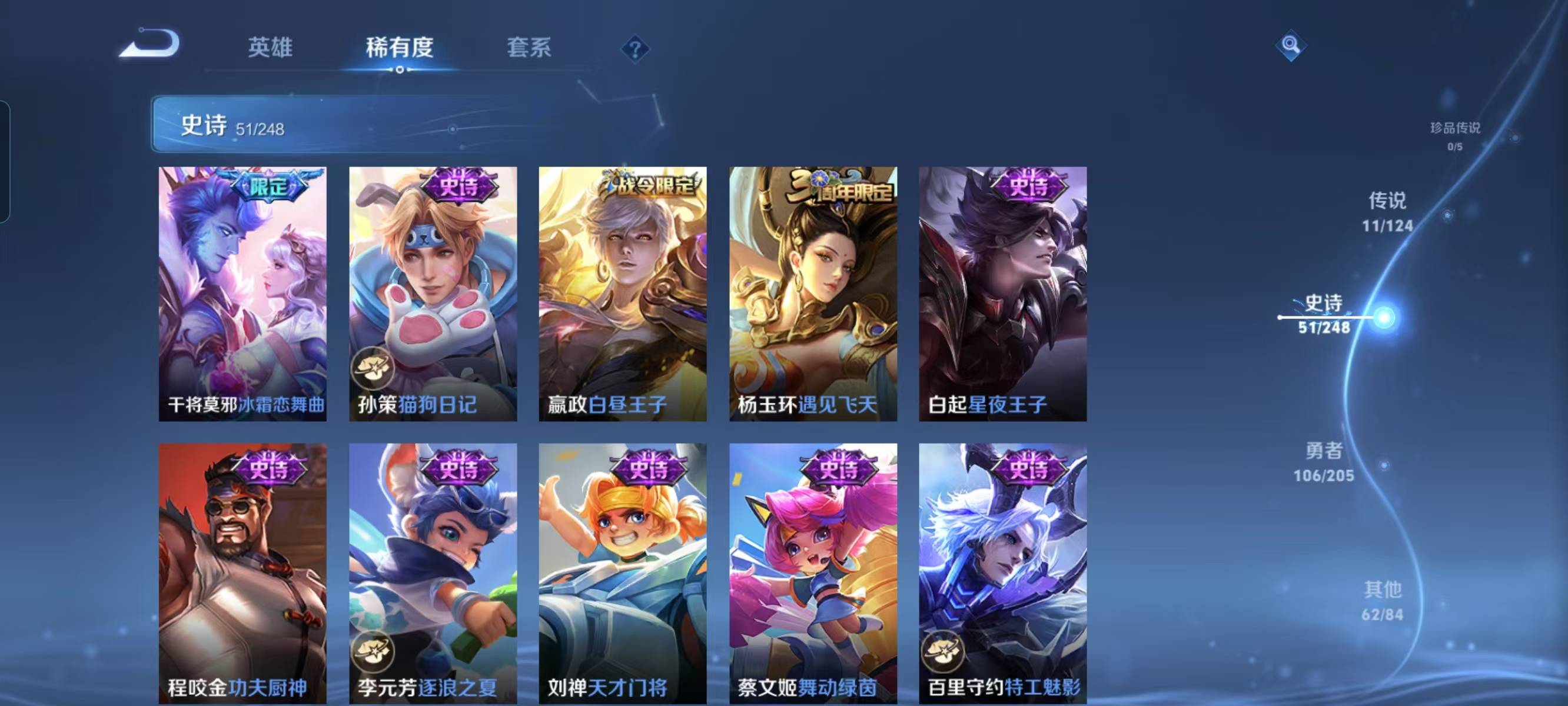 贵族等级:v7皮肤数:231荣耀典藏1 传说品质11 情人节限定1 生肖限定3 英雄数:122