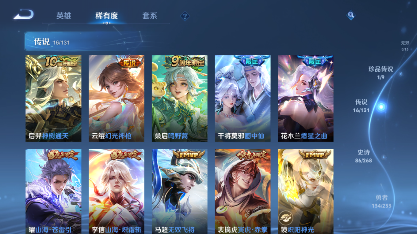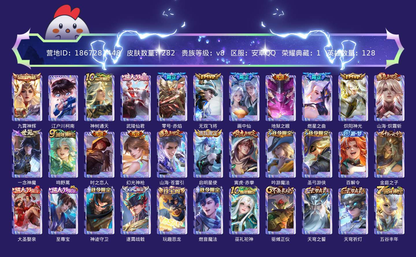 贵族等级:v8皮肤数:282传说品质16 情人节限定4 荣耀典藏1 生肖限定4 珍品传说1 英雄数:128