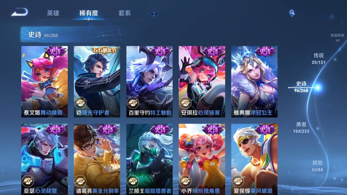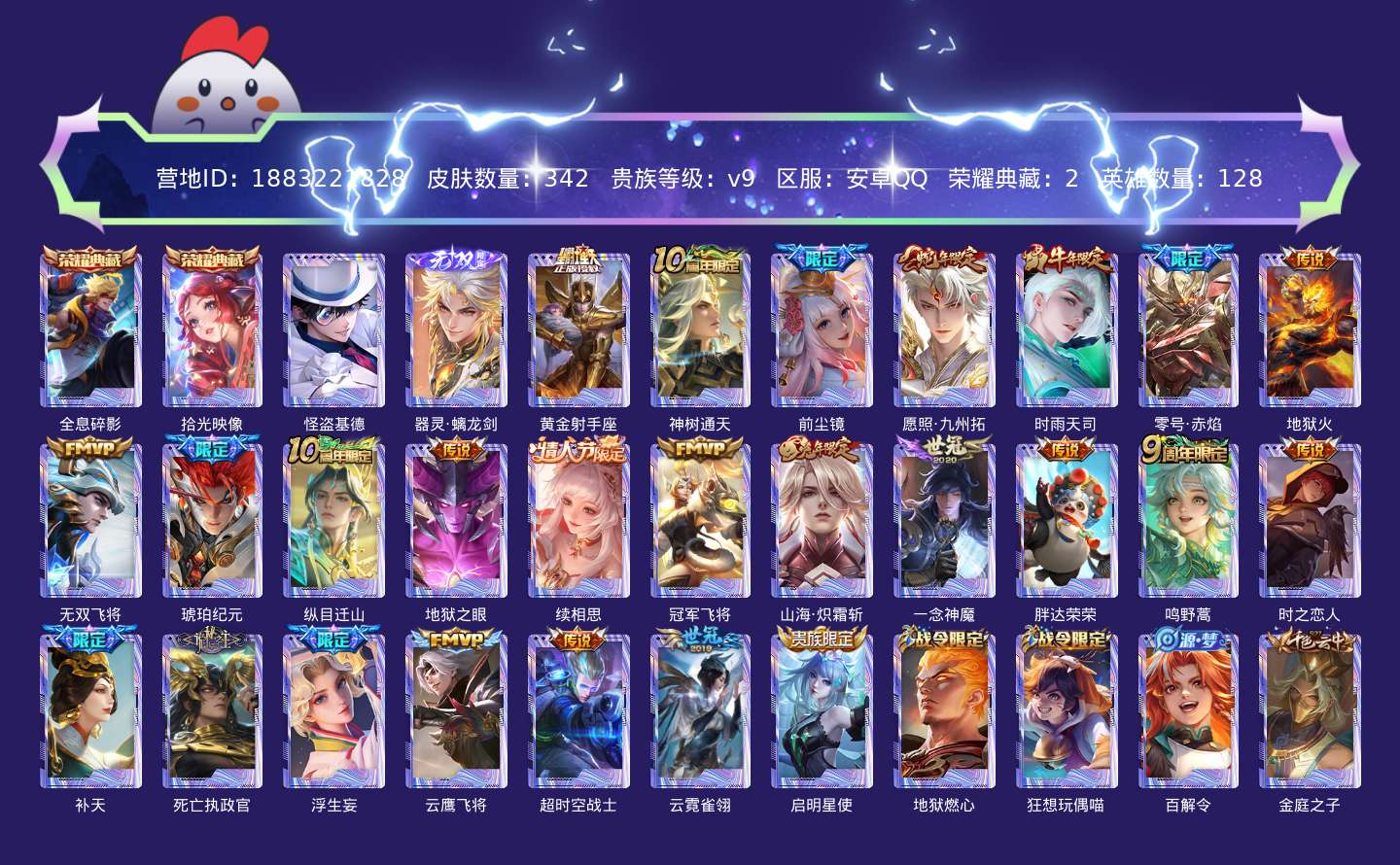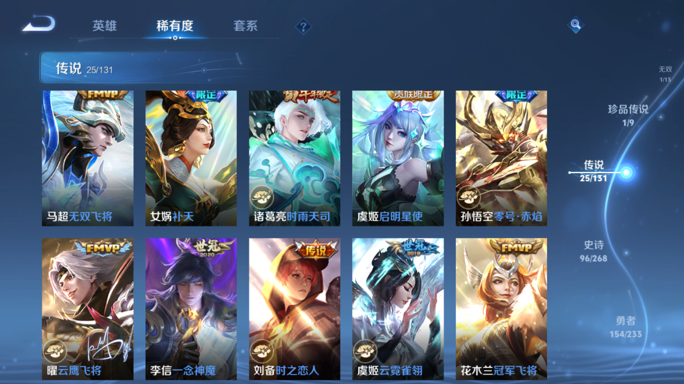 贵族等级:v9皮肤数:342传说品质25 生肖限定3 荣耀典藏2 情人节限定1 珍品传说1 无双1 英雄数:128