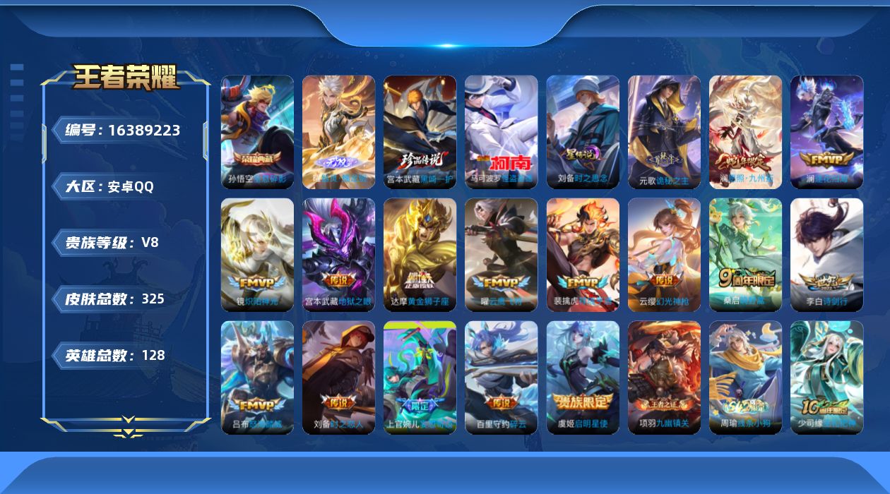 贵族等级:v8皮肤数:325传说品质17 生肖限定3 情人节限定2 荣耀典藏1 珍品传说2 无双1 英雄数:128