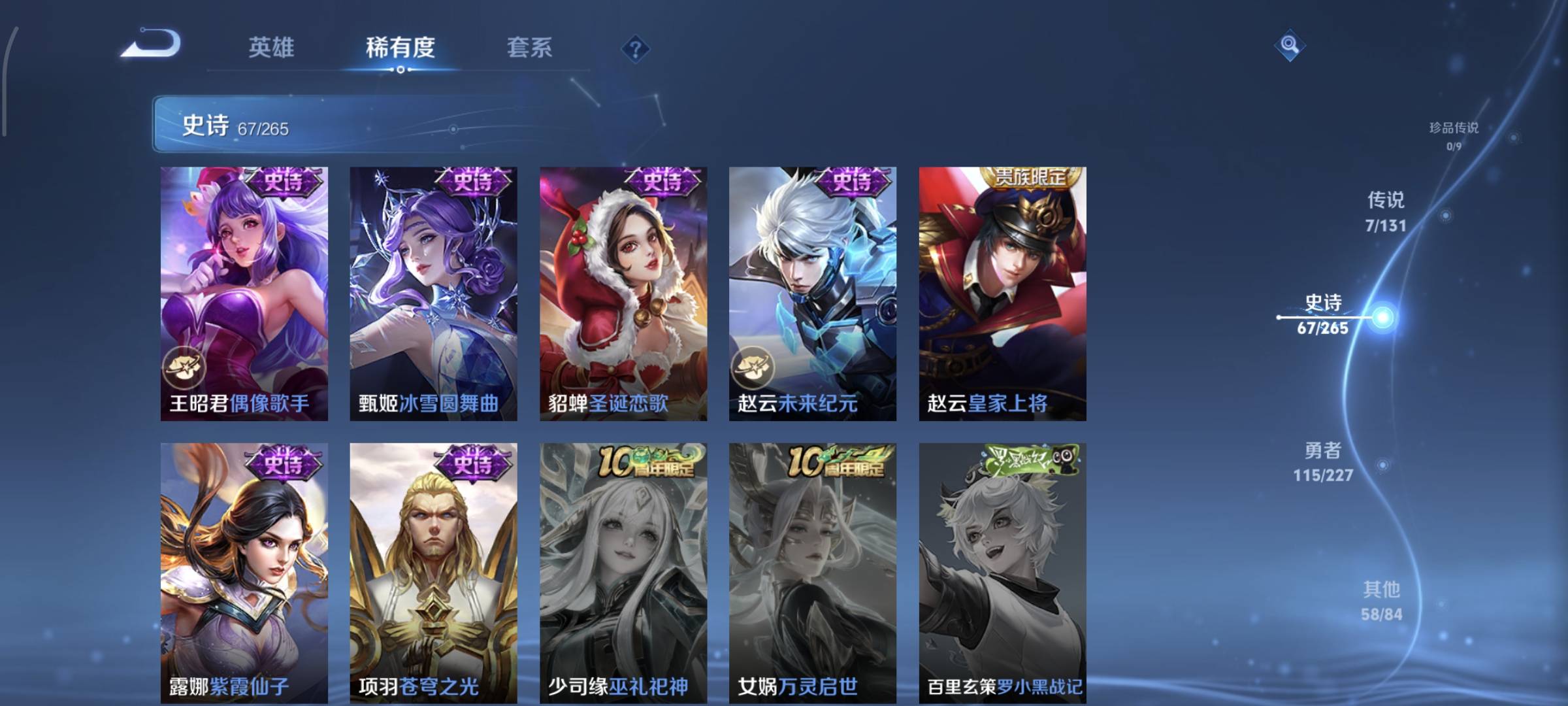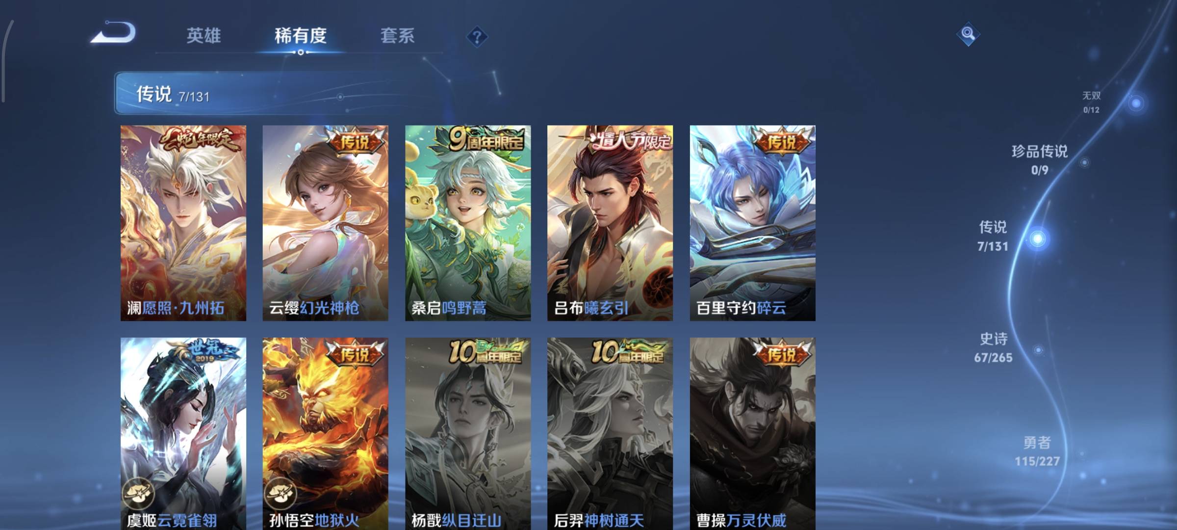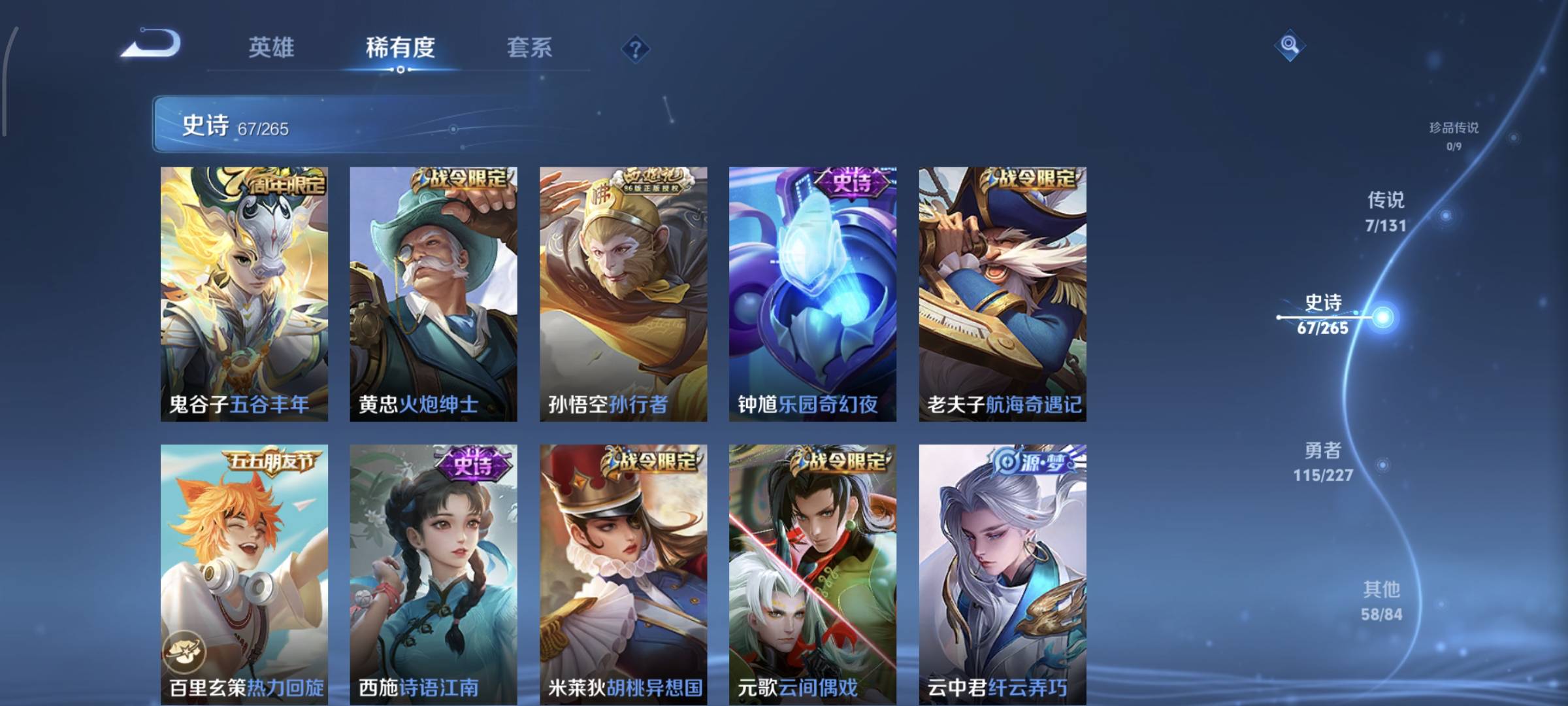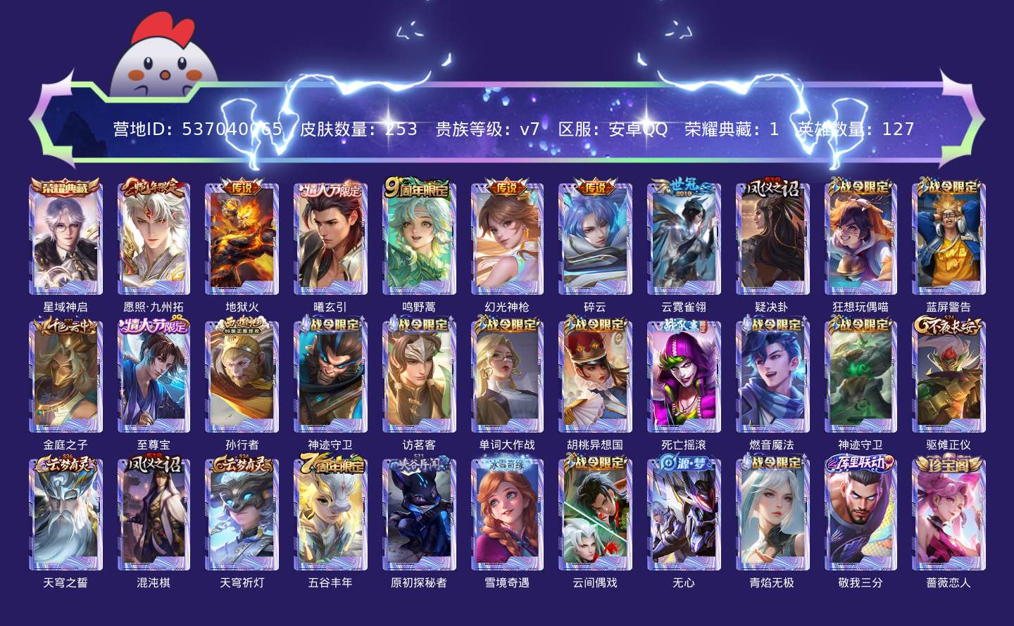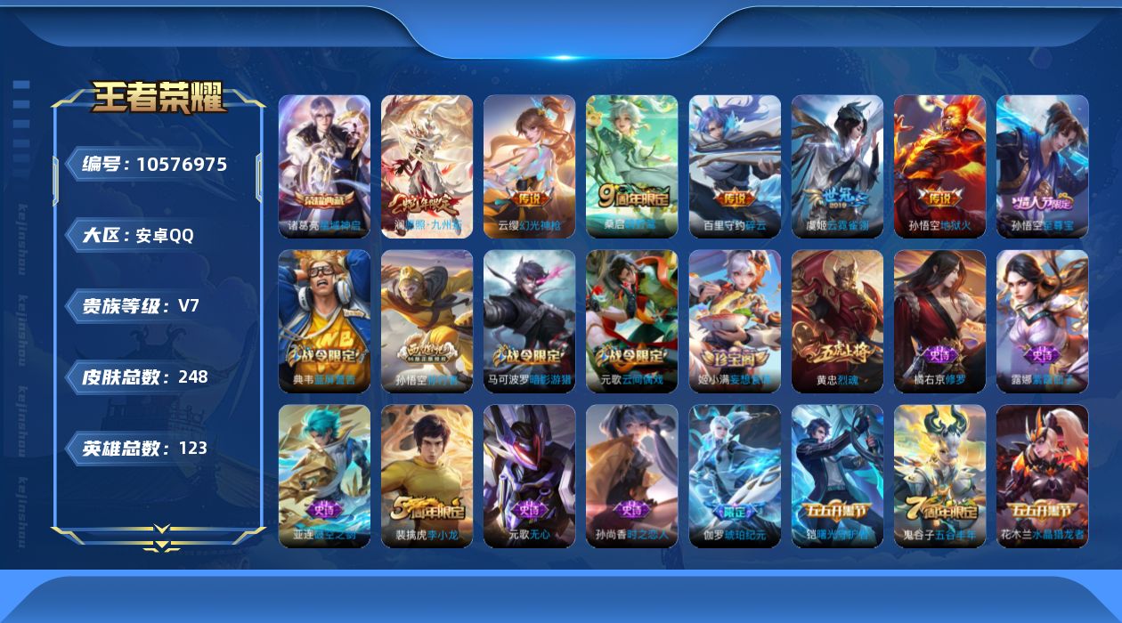 贵族等级:v7皮肤数:253传说品质7 生肖限定1 荣耀典藏1 情人节限定2 英雄数:127