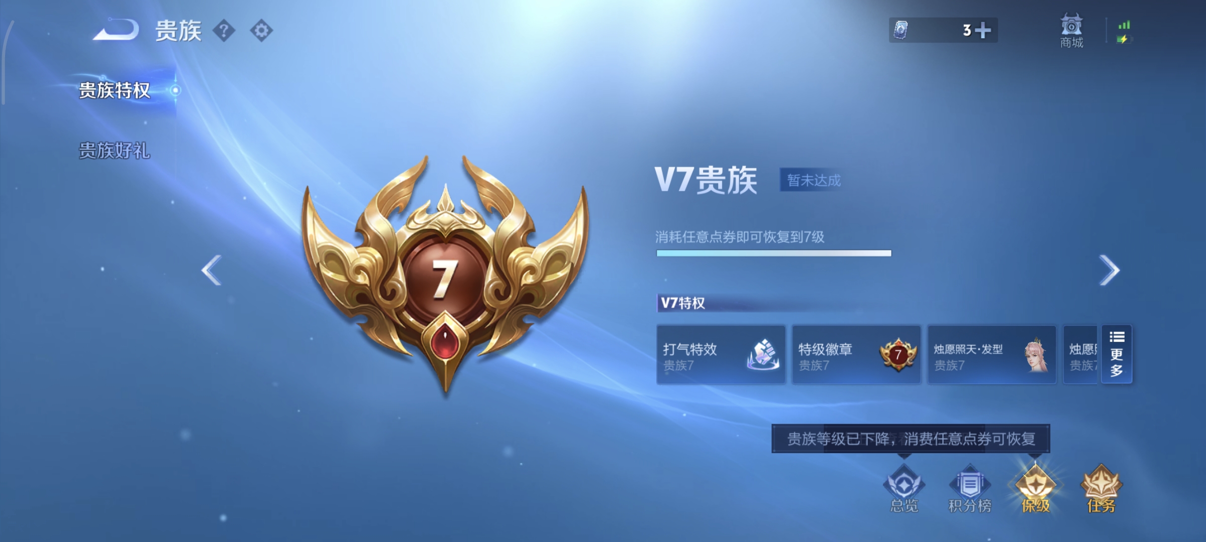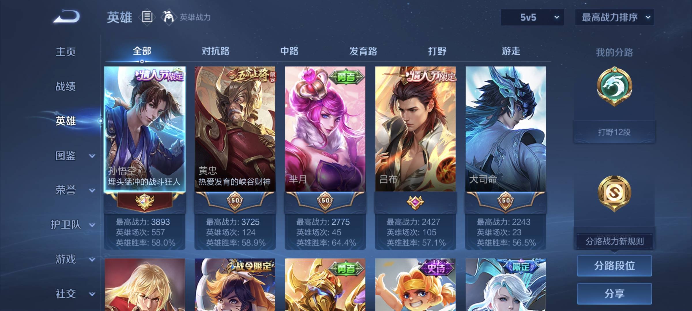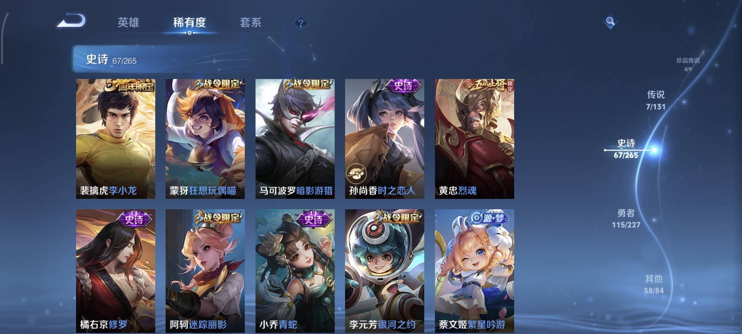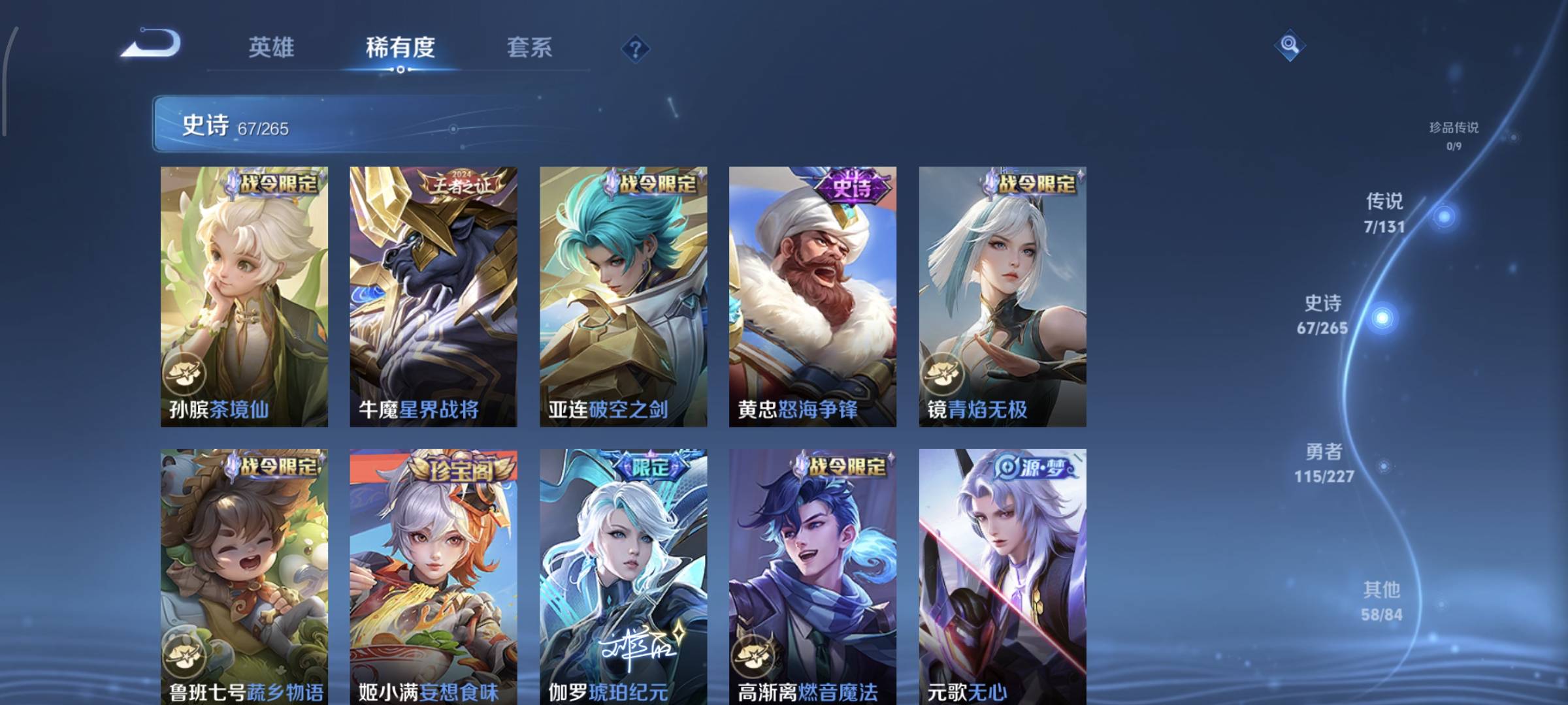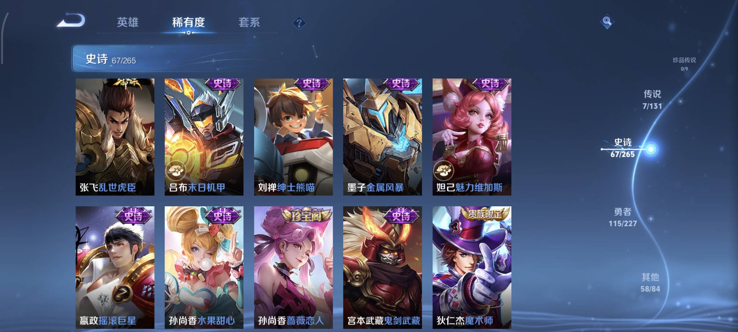 贵族等级:v7皮肤数:253传说品质7 生肖限定1 荣耀典藏1 情人节限定2 英雄数:127