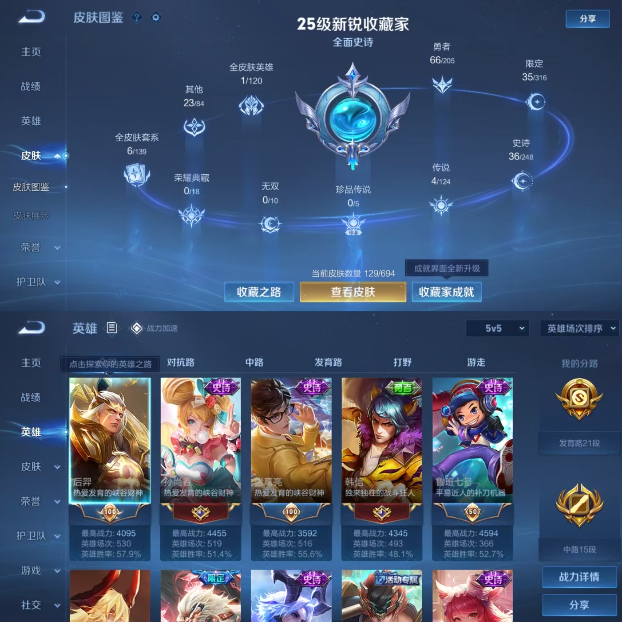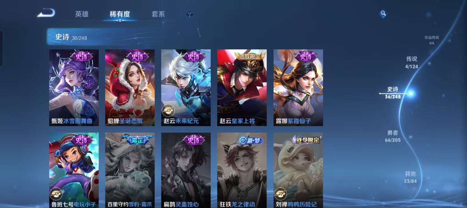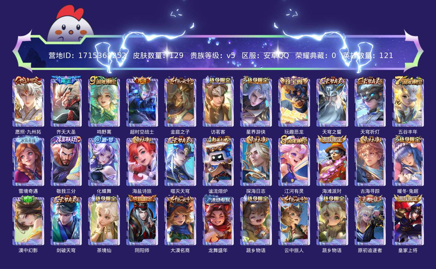 贵族等级:v5皮肤数:129传说品质4 生肖限定1 英雄数:121