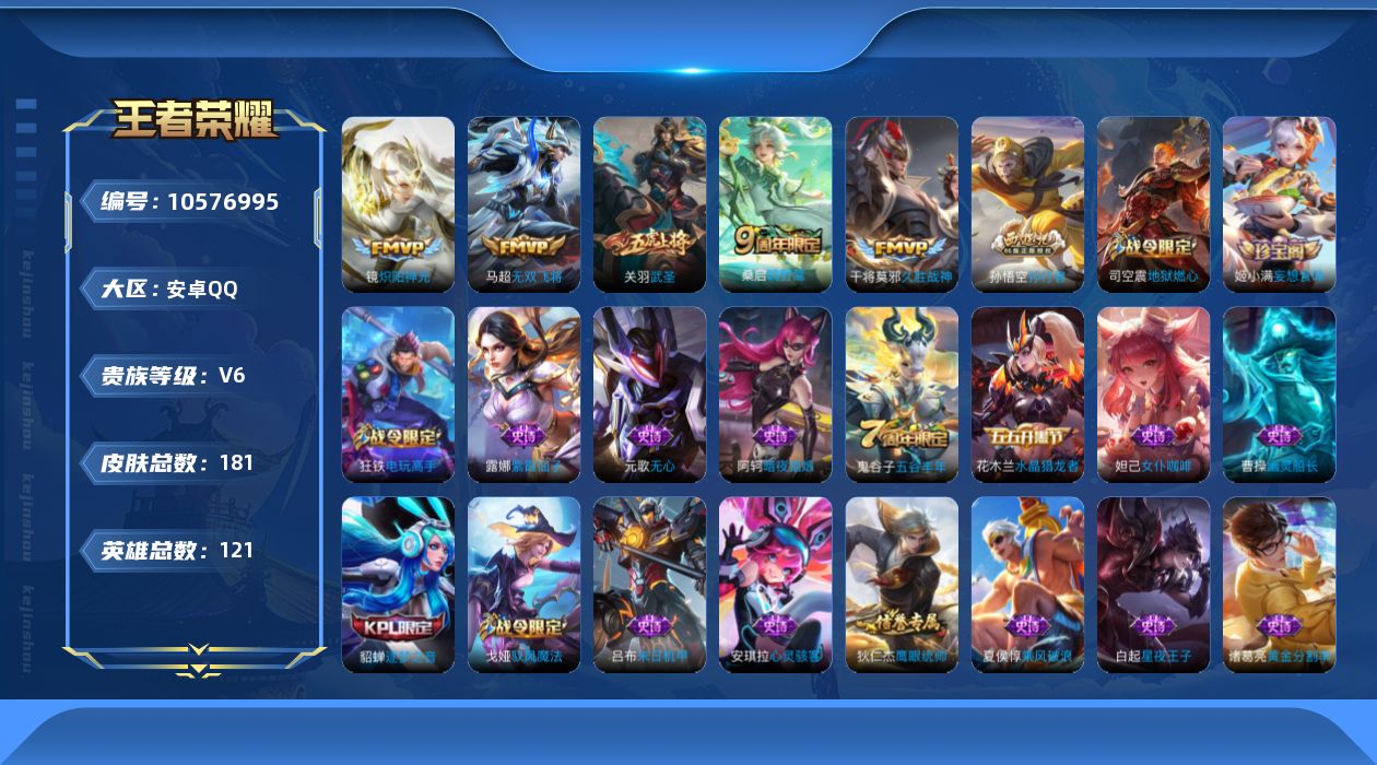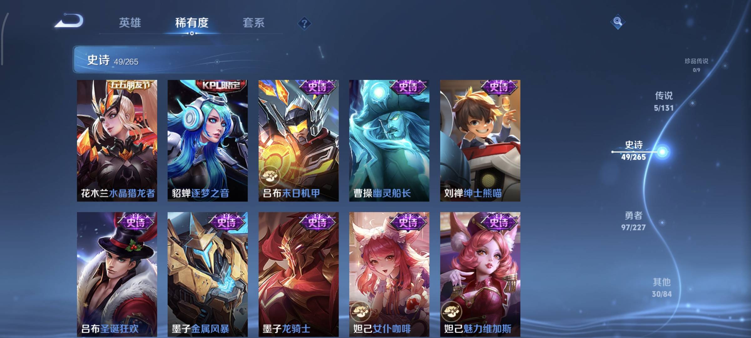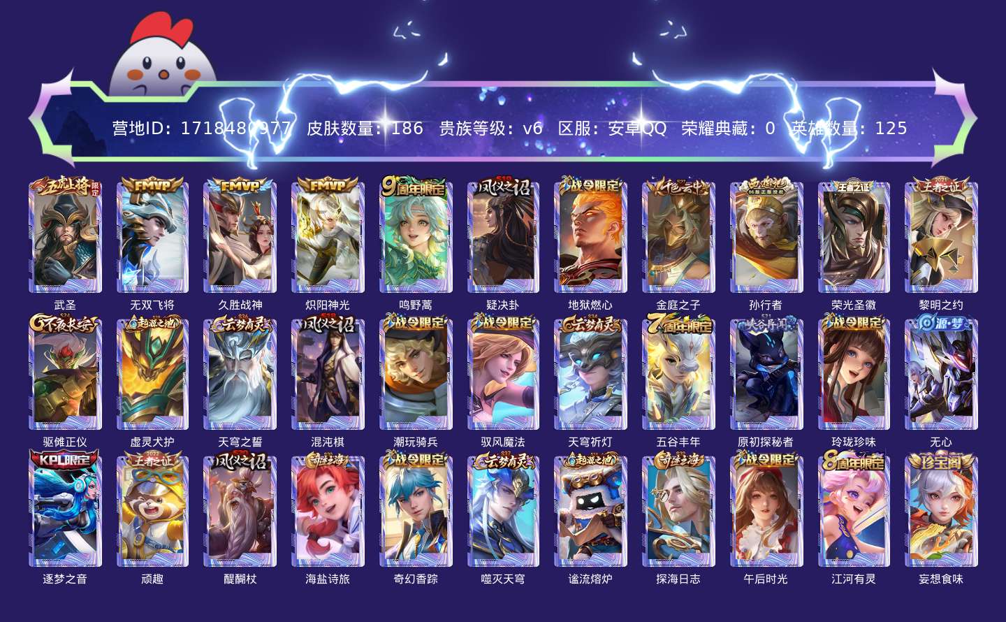 贵族等级:v6皮肤数:186传说品质5 英雄数:125