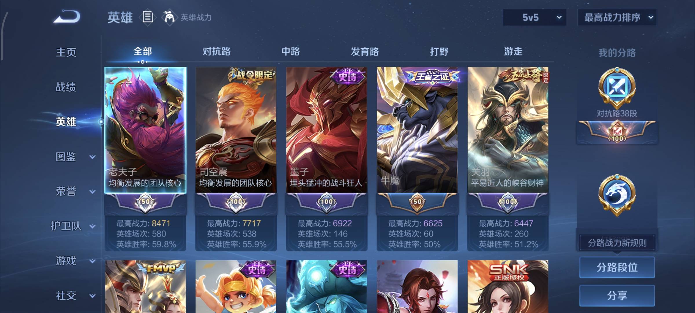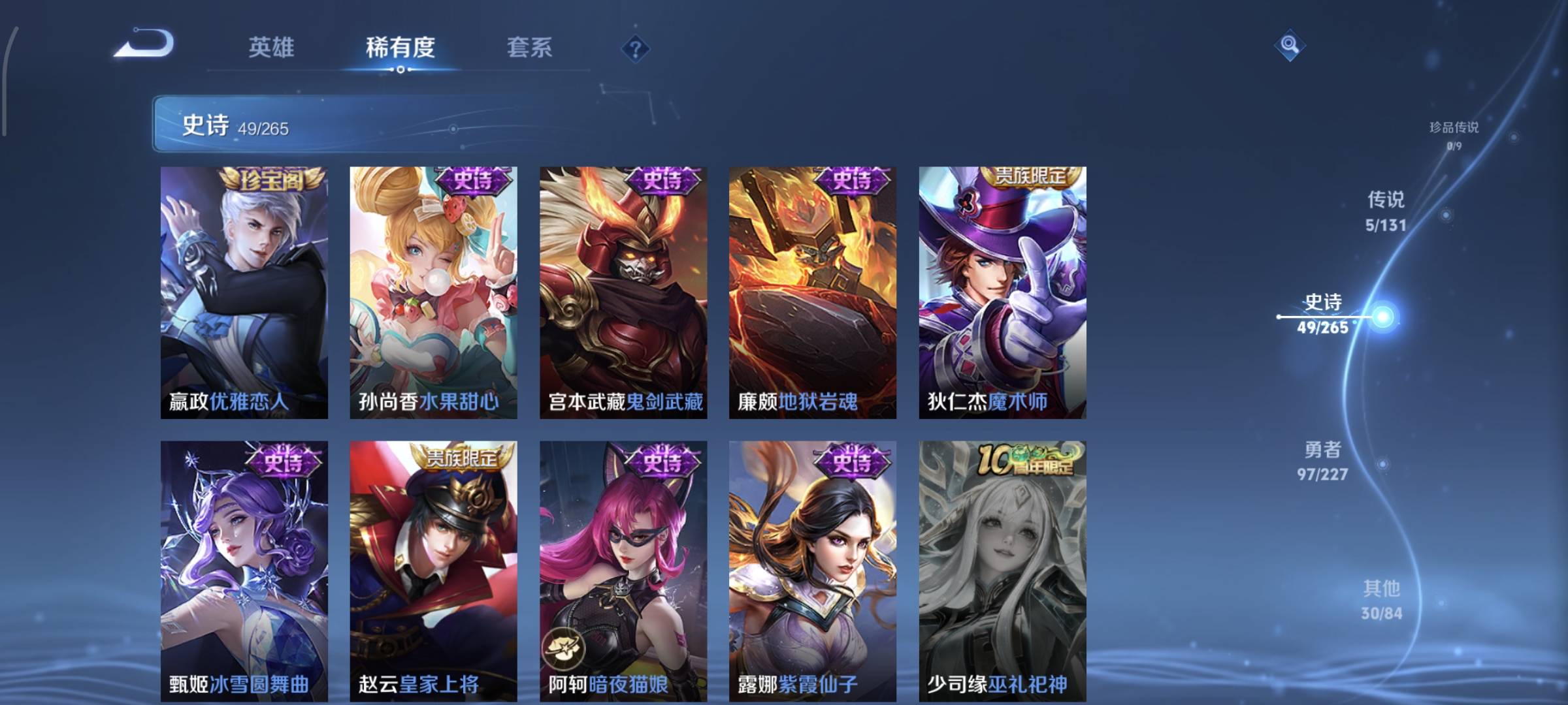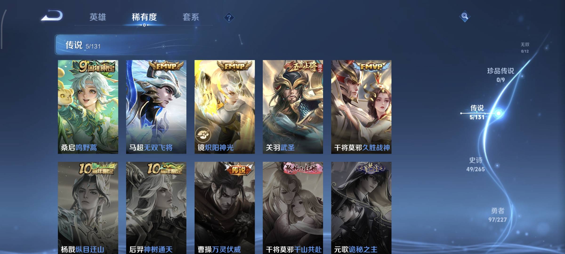 贵族等级:v6皮肤数:186传说品质5 英雄数:125