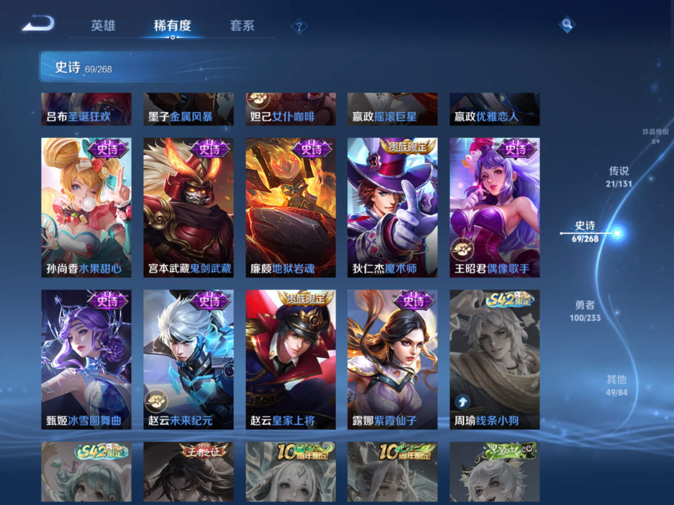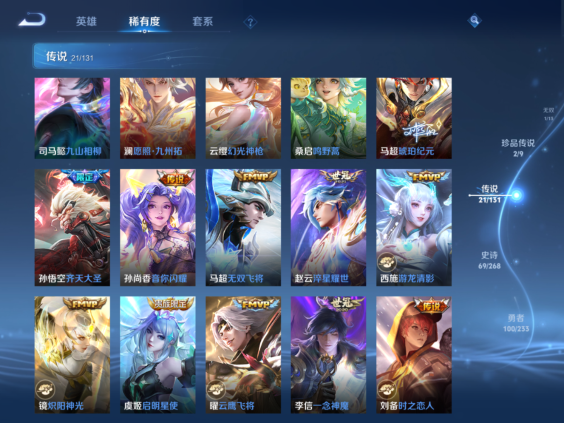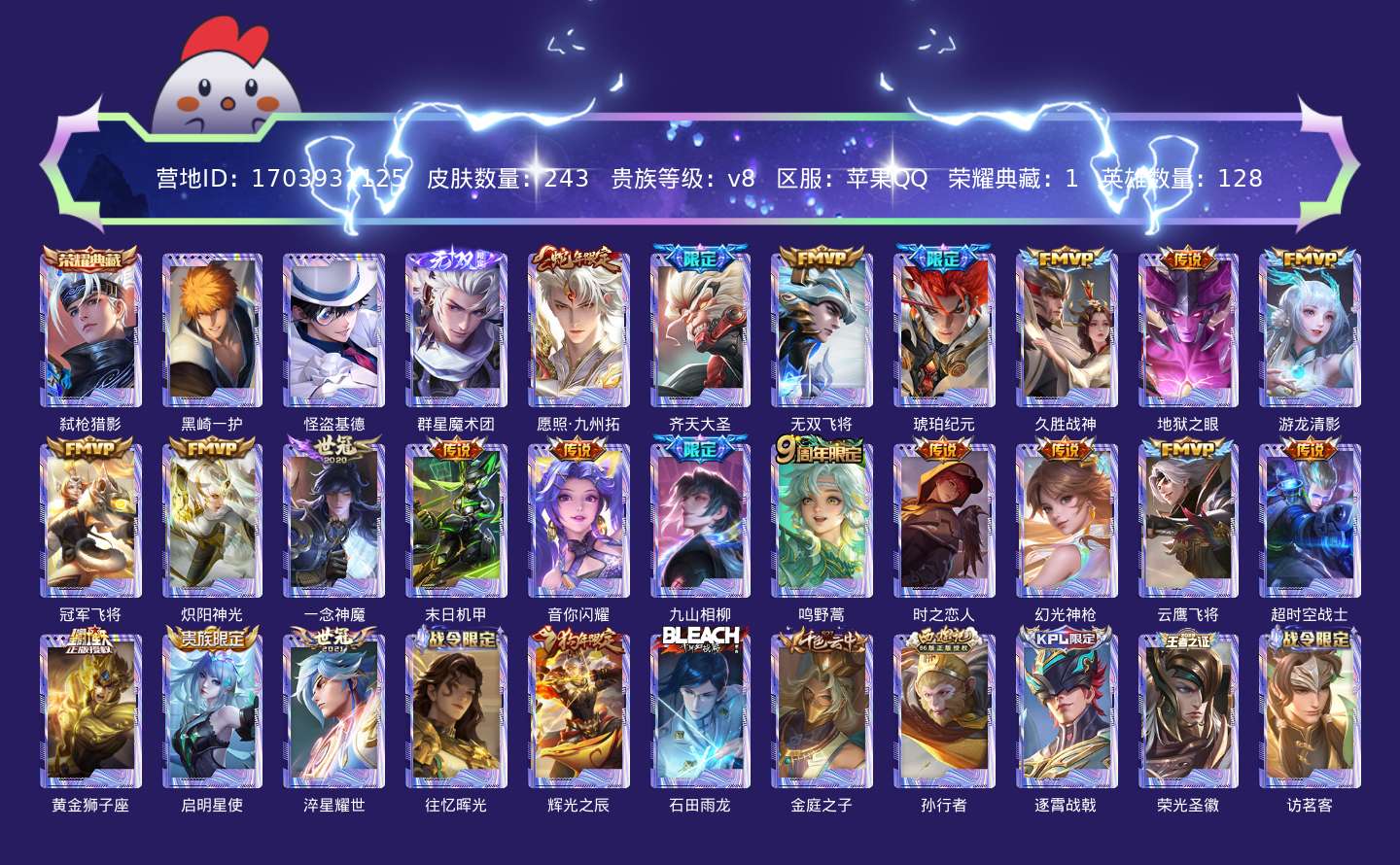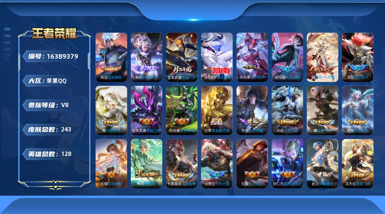 贵族等级:v8皮肤数:243生肖限定3 传说品质21 珍品传说2 无双1 荣耀典藏1 英雄数:128