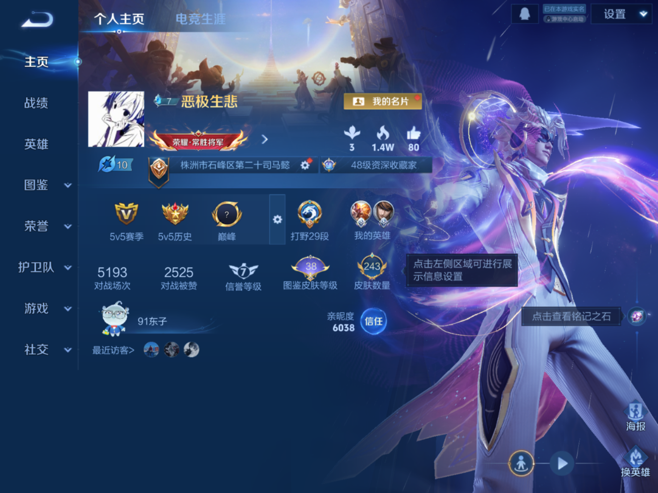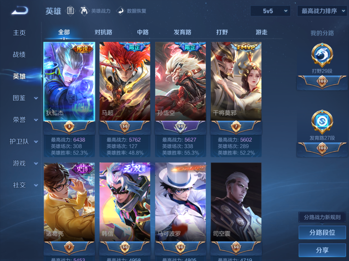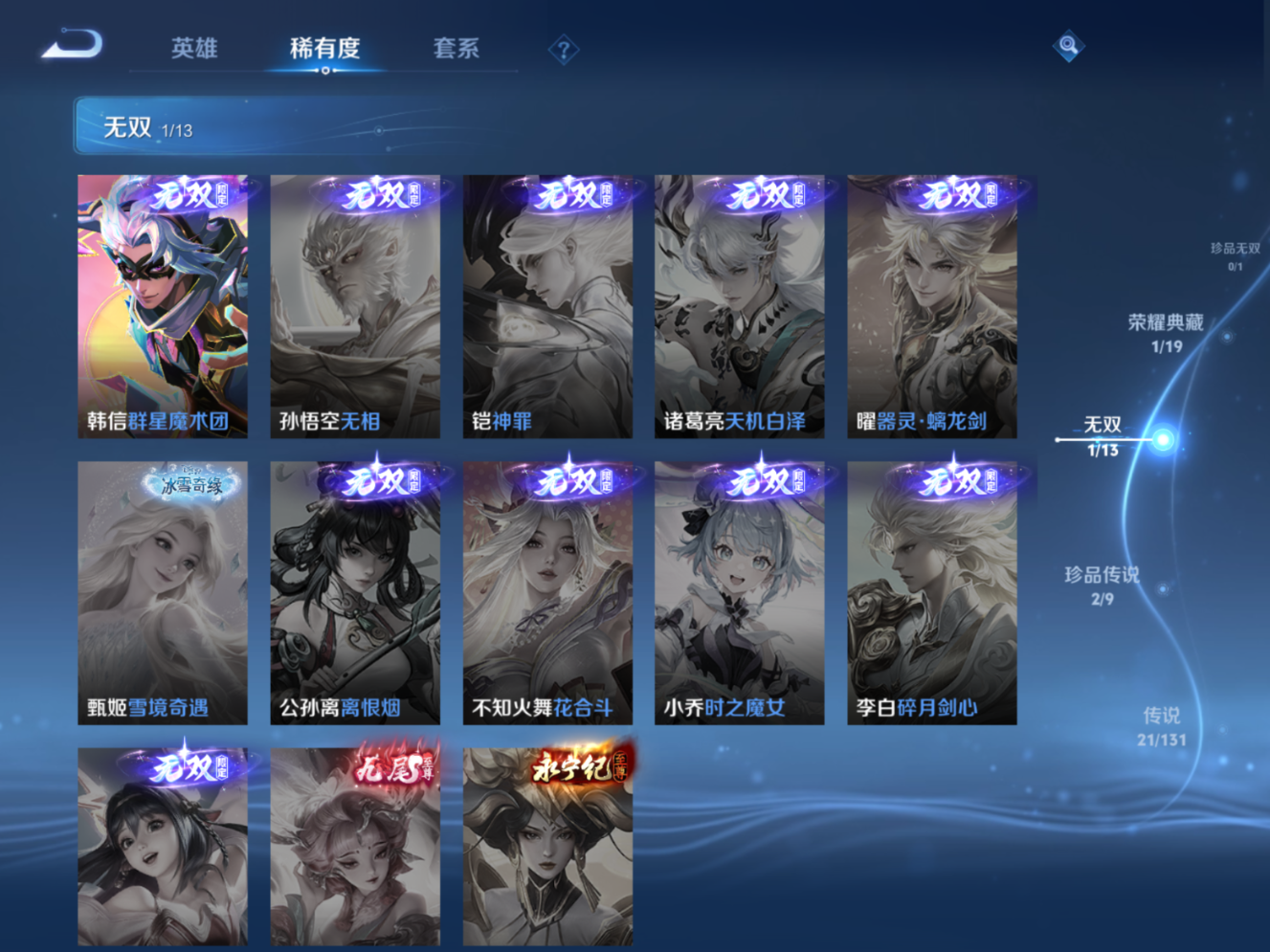 贵族等级:v8皮肤数:243生肖限定3 传说品质21 珍品传说2 无双1 荣耀典藏1 英雄数:128