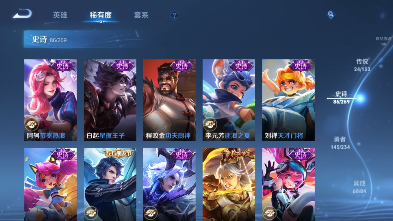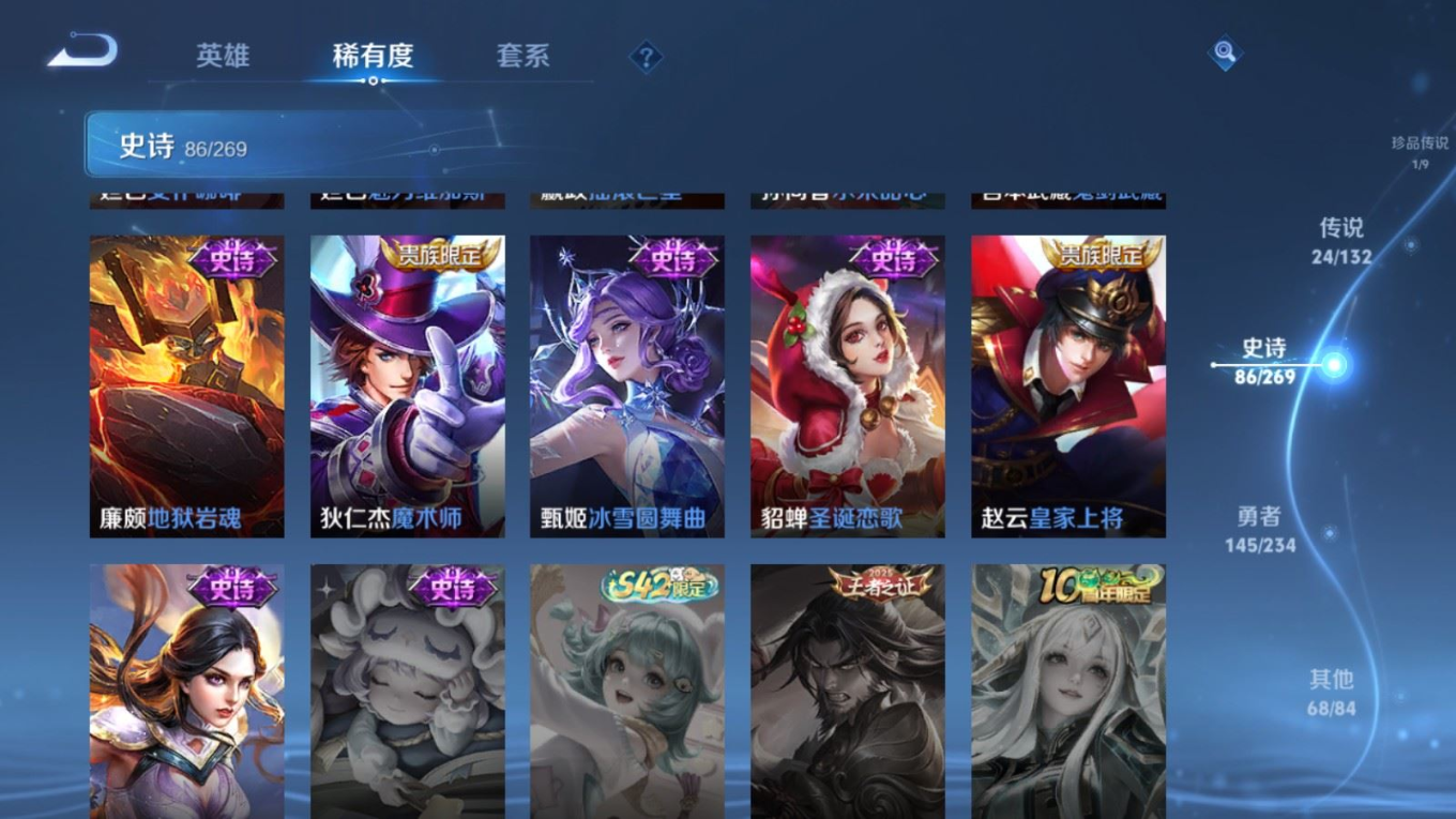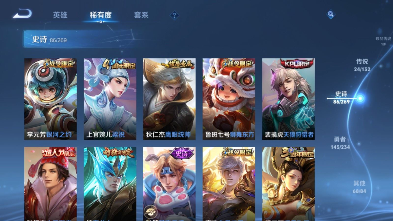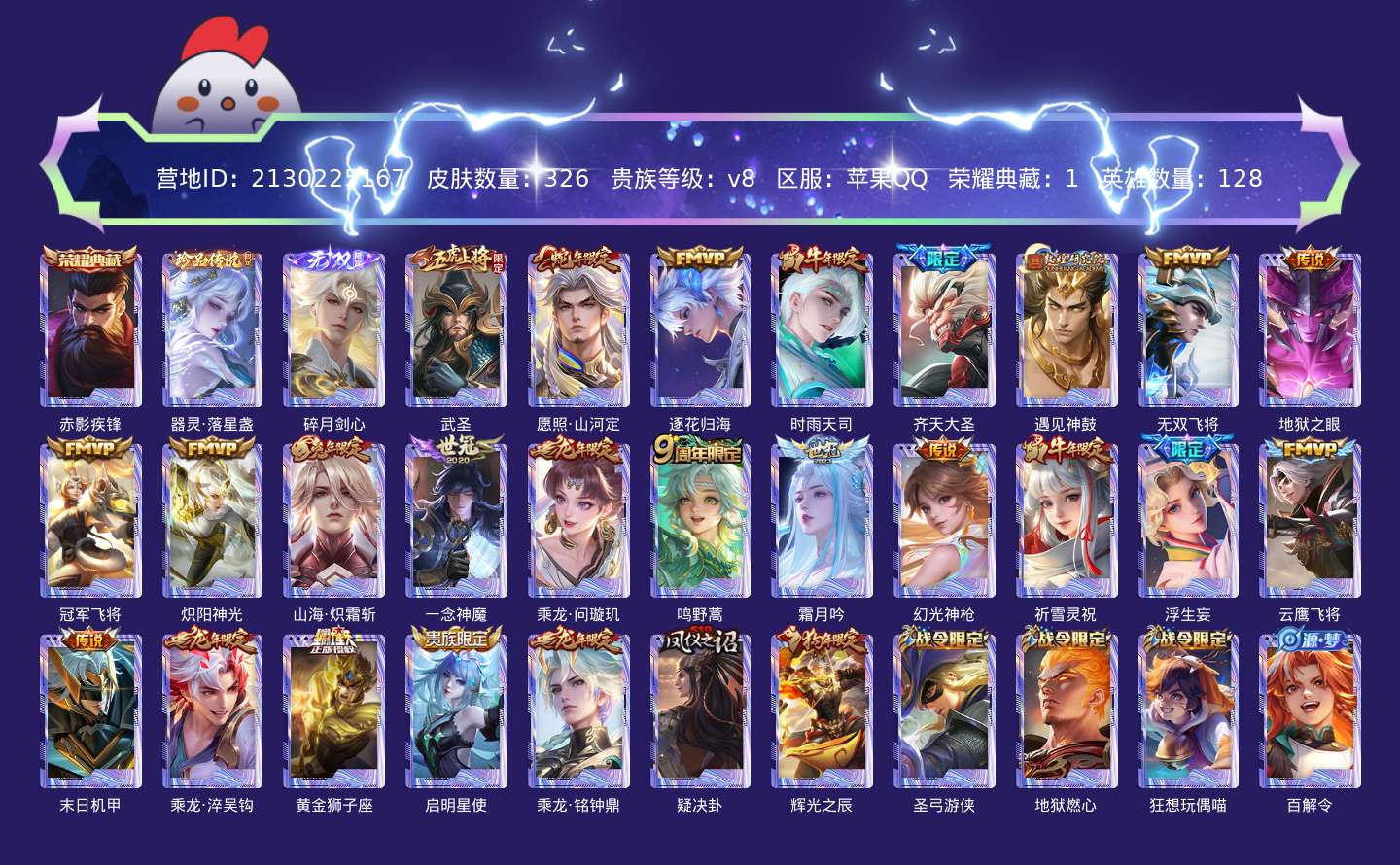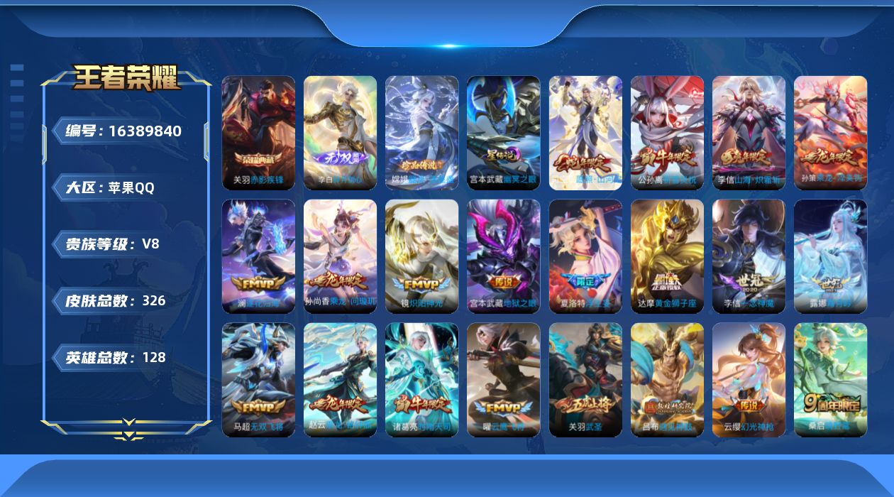 贵族等级:v8皮肤数:326生肖限定13 传说品质24 荣耀典藏1 情人节限定1 珍品传说1 无双1 英雄数:128