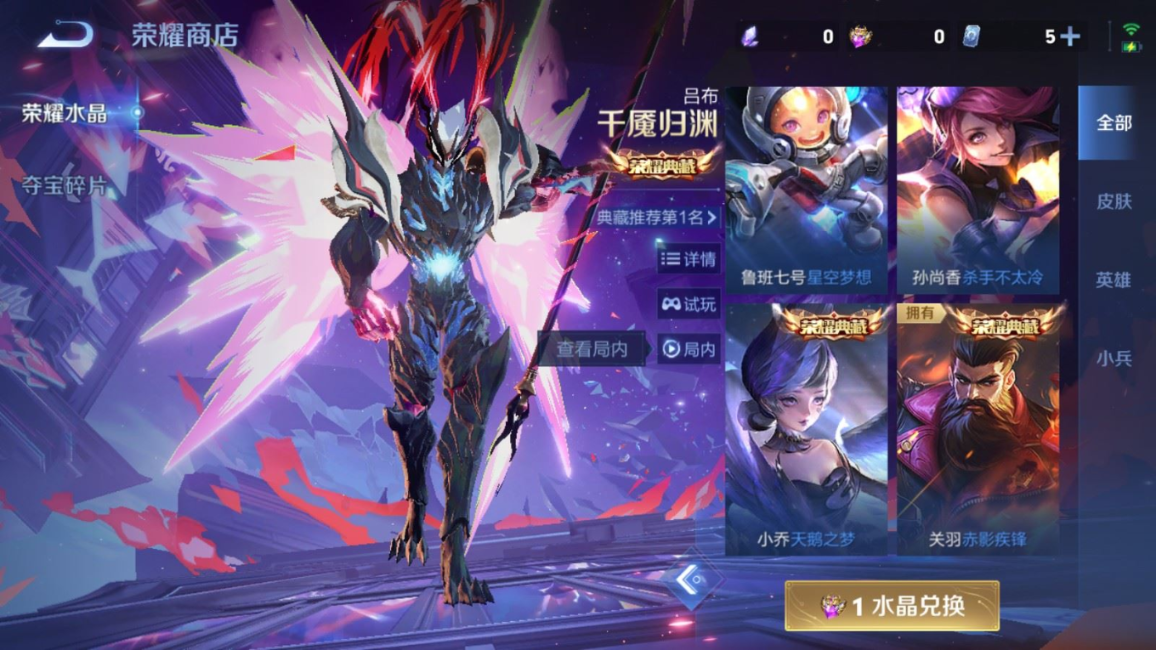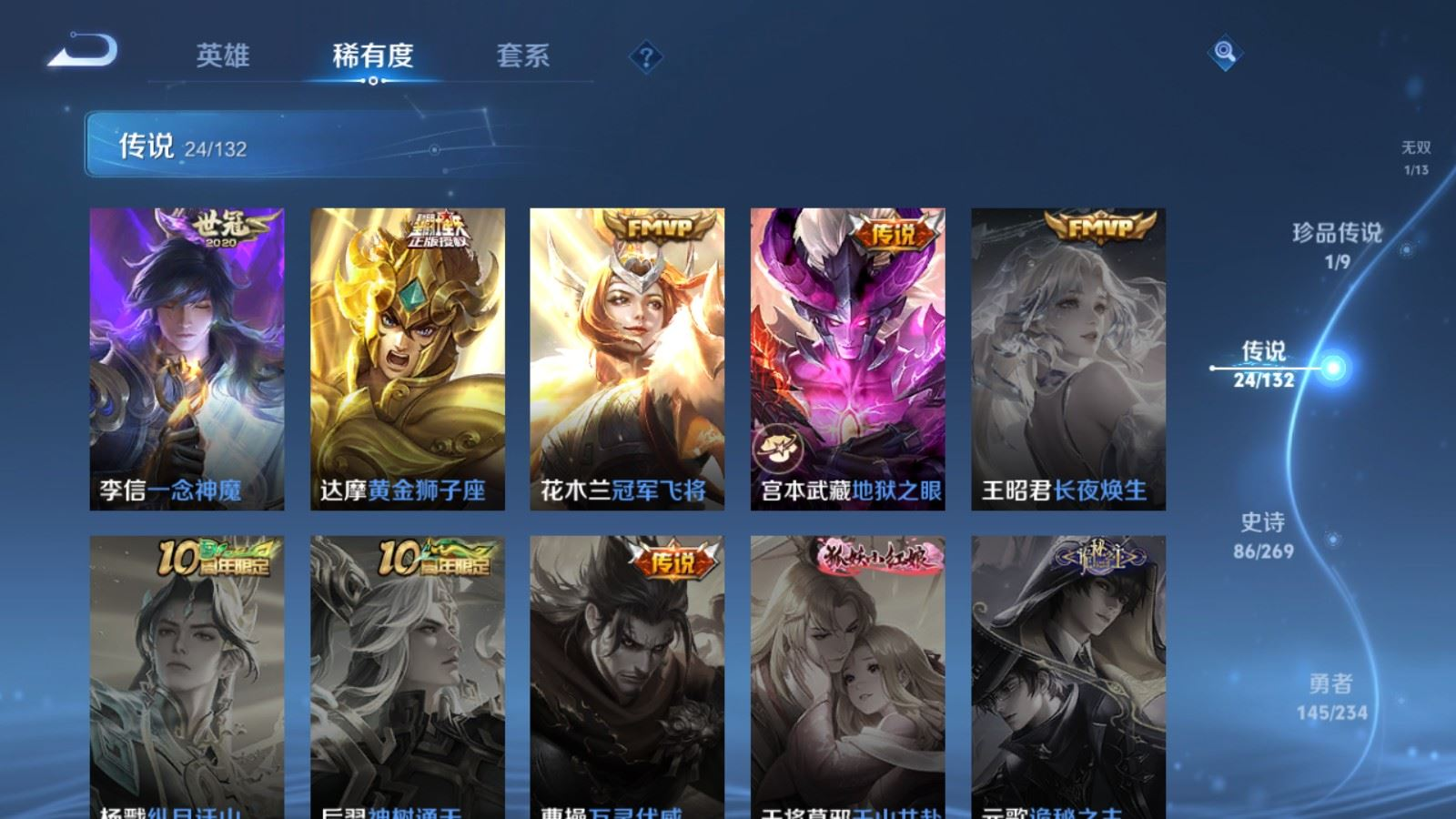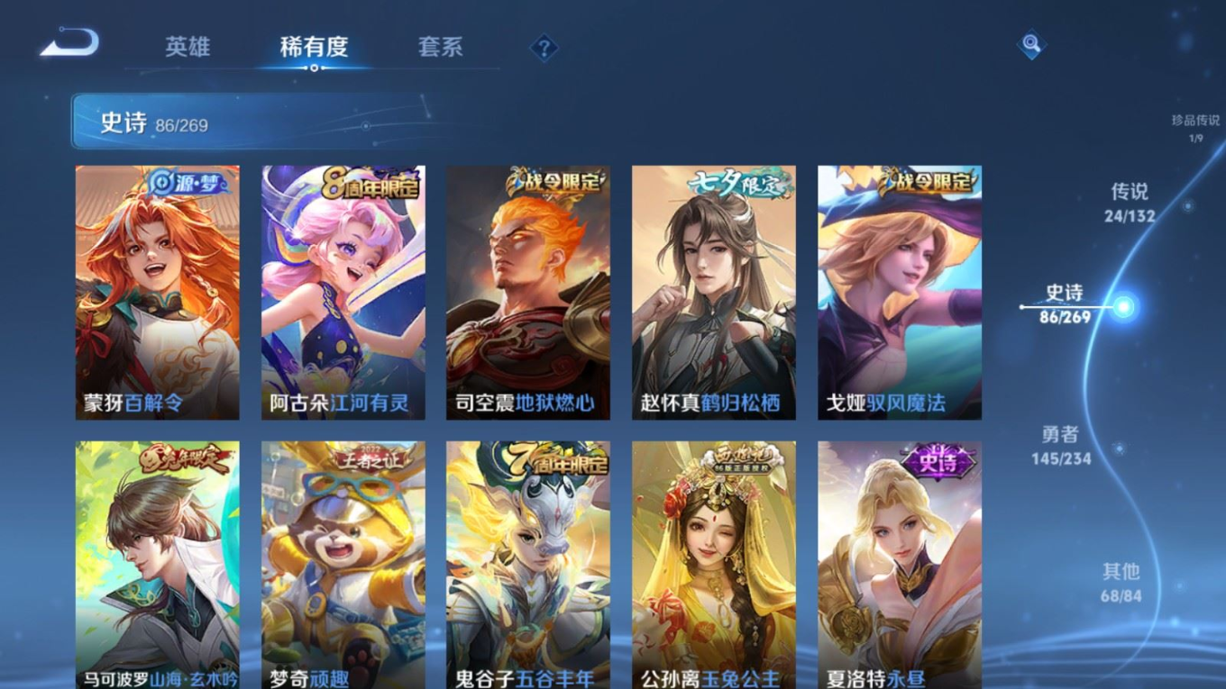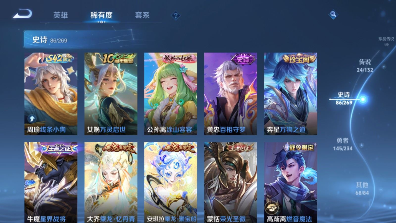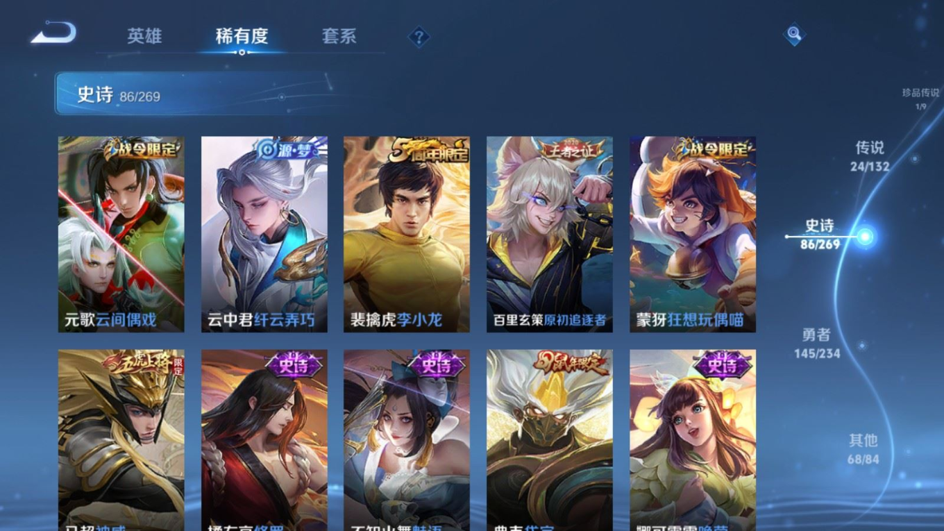 贵族等级:v8皮肤数:326生肖限定13 传说品质24 荣耀典藏1 情人节限定1 珍品传说1 无双1 英雄数:128