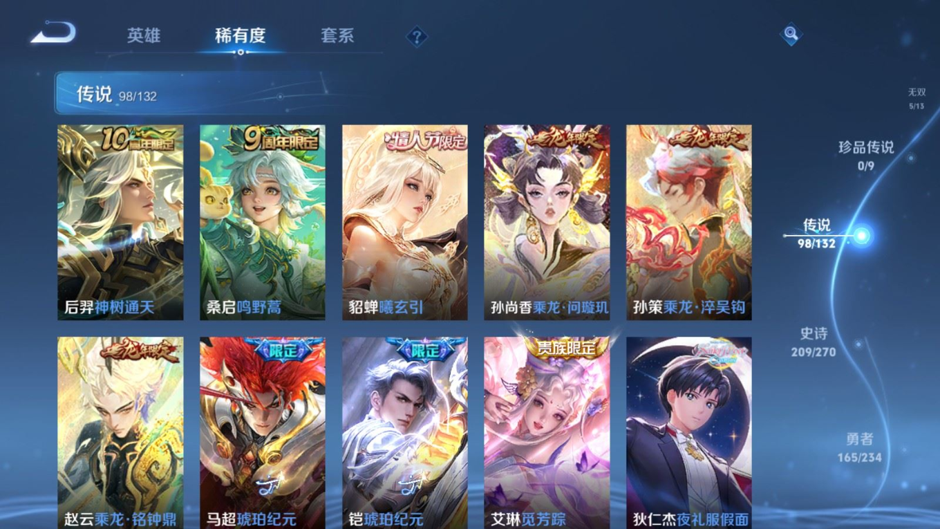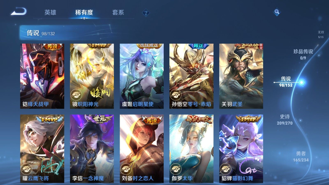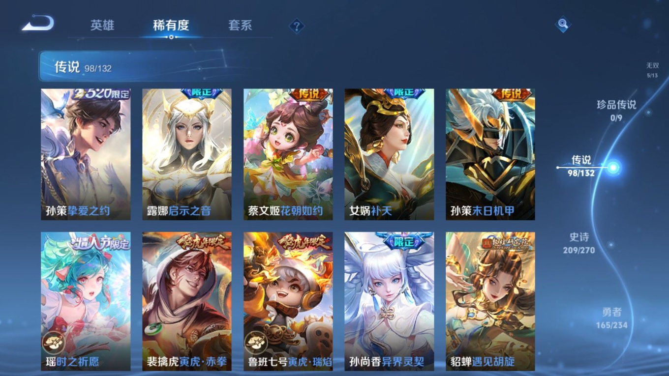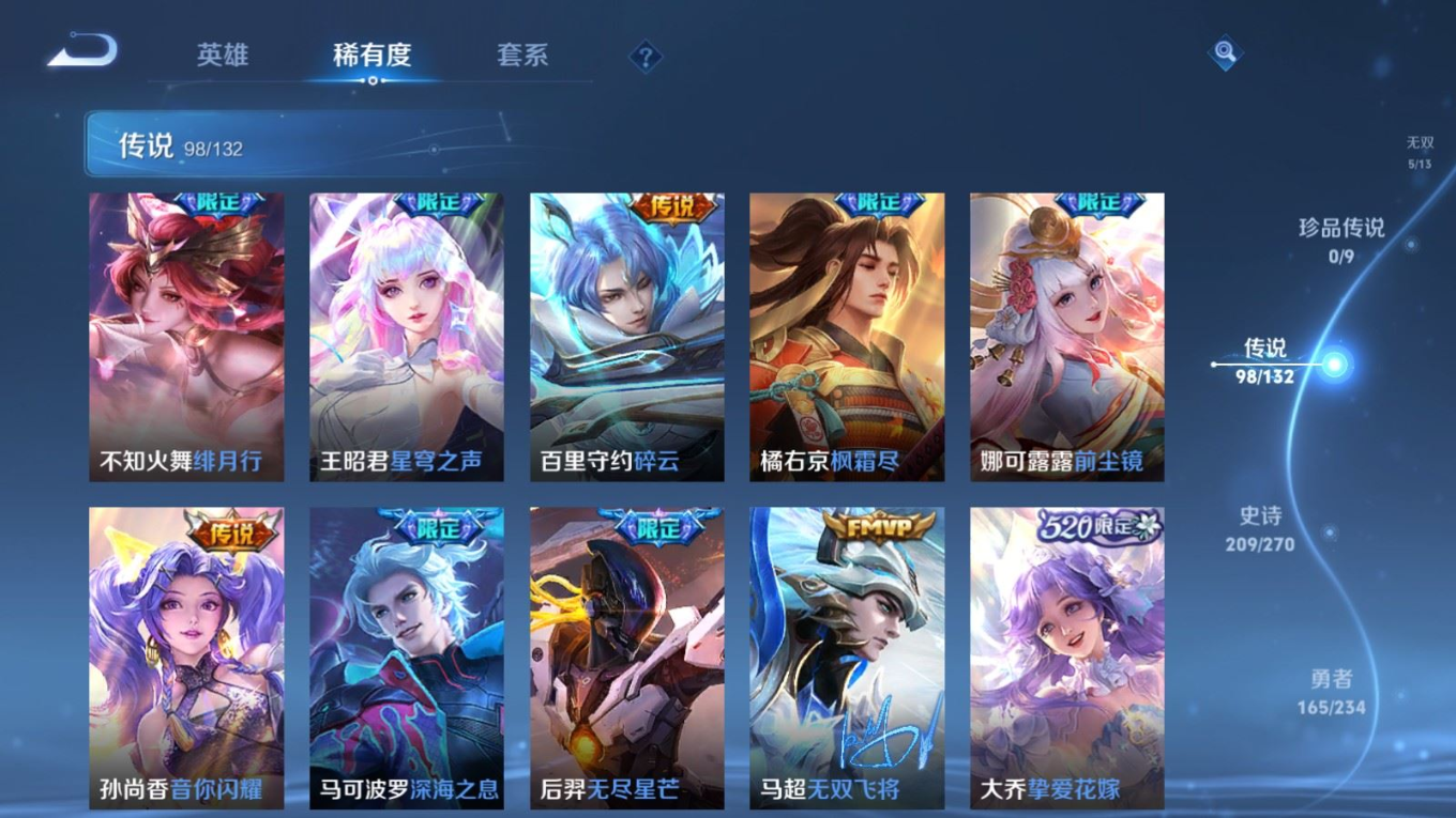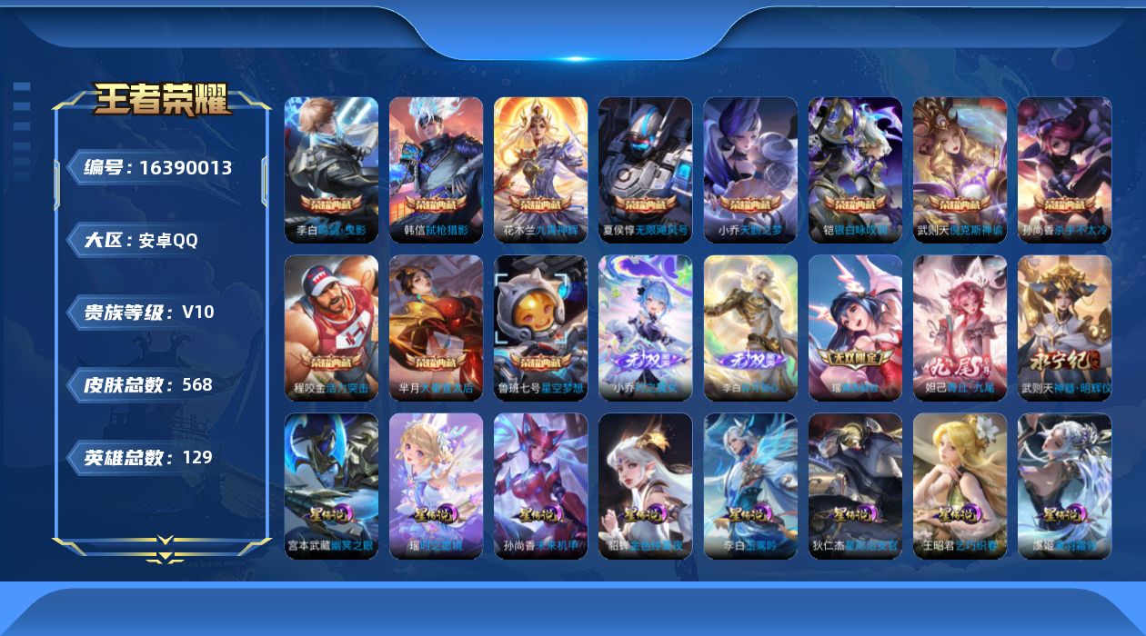 贵族等级:v10皮肤数:568生肖限定34 传说品质98 情人节限定15 荣耀典藏11 无双5 英雄数:129