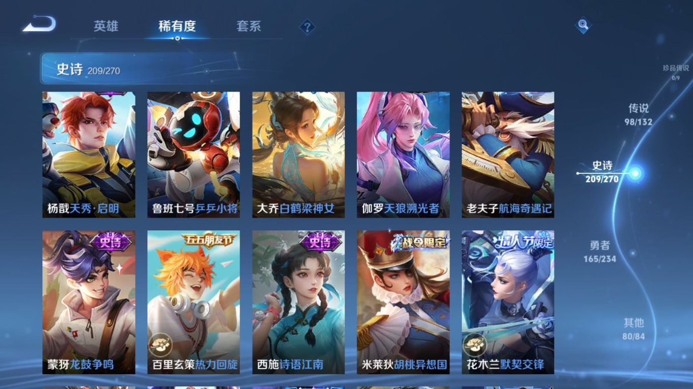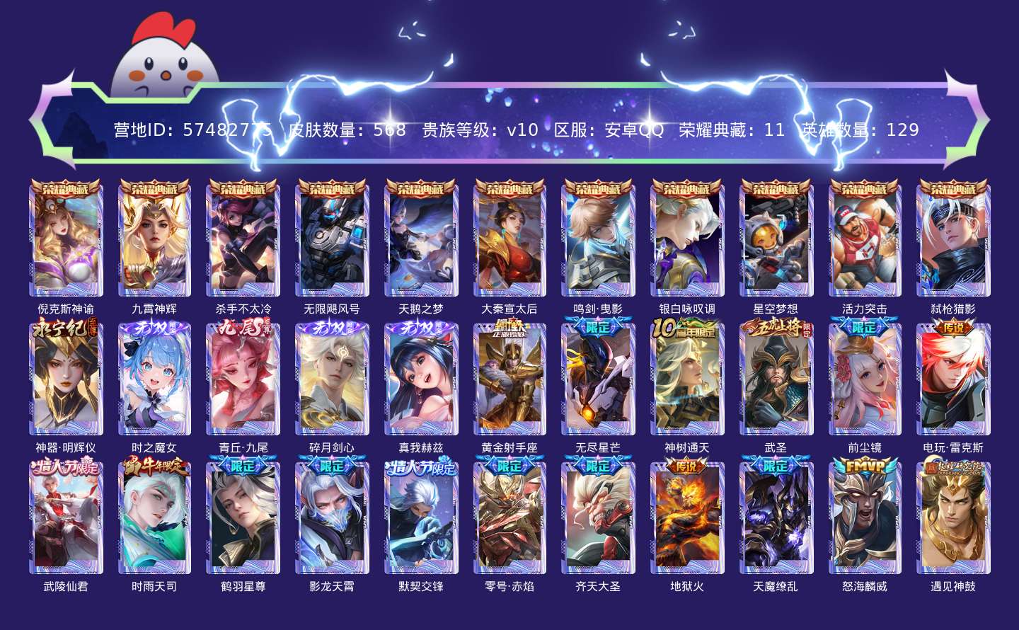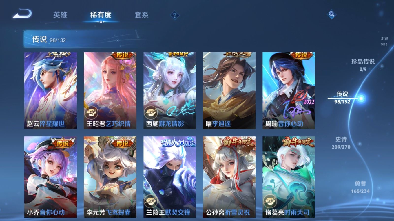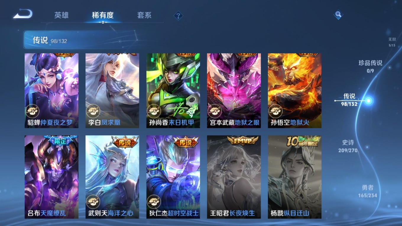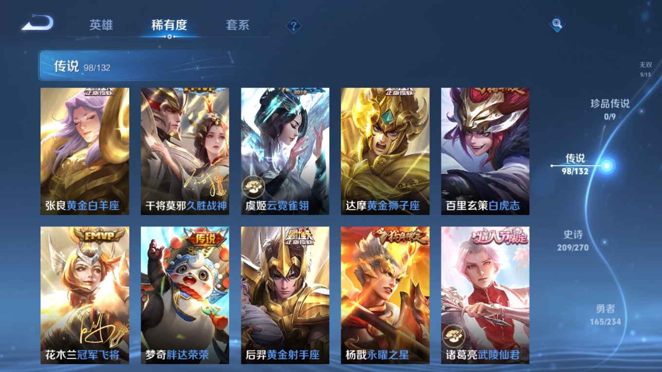贵族等级:v10皮肤数:568生肖限定34 传说品质98 情人节限定15 荣耀典藏11 无双5 英雄数:129
