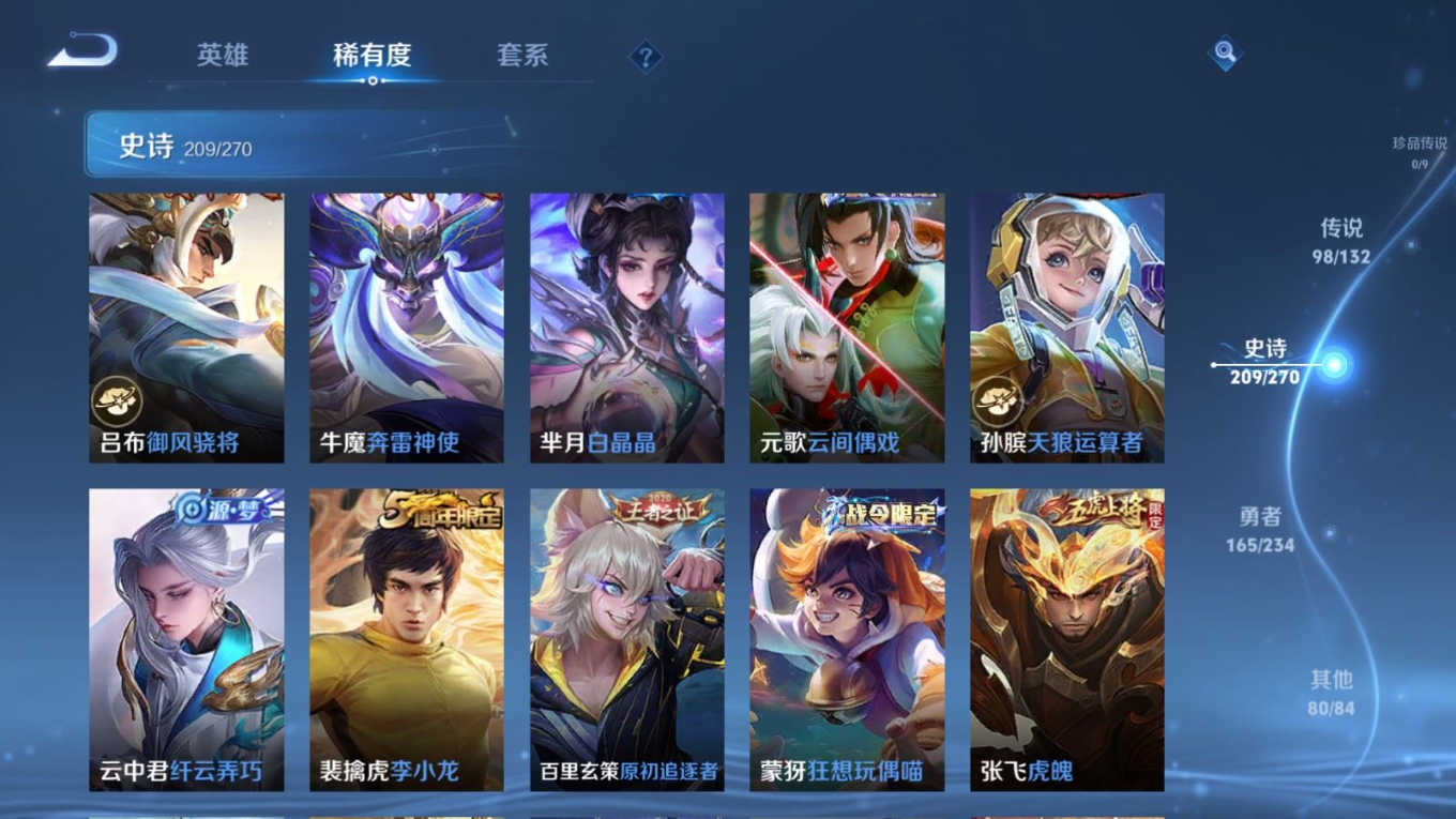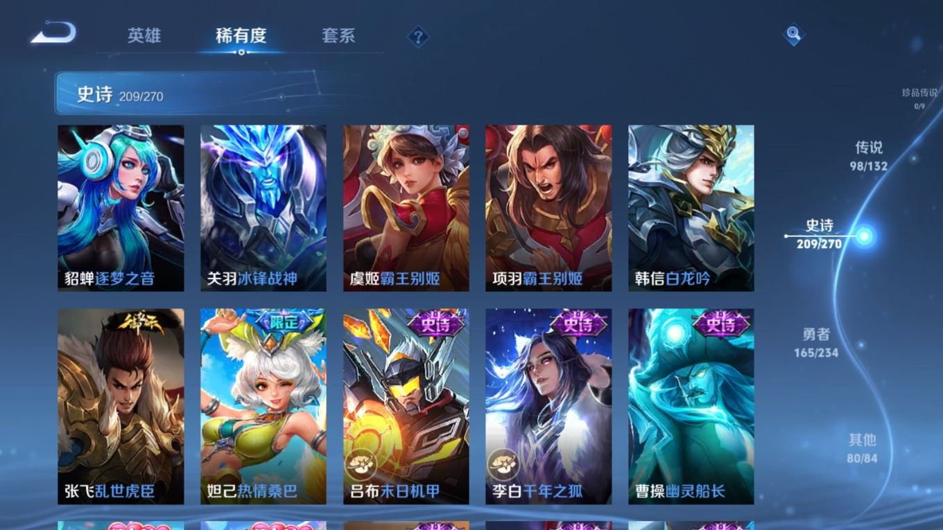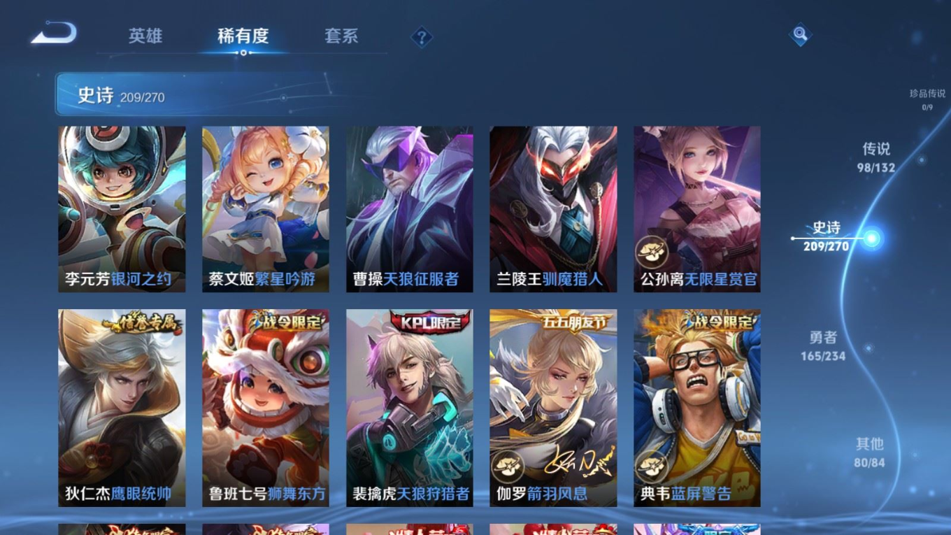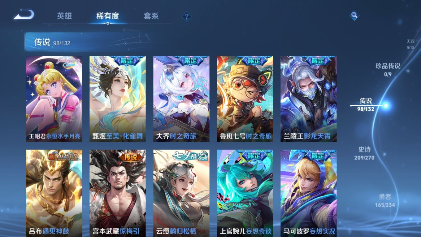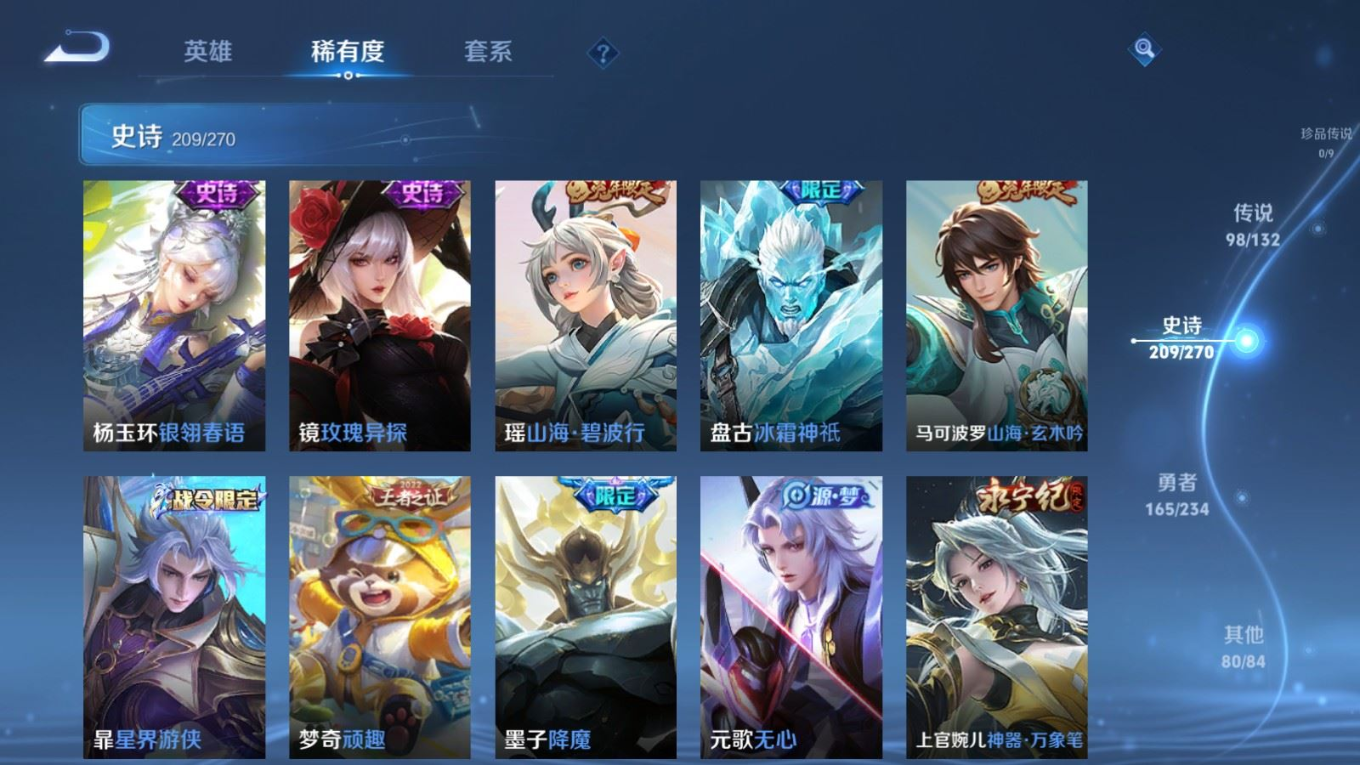 贵族等级:v10皮肤数:568生肖限定34 传说品质98 情人节限定15 荣耀典藏11 无双5 英雄数:129