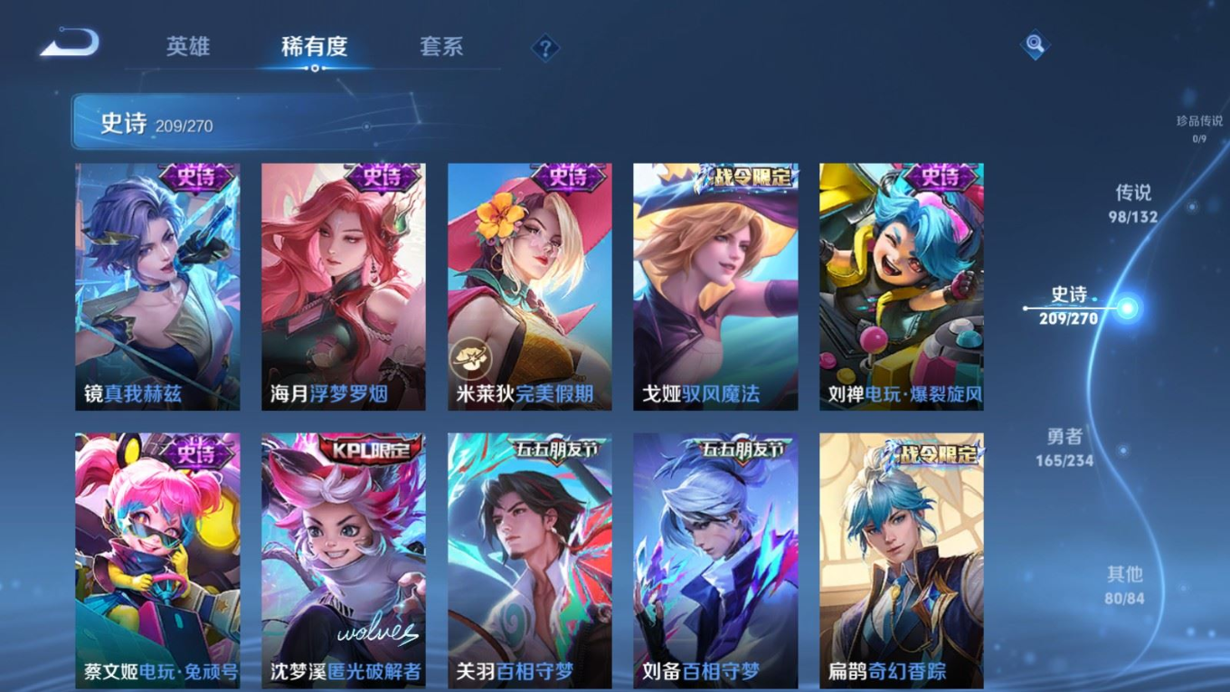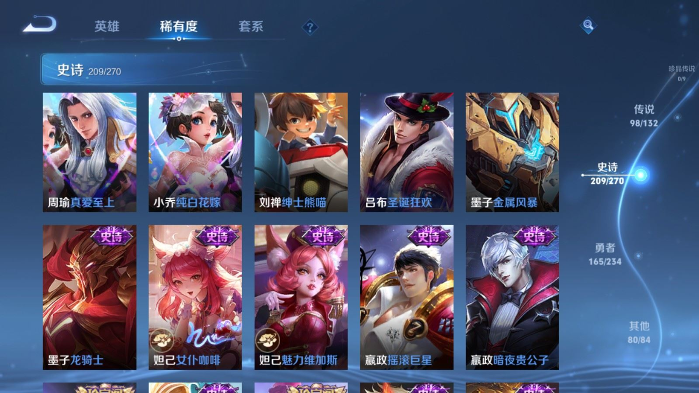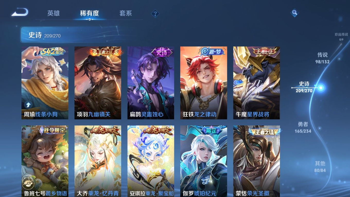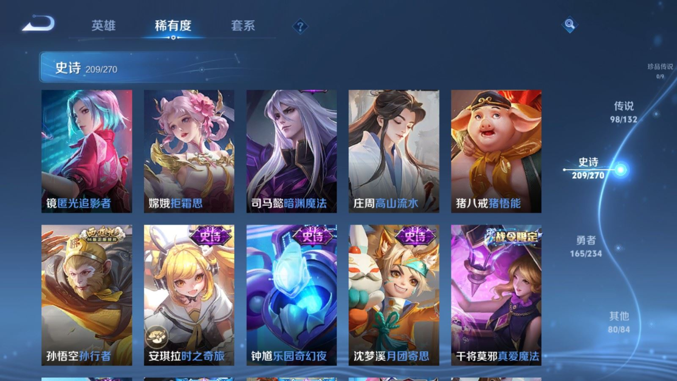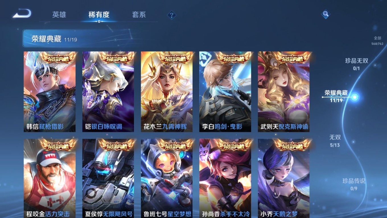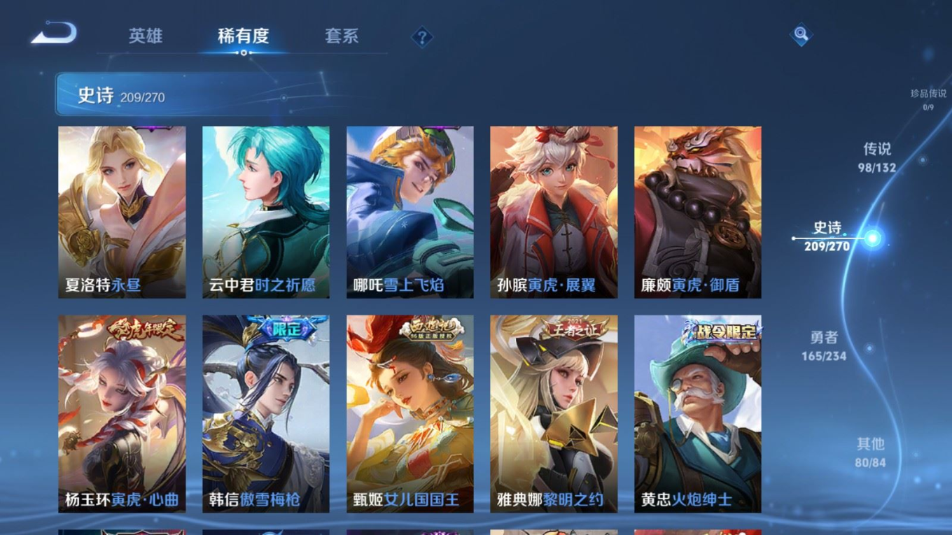 贵族等级:v10皮肤数:568生肖限定34 传说品质98 情人节限定15 荣耀典藏11 无双5 英雄数:129