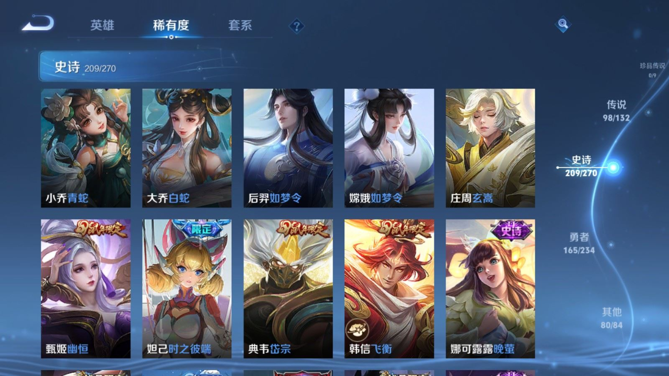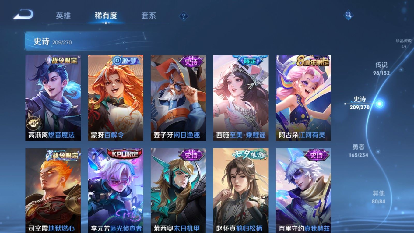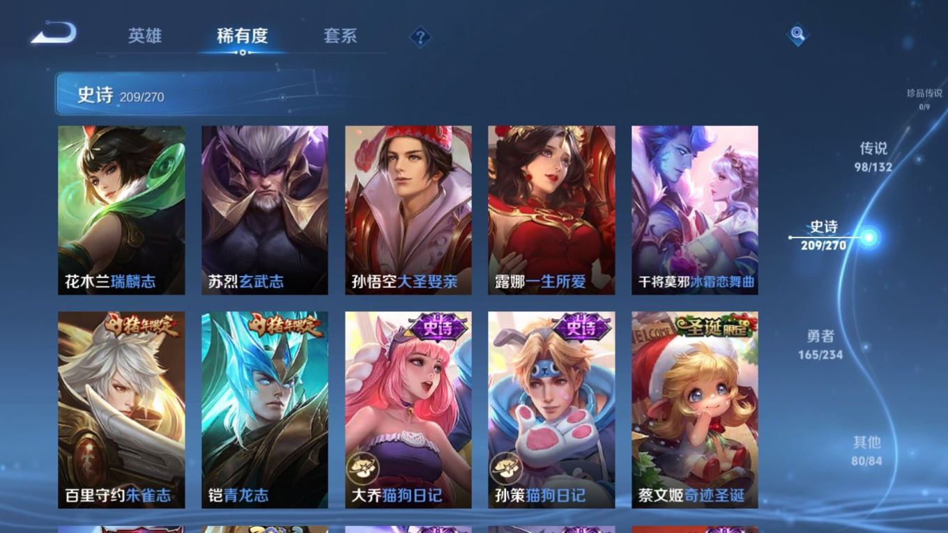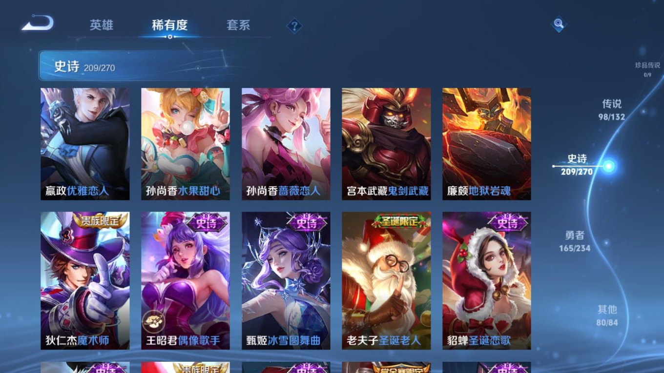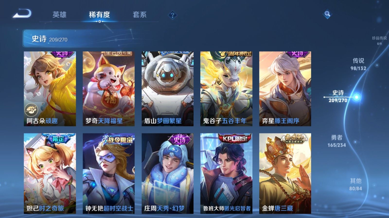 贵族等级:v10皮肤数:568生肖限定34 传说品质98 情人节限定15 荣耀典藏11 无双5 英雄数:129