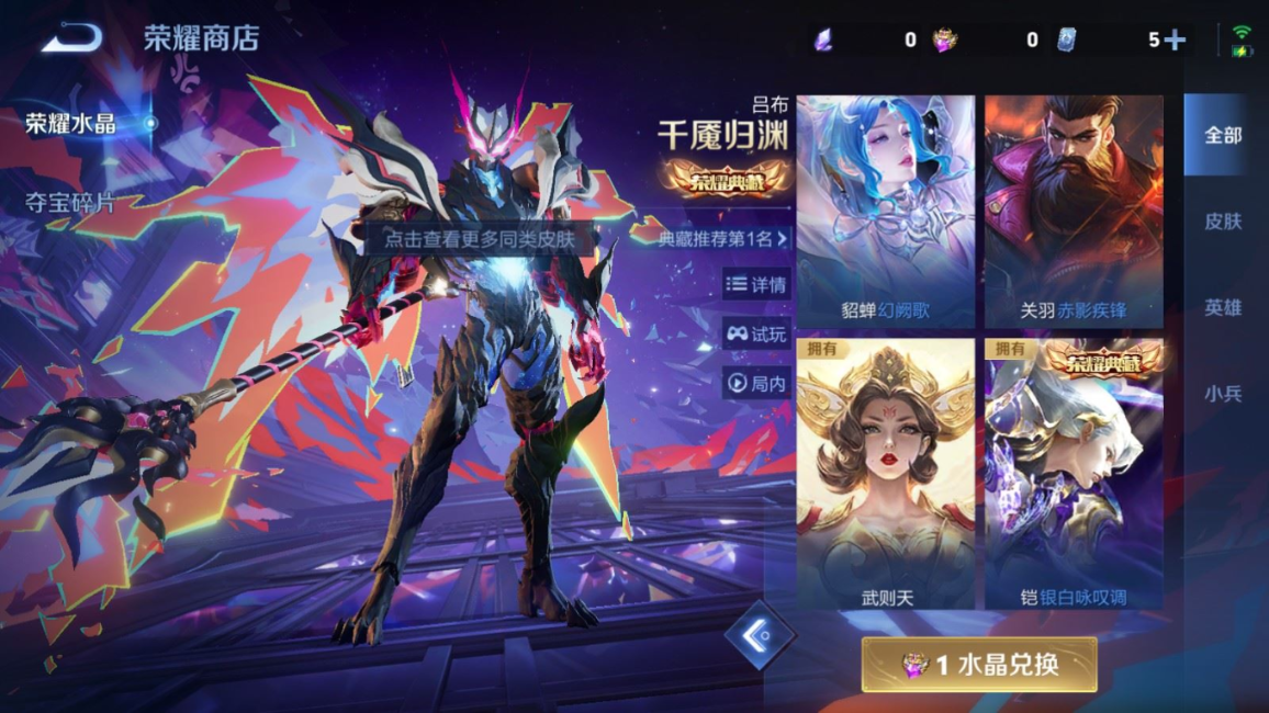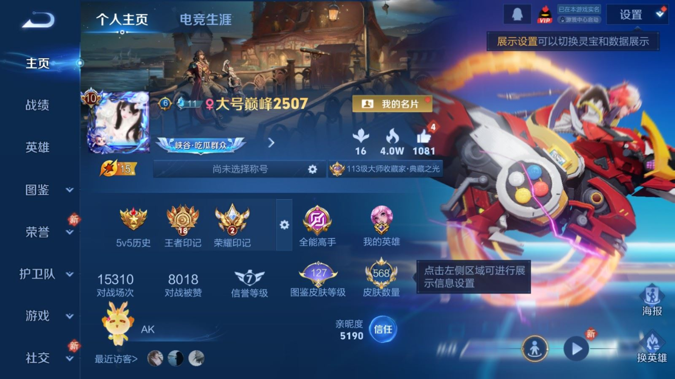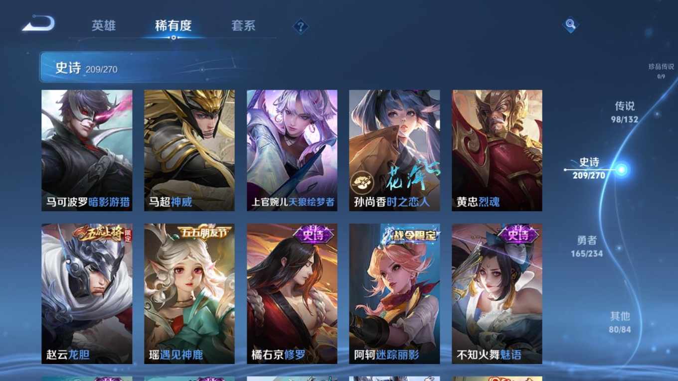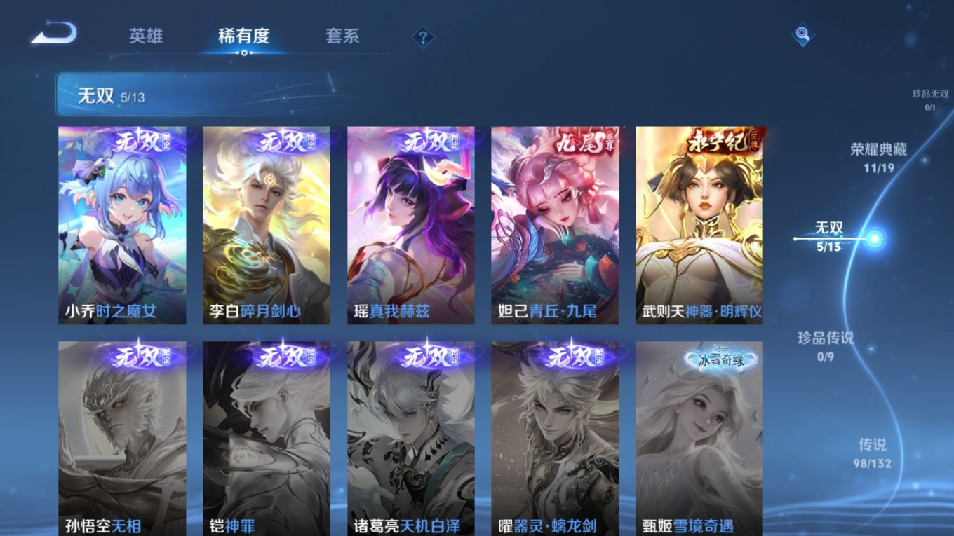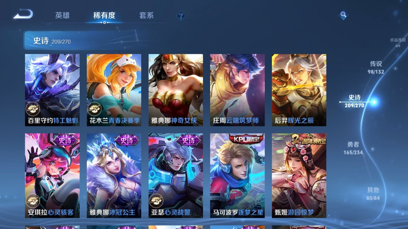 贵族等级:v10皮肤数:568生肖限定34 传说品质98 情人节限定15 荣耀典藏11 无双5 英雄数:129